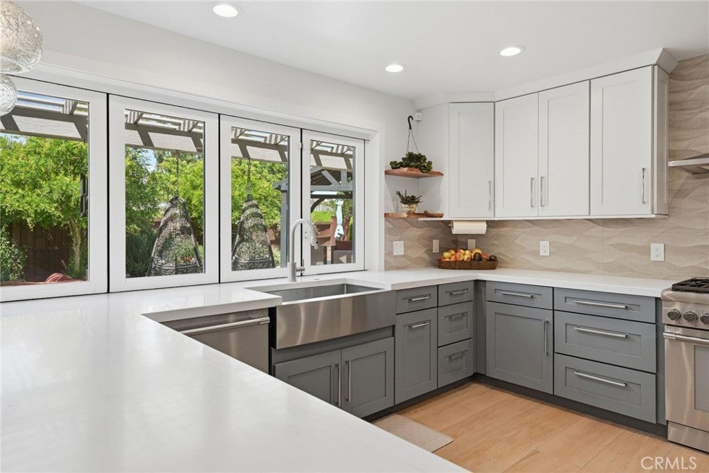 Fully reimagined luxury home in Oceanside with designer finishes, exceptional craftsmanship, and a rare layout ideal for modern and multigenerational living. This extensively renovated residence features two primary suites, a custom gourmet kitchen with premium Thermador appliances, panoramic opening kitchen windows, and dramatic wall-to-wall patio doors that create seamless indoor-outdoor flow.Imported Porcelanosa tile flooring runs throughout the home, complemented by custom California Closets, solid-core sound-insulated doors, and beautifully designed spa-inspired bathrooms with Toto tankless toilets. Every detail reflects quality, comfort, and intentional design.The flexible floor plan is perfect for extended family, guests, or an adult child, offering privacy without compromise. Additional highlights include a fully owned solar system, EV charging station, and 16 fruit trees creating a peaceful and abundant outdoor setting.A rare turnkey property that blends luxury, function, and lifestyle in one of Oceanside’s most desirable settings.