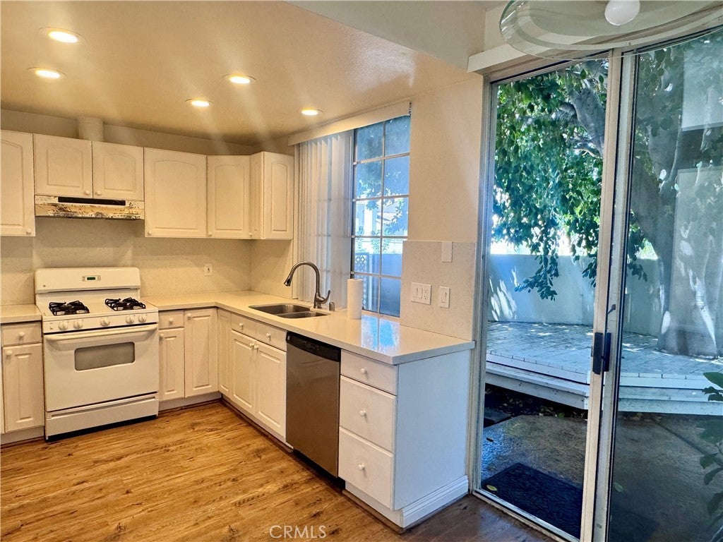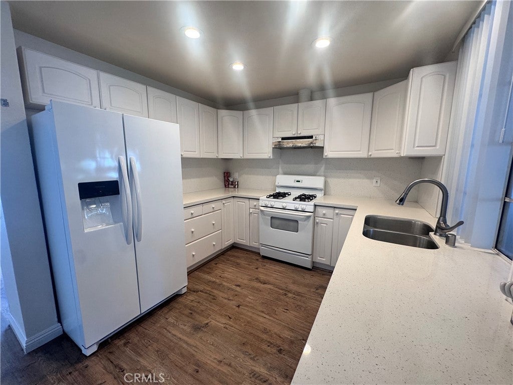 Fantastic end Unit single story town home in the great area of West Park. Two Car attached Garage, laminated wood floors, Living room with Fireplace. large private patio in the back. Spacious Kitchen with white cabinets and quartz counter tops and a new refrigerator, high ceiling, large main bedroom with sliding door opens to the backyard. Large 2nd bedroom and a full bath. Freshly painted. Ready to move in. Indoor washer and dryer inside the closet included.
