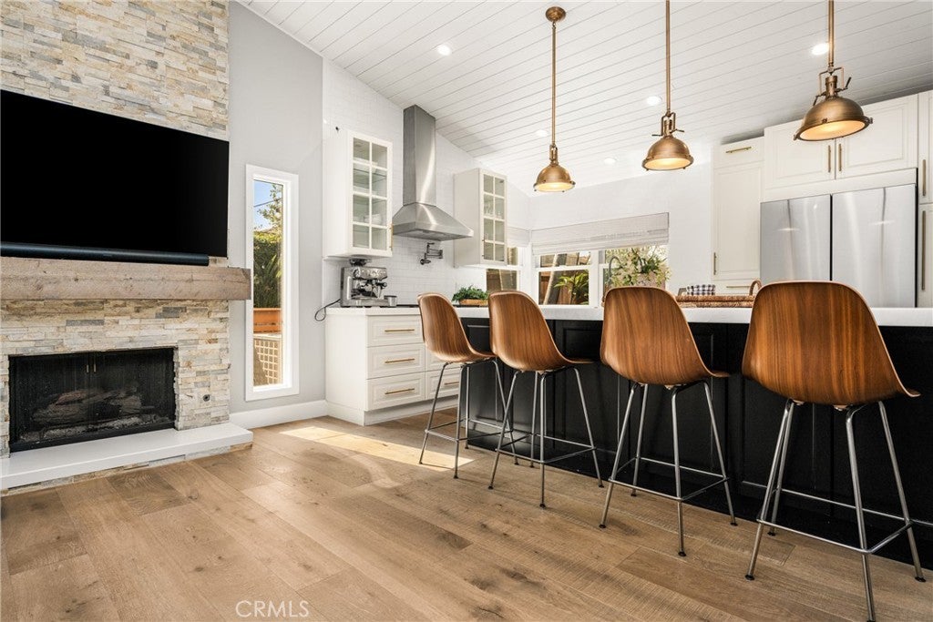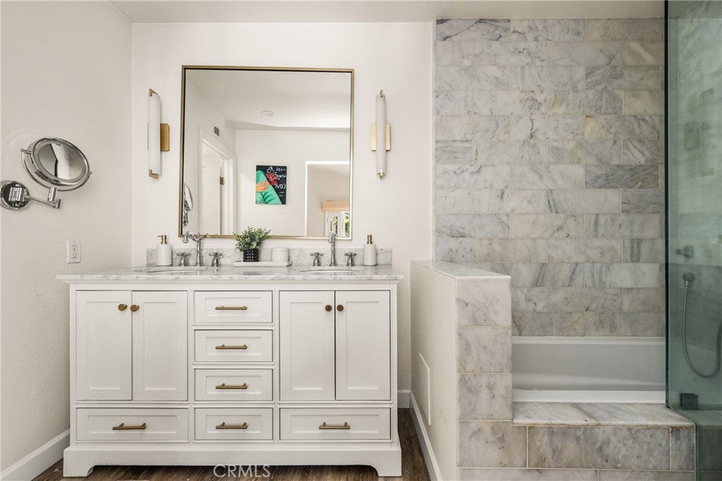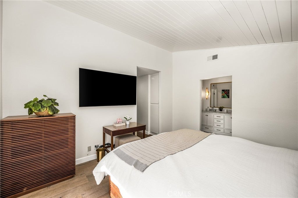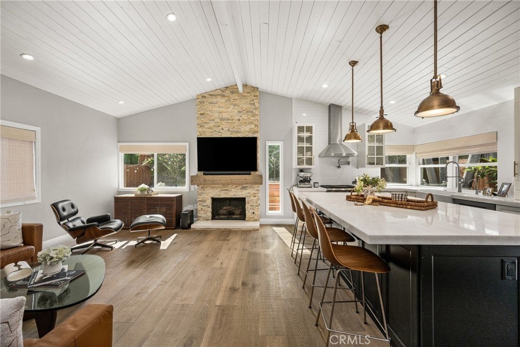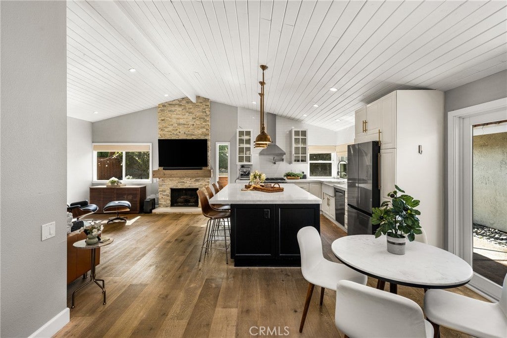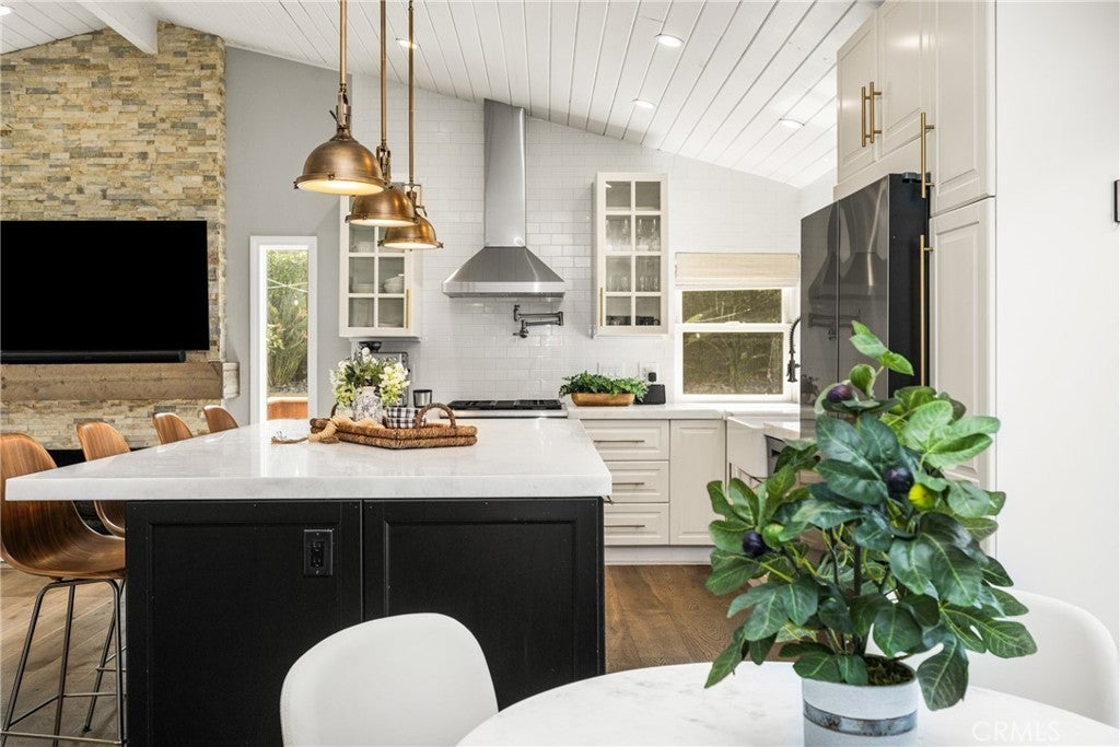 Welcome to 10 Petersburg, a highly upgraded SINGLE-STORY home in Irvine’s Northwood neighborhood offering 3 bedrooms, 2 bathrooms, and approximately 1,370 square feet of well-designed living space. A charming Dutch entry door creates a warm first impression, and the direct-access 2-car garage with driveway adds everyday convenience. Ideally located near Northwood Park and the community pool, this home combines comfort, function, and location. Inside, the home feels open and easy, with vaulted ceilings, engineered hardwood flooring, recessed lighting, and a layout that flows naturally from room to room. The remodeled kitchen is a true focal point, featuring a large quartz island with seating, white cabinetry, brass hardware, stainless steel appliances, a farmhouse sink, and pendant lighting. There’s plenty of counter space, along with a statement vent hood and glass-front upper cabinets that give the space a clean, updated look without feeling overdone. The kitchen opens directly to the dining and living areas, making it ideal for both everyday living and entertaining and the living room is anchored by a stone fireplace with a wood mantel and mounted TV. Large windows and French doors bring in natural light and connect the interior to the backyard. Outside, the backyard offers a great mix of lawn, patio areas, and mature landscaping. String lighting adds a nice touch in the evenings, and there’s space to relax, entertain, or just enjoy some privacy. The side yard areas add flexibility and make the lot feel more usable overall. The primary suite is set toward the back of the home and feels bright and private, with vaulted ceilings, a stunning organized walk-in closet and direct access to the yard. The ensuite bath includes dual sinks, marble-look counters, a walk-in shower, and a soaking tub. Secondary bedrooms are well-sized and flexible, whether for guests, family, or a home office. The hall bath with a walk-in shower has also been updated with clean finishes and a modern vanity. Highly upgraded throughout, with a functional single-level layout and a location in one of Irvine’s most established neighborhoods, this is a home that’s easy to move into and enjoy right away.