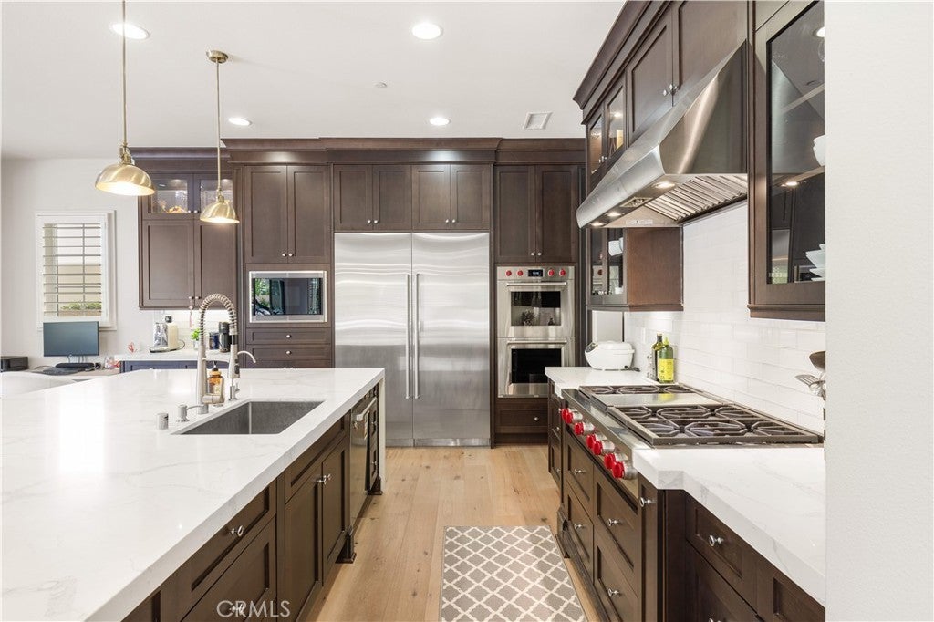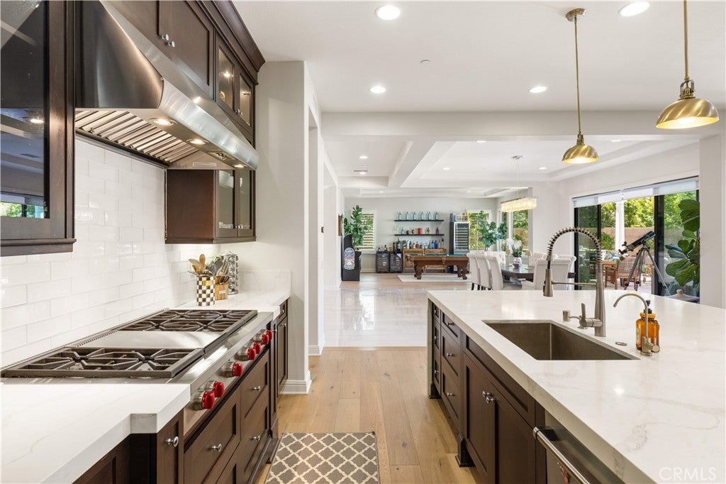 - AppliancesSixBurnerStove, Built-In Range, Double Oven, Dishwasher, Gas Cooktop, Disposal, Gas Oven, Gas Range, Gas Water Heater, Microwave, Refrigerator, Range Hood