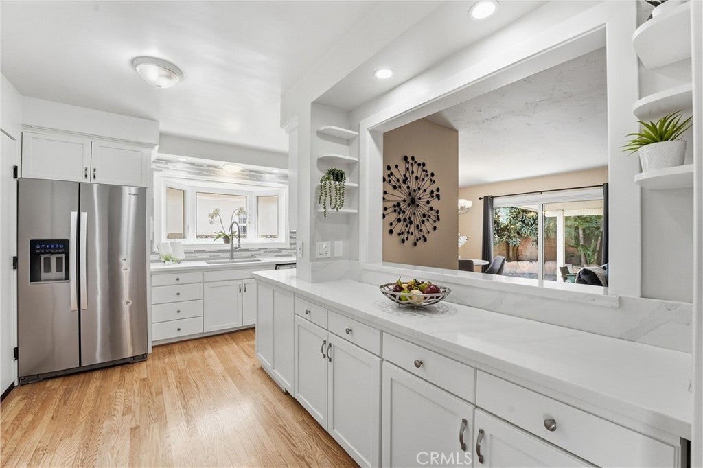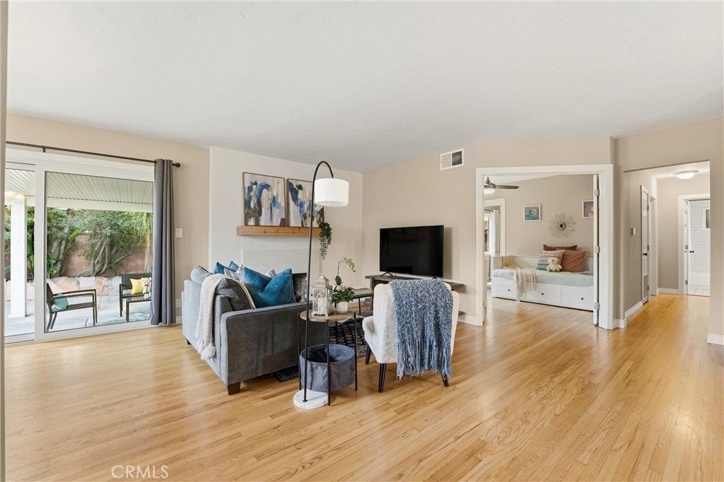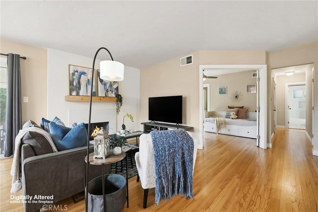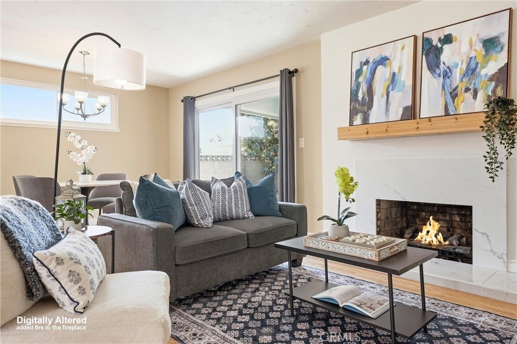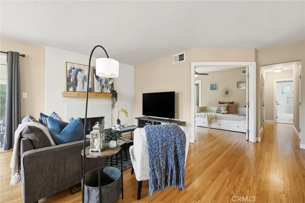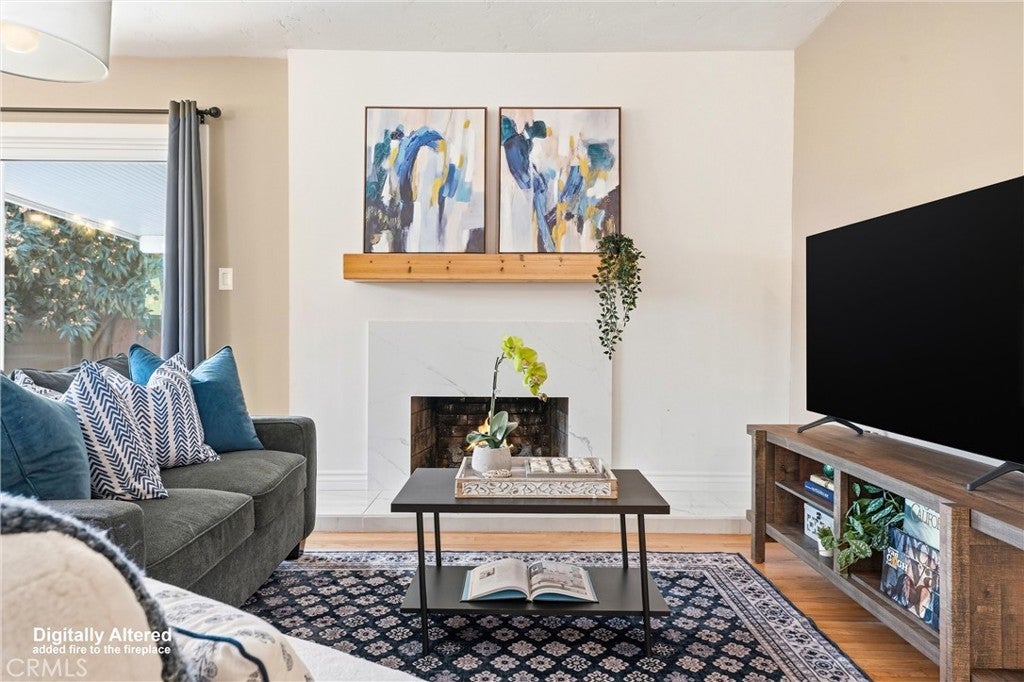 Beautifully upgraded single-story home located on a charming tree-lined street in Fullerton. This turnkey property offers excellent curb appeal with exterior paint, lush landscaping, and mature fruit trees.The bright open-concept layout features hardwood flooring throughout, 5-inch baseboards, vinyl windows and sliding doors, recessed lighting, contemporary fixtures, ceiling fans, and central air conditioning. The stunning kitchen showcases white cabinetry, quartz countertops, a glass tile backsplash, and stainless steel appliances—perfect for both everyday living and entertaining. The spacious living and dining areas are filled with natural light, highlighted by a beautiful quartz-surround fireplace that serves as the focal point of the home. All three bedrooms are generously sized with mirrored closet doors, including an expansive primary suite (approx. 20’ x 12’) with dual closets and a private retreat area. Both bathrooms have been tastefully upgraded with custom tile, frameless glass shower enclosures, and modern vanities and finishes.Enjoy the California indoor-outdoor lifestyle in the private backyard featuring a covered patio, custom flagstone hardscape. Located within the highly regarded Fullerton Joint Union High School District, with convenient access to the 91 and 5 freeways and just minutes from Downtown Fullerton’s shopping, dining, and transportation.