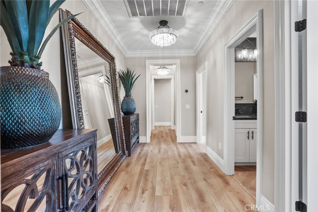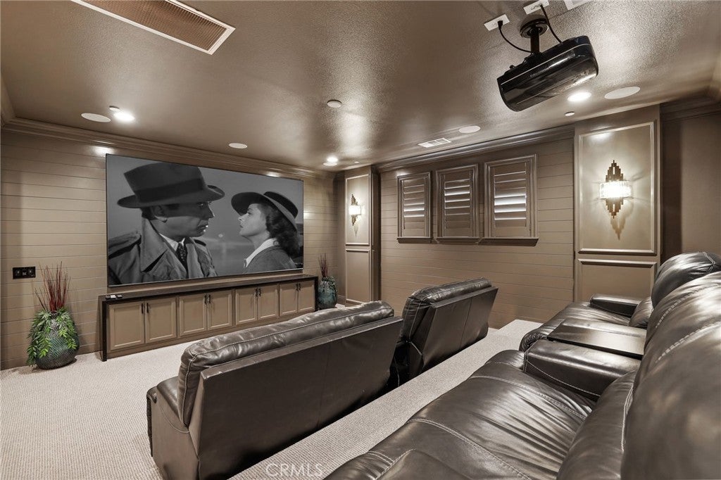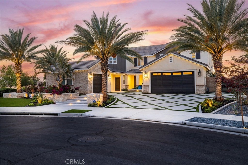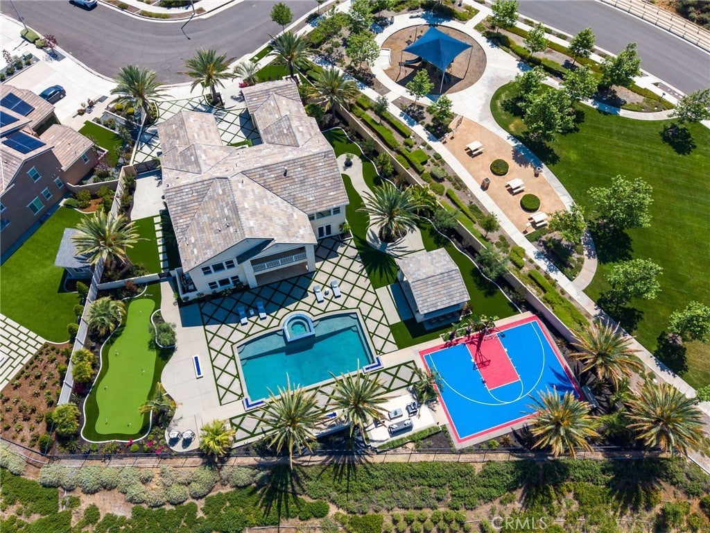 Commanding an unrivaled vantage point atop the most prestigious corner lot in Tramonte at Citrus Heights with breathtaking panoramic mountain and city light views, this masterfully remodeled estate represents the pinnacle of Riverside luxury, offering a level of sophistication and custom detail that far surpasses any neighborhood benchmark in the region. The interior is an architectural triumph, featuring intricate 8” crown moldings, 7” baseboards, luxury vinyl plank flooring, and custom shutters throughout. The chef’s kitchen is a culinary masterpiece anchored by a 48” Sub-Zero refrigerator, Bertazzoni triple-oven range, dual Bosch dishwashers, and a massive seamless waterfall quartz island. Entertainment is redefined in the professional theater room with a 135” screen and 7.1 surround sound, while the formal living areas showcase stunning coffered ceilings and decorative paneling. A fully self-contained multi-generational suite offers a private entrance, separate 1-car garage, kitchenette, separate washer/dryer, and a marble-clad spa bathroom. The primary sanctuary is a true retreat, boasting a flush-mounted 85” TV integrated into a shiplap feature wall, a sleek electric fireplace, a boutique-style custom closet, and a private balcony overlooking the city lights. Outside, a five-star private resort awaits: a 45-foot pool with an infinity-edge spa, an outdoor entertainment pavilion with a full kitchen and fireplace, a regulation-size basketball court, RV gate, pet friendly turf area, and an expansive multi-hole putting green, all framed by 11 mature date palms and custom travertine hardscape. Modern essentials include a 4-car tandem epoxy-finished garage with EV charging, a 10-camera Eufy security system, Govee architectural lighting, and a QuietCool whole-house fan. Located adjacent to a quiet playground and elevated above the neighbors, this one-of-a-kind estate offers an unparalleled lifestyle of privacy and opulence.