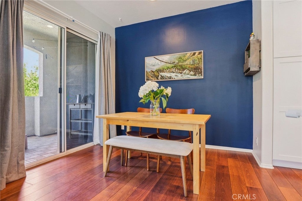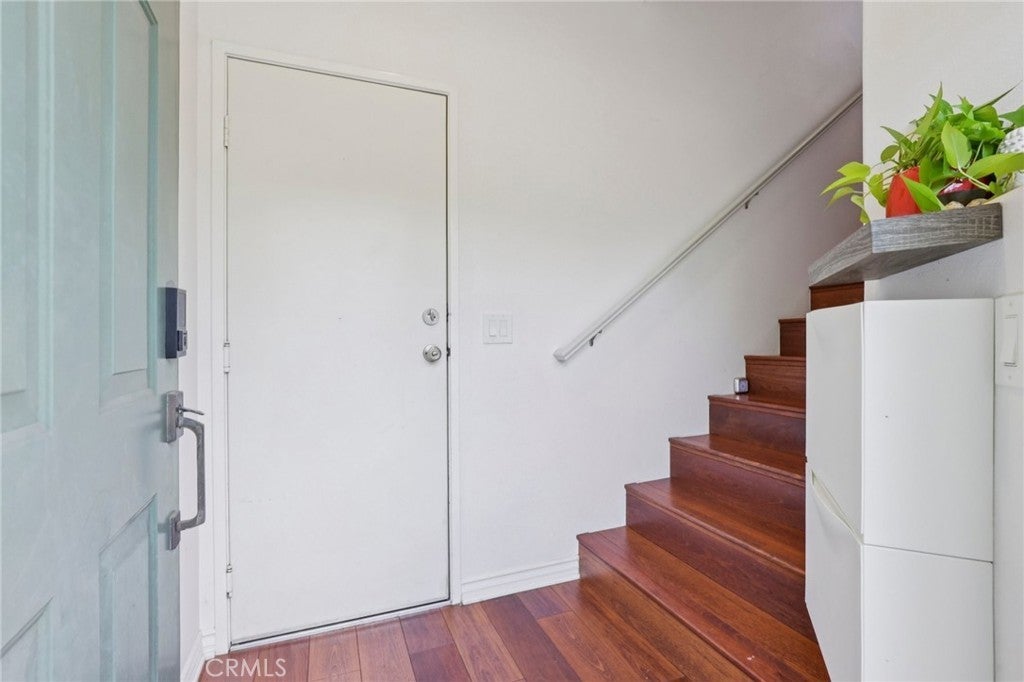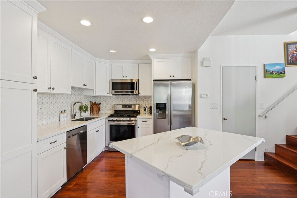 NO ONE ABOVE OR BELOW YOU. This end-unit townhome, is in the Wagon Wheel - Dakota community and it checks the boxes buyers are actually looking for — updated finishes, storage, and a layout that lives well. 1 Attached Car Garage and 1 Additional Assigned Parking Spot. The main level opens to engineered wood floors and a bright, open living and dining area anchored by a fireplace beautiful stone work . The kitchen has been updated and is genuinely one of the standout features of the home — white shaker cabinets with soft-close drawers, quartz countertops, a clean subway tile backsplash, and stainless appliances throughout. The island adds prep space without crowding the room. Also on the main level, a half bath has been tastefully updated — the kind of detail that signals the care that went into this home throughout. A balcony off the dining area gives you outdoor space to step out to, and with no units directly in front of you, it actually feels private. Upstairs, the primary suite features two closets — both outfitted with custom built-ins. The upstairs hall bath also has direct access to the primary bedroom. The upstairs bath has been fully updated: dual sinks, newer vanity, updated mirrors and lighting, modern tile flooring, and an upgraded tub/shower combination. It functions as a true private retreat. The second bedroom also has a custom closet with built-ins. The attached garage includes a dedicated laundry area and additional built-in storage space, keeping everything organized and out of the living areas. Community pool and spa. Close to schools; minutes to Foothill Ranch Town Centre and the 241 toll road.