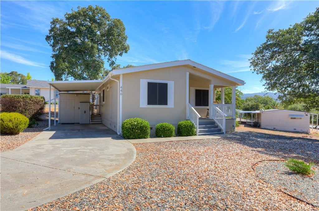 Sweet Cottage with views of the foothills. Covered porch overlooks garden. Deer graze all around the vacant lots. Peaceful upper park location near the end of the cul de sac. The Oaks features underground utilities, wide streets with soft lighting, large lots for gardening and off street parking. There are refuse containers for resident's use at the back of the park. The back gate stays locked, front gate closes at night. Shopping is just outside the park. The Lake is just minutes away. Downtown is about 15 minutes. And don't forget the charming old town next to the River. The Oaks community room is open daily with a kitchen, little library, fireplace and billiards table. Living in the Oaks is a lifestyle that seems like being miles away on vacation. The bedrooms are separated by the living room. The kitchen has an eating area. The back door goes right into the covered car port. A storage shed is next to the car port. Is is lovely, quiet, easy living. The best priced home on the Hill !!