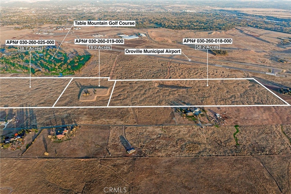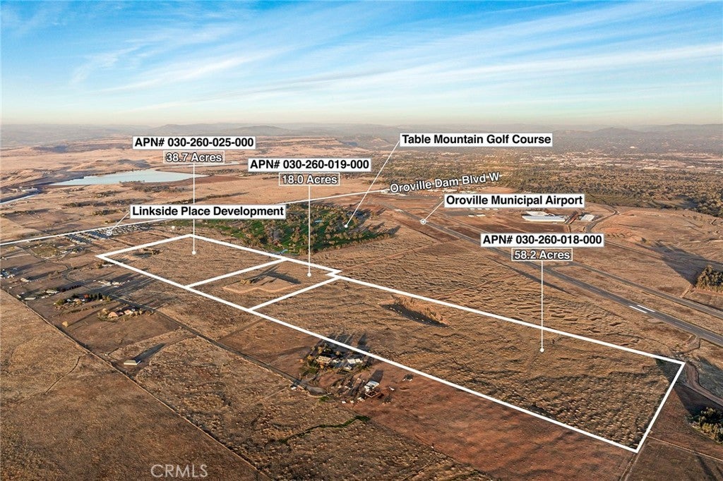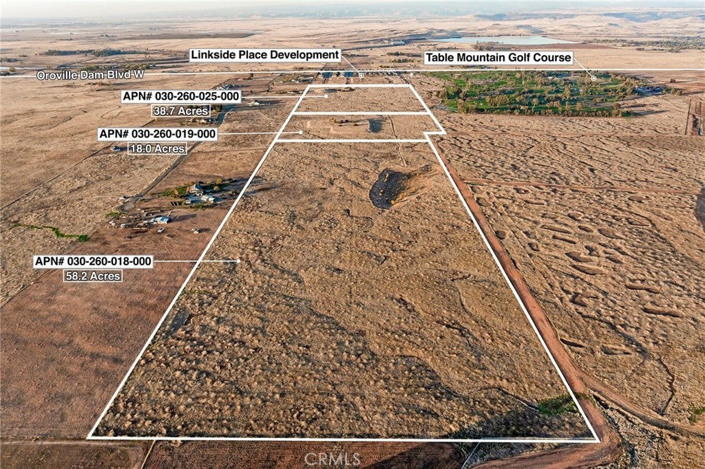 PRIME DEVELOPMENT OPPORTUNITY with this 115± acre land offering located at the edge of the Oroville City Limits and directly adjacent to the 18-Hole Table Mountain Golf Course. Featuring approximately 2,200 feet of golf-course boundary frontage, this property presents exceptional potential for a rural-residential or golf-oriented development concept, including 5-acre estate lots under the current RR-5 zoning. The land borders Linkside Place Phase II to the north, including the tentatively approved Linkside Place Phase II subdivision consisting of 56 future homesites. Phase II has underground utilities already installed and roads graded, awaiting paving, signaling strong forward momentum for continued residential growth in this corridor. Linkside Place Phase I, just north of Phase II, was completed in recent past with 65 homes and demonstrates proven development success in this immediate area. This prime 115± acres is made up of three legal parcels: APN 030-160-019 (18.08± acres), APN 030-260-025 (38.79± acres), and APN 030-260-018 (58.24± acres). Just over 1,000 feet west lies the previously City-approved 421-acre Oro Bay master plan area, once approved for approx. 2,400 homes, showing the long-term development vision for this part of Oroville. Power, water, and sewer currently extend to Linkside Place Phase II at the northern boundary of this property. With Oroville’s growing population, multiple new housing projects underway, and demand for quality development opportunities, this acreage sits directly in the path of expansion. Located just south of Oro Dam Blvd, the main connector between Highways 70 and 99, and approximately 4 miles to downtown Oroville, 25 miles to Chico, and 70 miles to Sacramento. Close to recreation including Lake Oroville, the Feather River, and the Afterbay recreation and boat launch facilities just up the road. Ideal for developers, investors, 1031 exchanges, or long-term land banking. Owner may finance a significant portion—submit terms for seller consideration. Priced at right around $20,000+/- per acre. Inquire with City Of Oroville for discussions on their current plans for this area on Annexation Into City Limits & Potentail Future Rezoning Ideas in conjunction with adjacent developments.