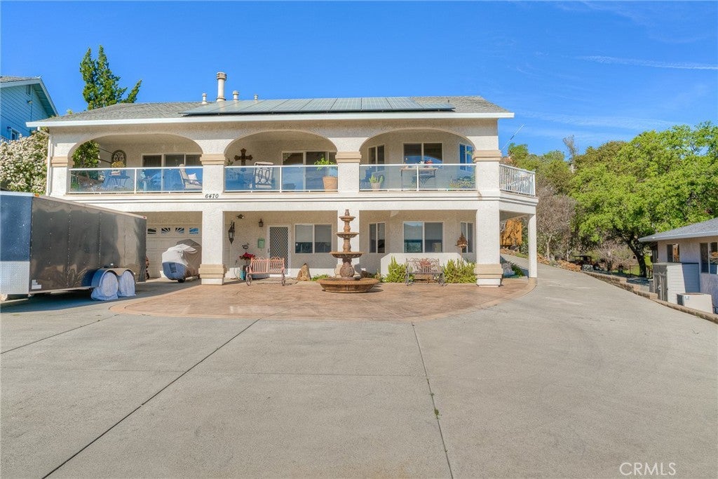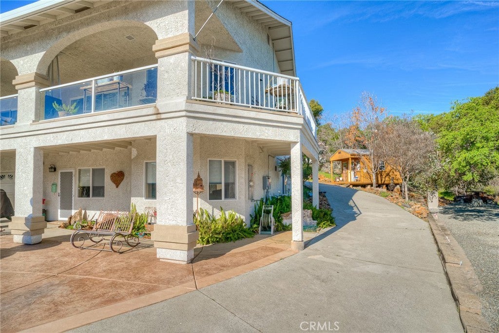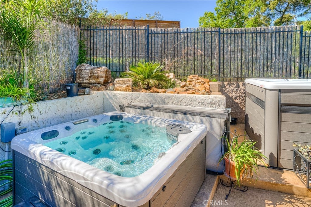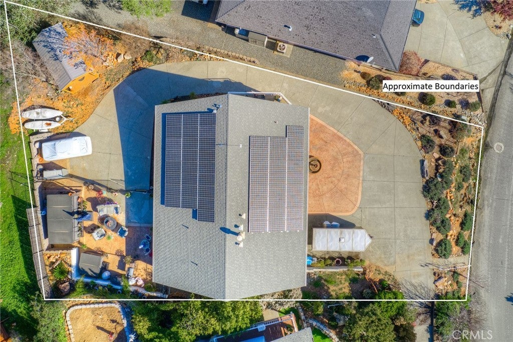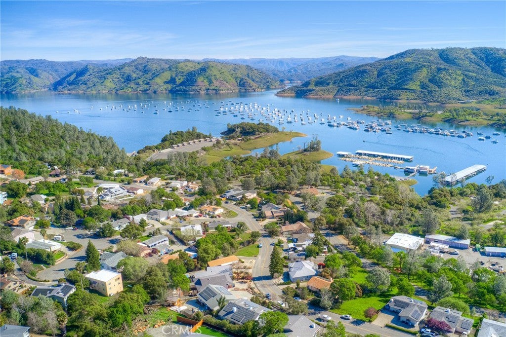 IMAGINE DAILY LIVING JUST MINUTES FROM LAKE OROVILLE WITH SWEEPING LAKE AND EAST FOOTHILL VIEWS....The expansive front deck is the perfect gathering space for family and friends, featuring glass panels designed to preserve the breathtaking scenery. This stunning 4-bedroom, 2.5-bath home offers nearly 2,300 square feet of beautifully designed living space that blends beauty with functionality. Outdoor enthusiasts will love the location—just minutes from the lake, marina, hiking trails, and year-round recreation. Fifty-two solar panels (2Tier solar system) provide power with a transferable monthly cost of $286.38 and seller has never had a true-up utility bill. The recently remodeled kitchen and dining area are truly exceptional. A magnificent onyx island countertop anchors the space, surrounded by custom cabinetry crafted from walnut, teak, and mahogany. The beautiful travertine backsplash, flooring, and baseboards add warmth, while a copper wall pot filler and a stunning travertine farmhouse sink elevate both style and function. The kitchen is complete with all new GE Café appliances with copper accents. The dining area features a custom wine rack, charming window seat, and a lake-view window. The vaulted living room showcases custom wood beams, recessed lighting, Venetian plaster accents, and a beautiful stone fireplace with Heatilator, all framed by large windows capturing the incredible views. Convenience meets flexibility with two entry options—a traditional front entrance or a rear driveway access that allows entry onto the second level with no stairs required. The primary suite enjoys spectacular lake views, private access to the front deck through large glass doors, and a peaceful retreat atmosphere. Another bedroom is located on this level along with a spacious laundry room with sink and cabinetry. The fenced backyard is beautifully landscaped and hardscaped with decorative rock features and a relaxing rock fountain. Colored stamped concrete enhances both the front and backyard. Designed for year-round enjoyment, the backyard includes a solar heated swim spa and hot tub, creating a private outdoor retreat. Additional features include: 2 bdrms. downstairs with a large bonus room, whole-house fan, ceiling fans throughout, gutter guards, ample parking in both front and rear, and an 8 x 18 hickory storage shed. This remarkable property offers the perfect blend of relaxed living, scenic beauty, and outdoor recreation just minutes from Lake Oroville.