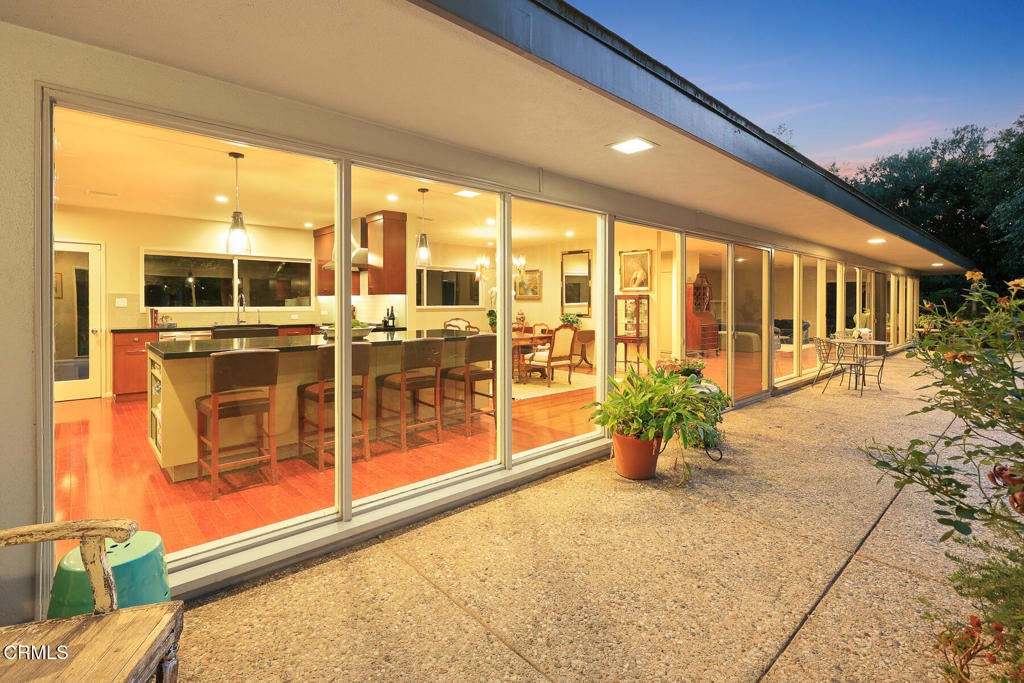 Idyllic Mid-Century Pasadena Estate with Seamless Indoor-Outdoor Living. Tucked away on 'Millionaires Row' a long, gated driveway, leads to a stunning 1953 single-story contemporary estate offering rare privacy and tranquility in the heart of Pasadena. A gracious porte-cochere entry sets the tone for the serene elegance that defines this exceptional residence. Step inside the formal entry, where custom built-in closets provide both style and function, and your eye is immediately drawn to the breathtaking 180-degree view of the lushly landscaped rear grounds. Walls of glass and sliding doors frame this picturesque setting, inviting natural light to flood the interiors and creating a seamless connection between indoor and outdoor living. The spacious living room features custom built-in bookshelves and a cozy fireplace--ideal for both quiet evenings and stylish entertaining. The formal dining area flows effortlessly into the beautifully remodeled kitchen, outfitted with high-end built-in appliances, a large center island, newer beverage refrigerator, and a discreetly tucked-away laundry closet. With 4 generous bedrooms and 3.5 bathrooms, the home is perfectly designed for comfortable living. The expansive primary suite is a true retreat, offering ample space and privacy. Rear grounds, professionally landscaped and dubbed the 'Circle Gardens' has been curated by noted local 3rd generation nursery family and rare plant collectors, the Burkard Family. The resort-like grounds are a private paradise--lush, exotic landscaping surrounds multiple seating areas, a sparkling pool, and three separate storage/garden sheds, offering endless opportunities for relaxation and recreation. A rare offering blending timeless architecture with modern convenience in one of Pasadena's most desirable and prestigious locations.