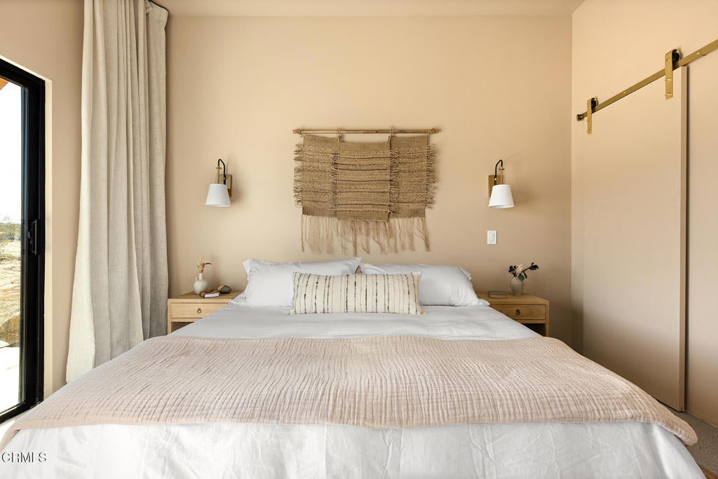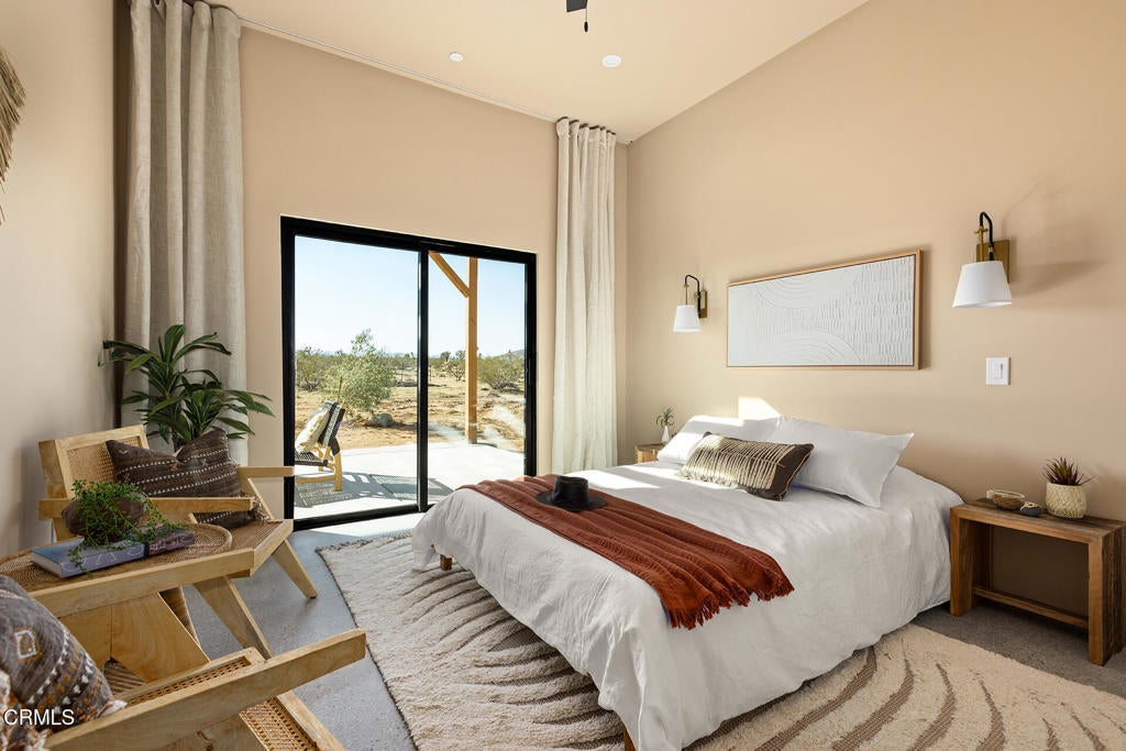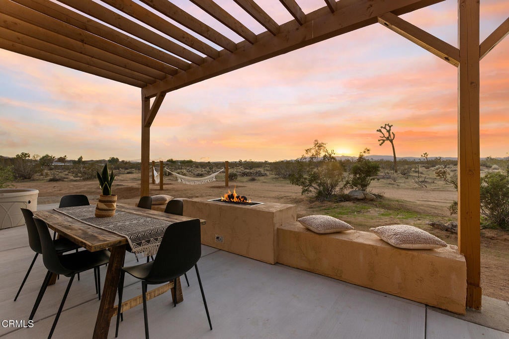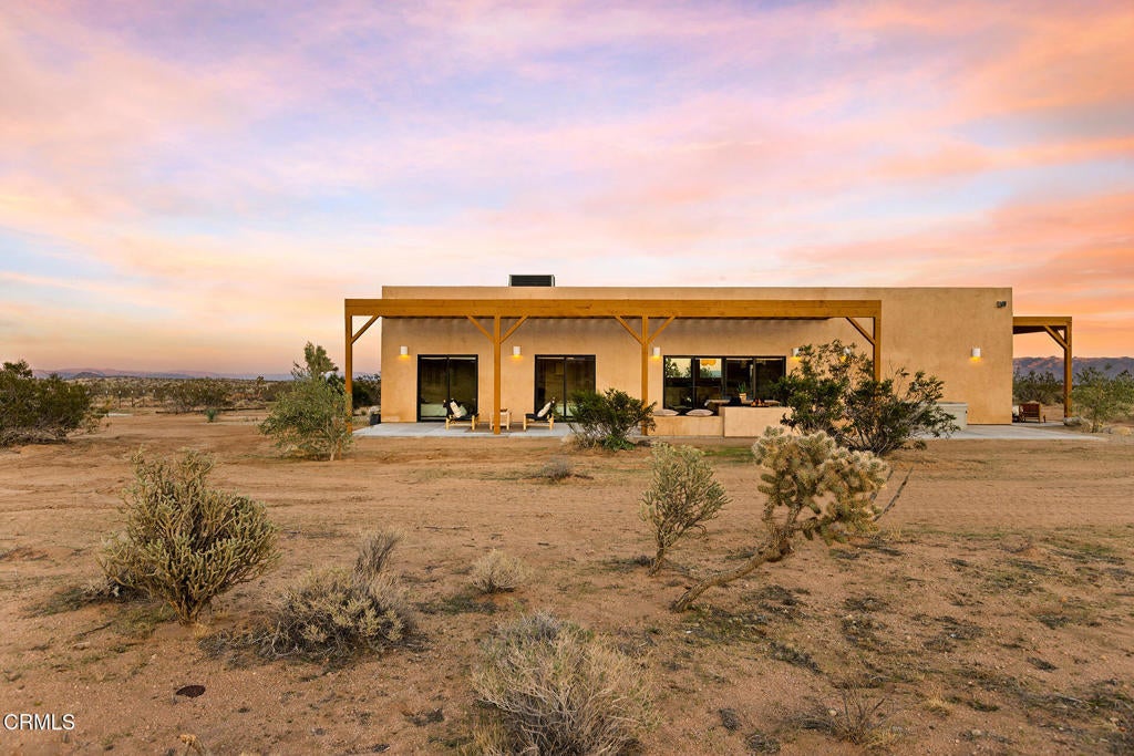 Experience elevated desert living in this new modern retreat set on over two acres in Northern Joshua Tree. Designed to frame sweeping sunset views of the San Gorgonio Mountains, this 3-bedroom, 2-bathroom home blends contemporary style with natural tranquility. Exposed aggregate concrete floors, high ceilings, and expansive sliding doors connect the light-filled interiors to the desert landscape, while the chef's kitchen impresses with Bosch appliances, a waterfall island, custom range hood, pot filler, and designer lighting. The great room separates the guest wing from the primary suite for added privacy, and each bedroom opens directly outdoors for effortless indoor-outdoor living. The primary suite offers a spa-like bathroom with floor-to-ceiling tile, skylights, and an additional outdoor soaking tub and shower for stargazing. The expansive back patio offers a space to gather around the built-in firepit or relax in the hot tub surrounded by panoramic desert views. Fully electric and energy-efficient, the home includes owned solar, central HVAC, an EV charger, and dark-sky-friendly lighting. The two-car carport can double as shaded outdoor space, while drought-tolerant landscaping with olive trees and creosotes enhances the peaceful setting. Near local favorites like La Copine, Crossroads, and Pappy & Harriet's, this thoughtfully crafted home truly captures the spirit of modern desert living.
