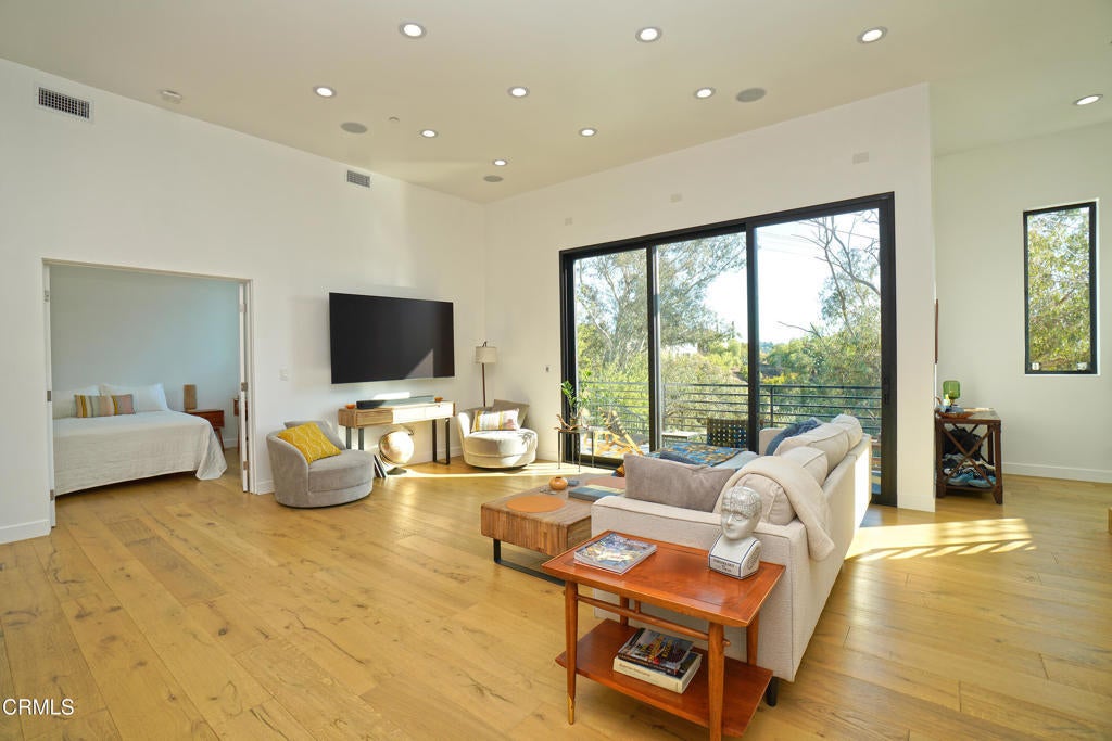 Nestled at the end of a quiet and serene cul-de-sac, just moments from Pasadena and with convenient access to Los Angeles' major arteries, this newly constructed, three-story home exemplifies luxurious living. With chic contemporary design, natural lighting, and stunning city views, it offers a rare opportunity to enjoy a modern lifestyle in a highly desirable location. Step into an open-concept living space perfect for entertaining. Blonde Oak hardwood floors flow throughout, complemented by recessed lighting and expansive LaCantina 3 panel sliding glass windows that frame breathtaking views. The state-of-the-art kitchen features sleek Calacatta porcelain countertops, a bookmatched Calacatta porcelain backsplash, brand-new stainless steel Thor appliances, a wine fridge, and an island with ample space for dining and meal preparation. Adjacent to the kitchen is a versatile bedroom with a full bathroom, ideal for use as an office, gym, or guest room. A convenient half bath is also located on this level. The second floor hosts the luxurious primary suite, complete with a walk-in closet, large LaCantina 3 panel sliding glass windows, and a private indoor-outdoor terrace. The spa-like primary bathroom includes a soaking tub for ultimate relaxation and a walk-in shower with bookmatched porcelain slabs. A secondary bedroom with its own full bathroom and a dedicated laundry area complete this floor. The top level boasts a shaded patio, perfect for dining and entertaining. A short staircase leads to the rooftop deck, offering panoramic views of Los Angeles and the Downtown LA Skyline. With water and gas hookups, the space is ready for an outdoor kitchen or grill, making it ideal for hosting gatherings under the stars. Additional features include dual zone central air/heat, recessed lighting throughout, built-in wine cabinet under staircase, built-in ceiling speakers, solar panel ready on the rooftop, and an attached 2 car garage. This home is conveniently located near the 110 Freeway, Pasadena, excellent schools, and a variety of shopping and entertainment options. Don't miss this exceptional opportunity to own a meticulously designed, move-in-ready home where comfort, style, and convenience come together.