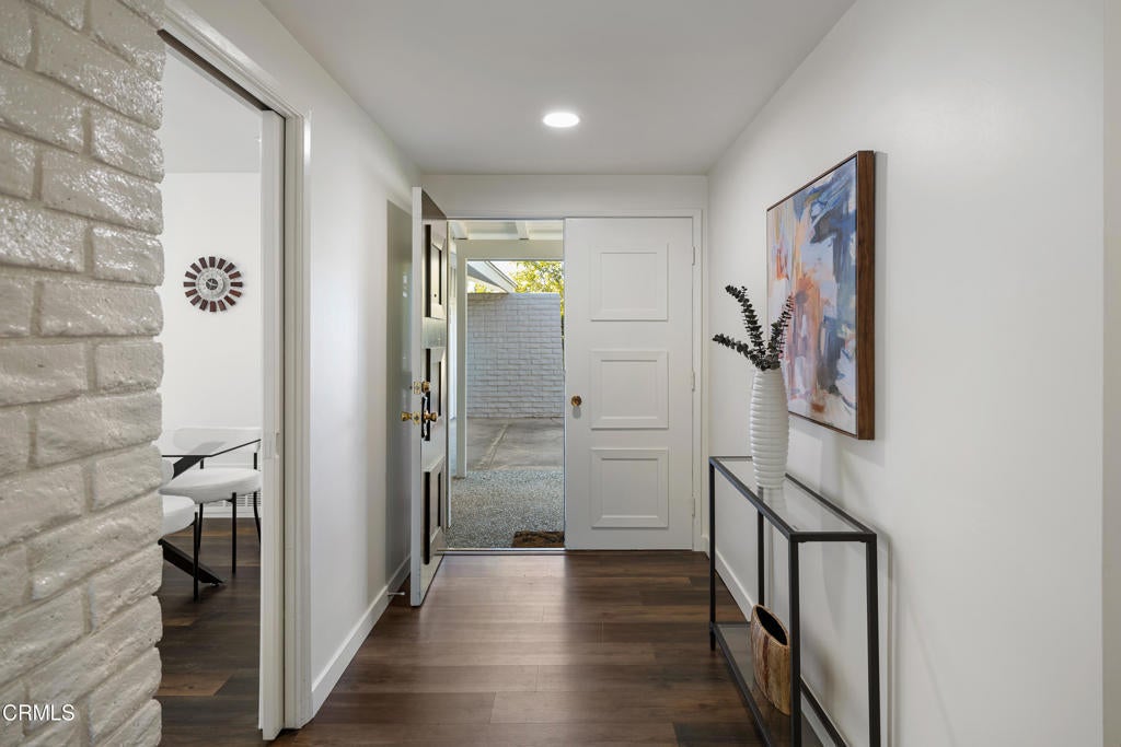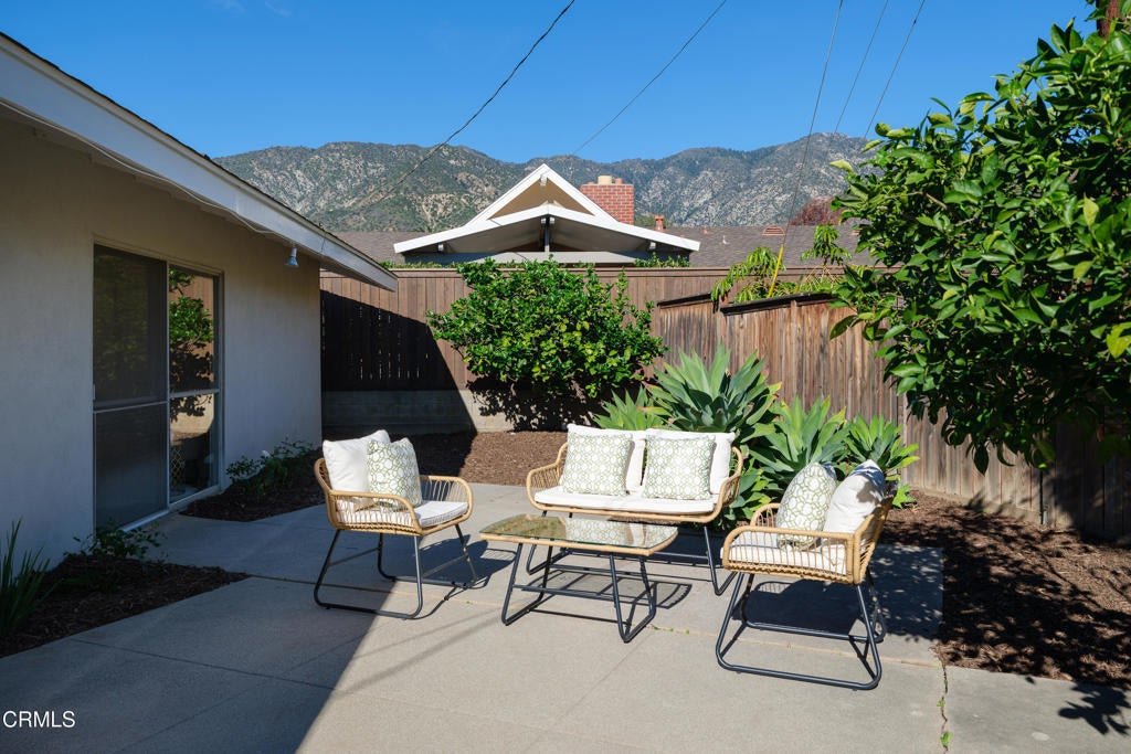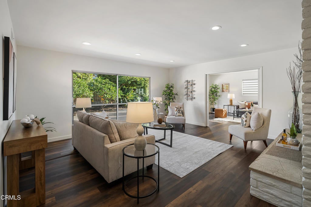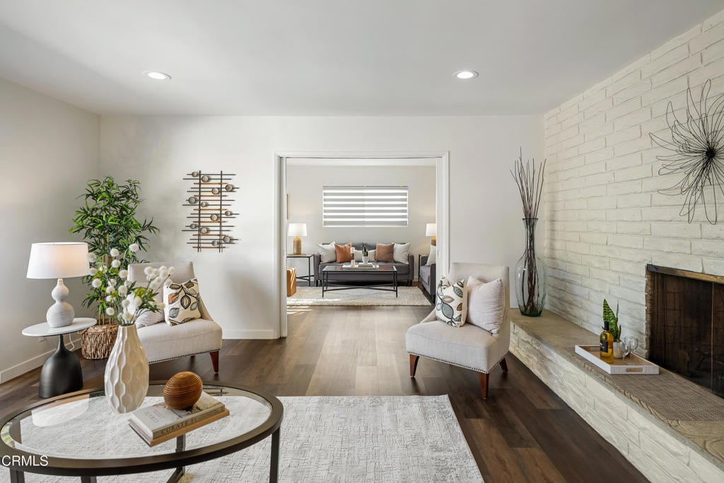 Set within a beautifully manicured Monrovia neighborhood with close proximity to the foothills & sweeping views south across the valley, this inviting residence offers comfort, functionality & a seamless indoor-outdoor connection. The driveway leads to a charming covered front porch & double-door entry. Inside, wood-look flooring flows throughout the home & recessed lighting creates a warm, cohesive feel in the main living spaces. Immediately to the right, the home opens to the dining area & updated kitchen, anchored by a raised fireplace & concrete bar-style countertop, perfect for casual gatherings or everyday living. The kitchen features Calacatta Quartz countertops, updated cabinetry, stainless steel appliances, including a gas range, range hood & a bay window above the sink. A direct door connects to the attached 2-car garage, which includes laundry & additional storage. Just beyond the kitchen, the family room offers recessed lighting, a pass-through window with counter seating ideal for entertaining & a sliding glass door that opens to the backyard patio. Pocket doors connect the family room to the living room, allowing for both open flow & private separation when desired. The living room is highlighted by a raised stone hearth fireplace, recessed lighting, wood-look flooring & another sliding glass door that enhances natural light & access to the outdoors. The backyard features a paved patio surrounded by mature fruit trees, creating a tranquil space for dining al fresco, relaxing, or hosting gatherings. A hallway off the living room leads to 3 bedrooms & 2 bathrooms. The first bedroom offers dual-pane windows & a generous closet. A second well-sized bedroom sits at the end of the hall, also featuring dual-pane windows. A full hallway bathroom includes a tub & shower combination, a dual-sink tiled vanity, recessed lighting & convenient linen storage nearby. The primary suite is privately situated on the opposite side of the hallway & features a spacious closet & a sliding glass door opening directly to the backyard patio. The ensuite bathroom includes an additional closet, oversized single-sink tiled vanity, recessed lighting & a tiled walk-in shower. With its thoughtful layout, inviting outdoor spaces, desirable Monrovia location near the foothills & moments from Old Town Monrovia's shops, dining & entertainment, this home offers an exceptional opportunity to enjoy both comfort & scenery in a well-established neighborhood.
