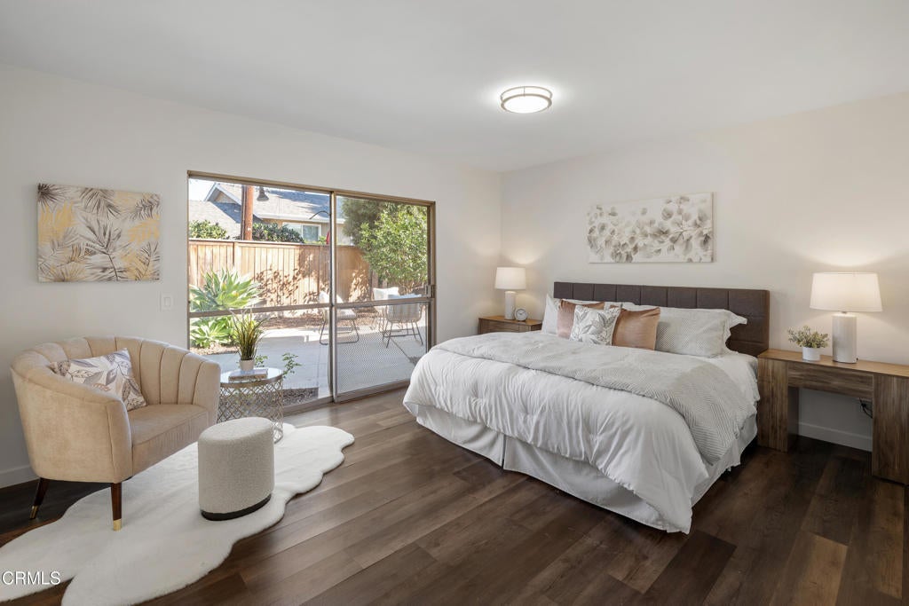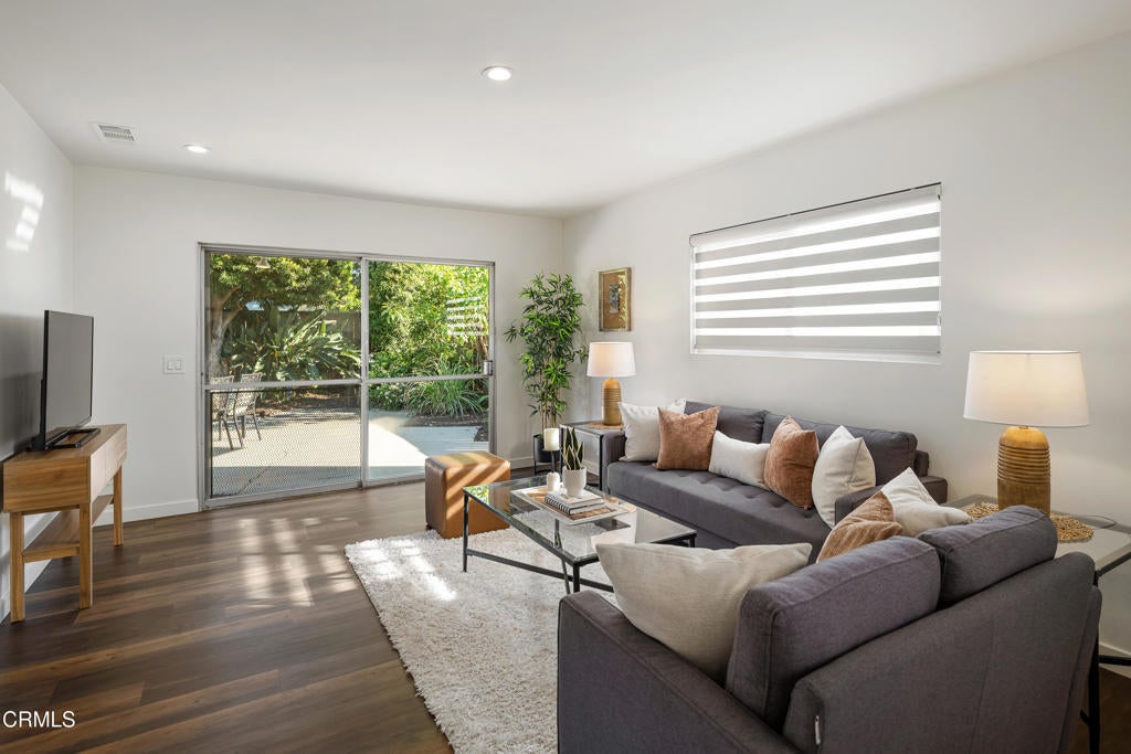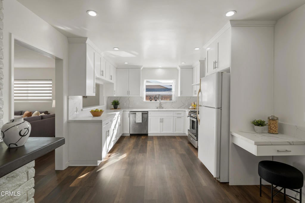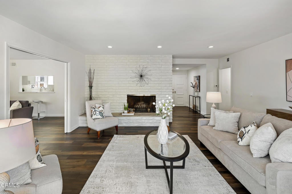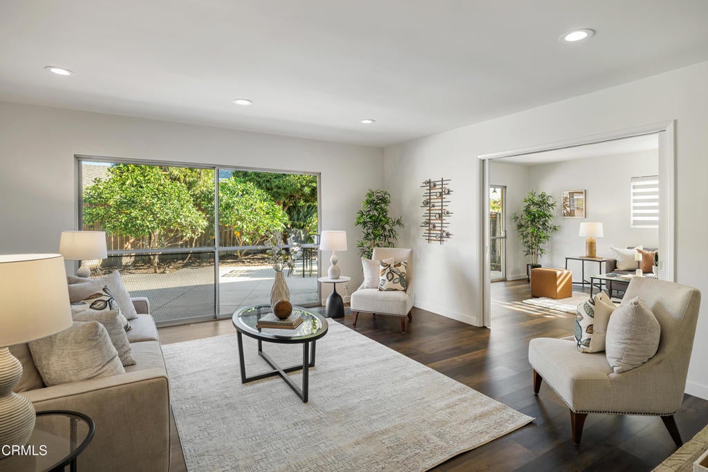 Set within a beautifully manicured Monrovia neighborhood with close proximity to the foothills & sweeping views south across the valley, this inviting residence offers comfort, functionality & a seamless indoor-outdoor connection. The driveway leads to a charming covered front porch & double-door entry. Inside, wood-look flooring flows throughout the home & recessed lighting creates a warm, cohesive feel in the main living spaces. Immediately to the right, the home opens to the dining area & updated kitchen, anchored by a raised fireplace & concrete bar-style countertop, perfect for casual gatherings or everyday living. The kitchen features Calacatta Quartz countertops, updated cabinetry, stainless steel appliances, including a gas range, range hood & a bay window above the sink. A direct door connects to the attached 2-car garage, which includes laundry & additional storage. Just beyond the kitchen, the family room offers recessed lighting, a pass-through window with counter seating ideal for entertaining & a sliding glass door that opens to the backyard patio. Pocket doors connect the family room to the living room, allowing for both open flow & private separation when desired. The living room is highlighted by a raised stone hearth fireplace, recessed lighting, wood-look flooring & another sliding glass door that enhances natural light & access to the outdoors. The backyard features a paved patio surrounded by mature fruit trees, creating a tranquil space for dining al fresco, relaxing, or hosting gatherings. A hallway off the living room leads to 3 bedrooms & 2 bathrooms. The first bedroom offers dual-pane windows & a generous closet. A second well-sized bedroom sits at the end of the hall, also featuring dual-pane windows. A full hallway bathroom includes a tub & shower combination, a dual-sink tiled vanity, recessed lighting & convenient linen storage nearby. The primary suite is privately situated on the opposite side of the hallway & features a spacious closet & a sliding glass door opening directly to the backyard patio. The ensuite bathroom includes an additional closet, oversized single-sink tiled vanity, recessed lighting & a tiled walk-in shower. With its thoughtful layout, inviting outdoor spaces, desirable Monrovia location near the foothills & moments from Old Town Monrovia's shops, dining & entertainment, this home offers an exceptional opportunity to enjoy both comfort & scenery in a well-established neighborhood.