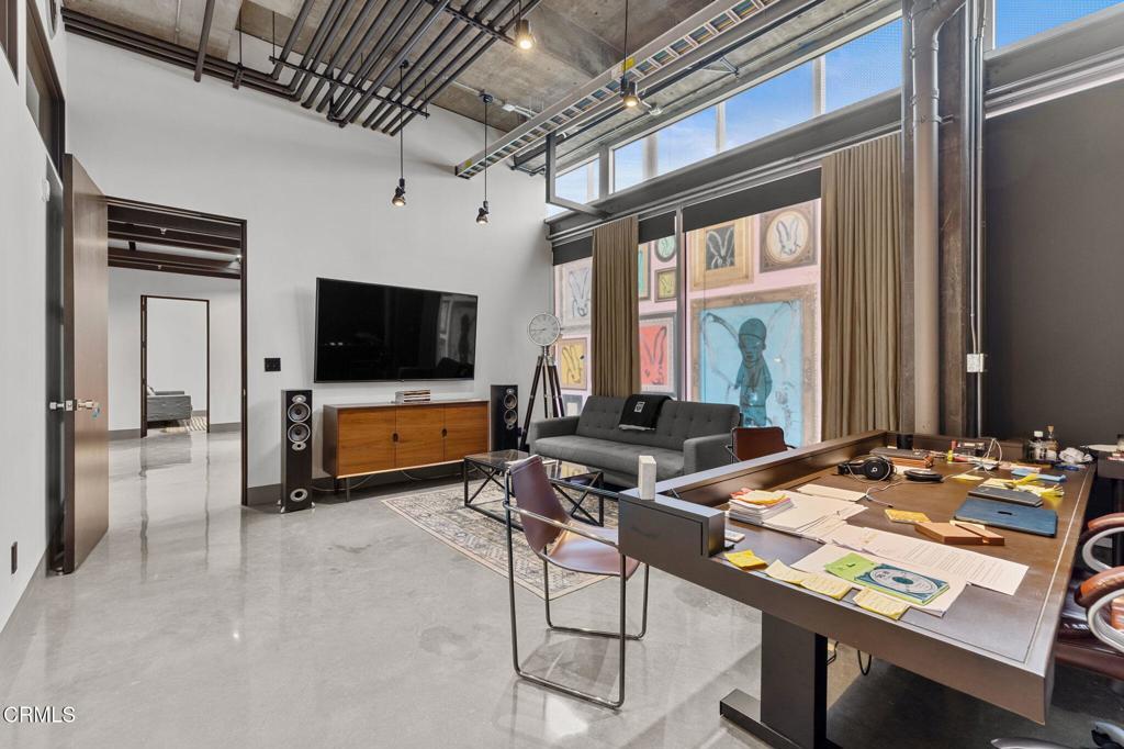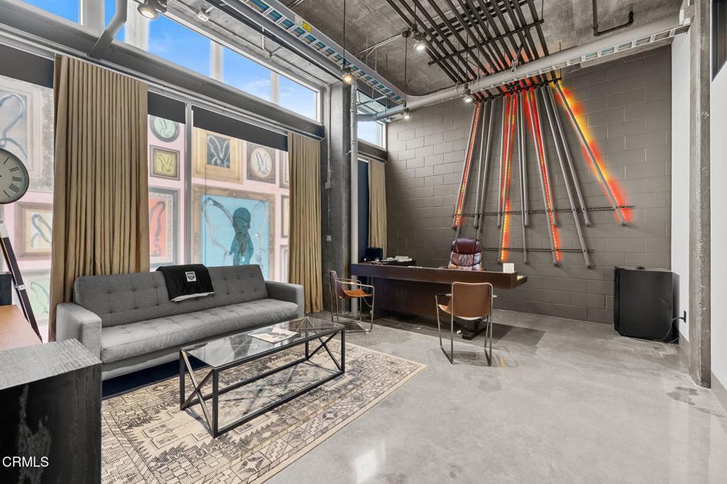 751 N. Fairfax Ave., Suite 102 is a rare ground-floor commercial condominium within the iconic Cherokee Studios Lofts. The property totals approximately 3,100 square feet, comprised of +/-2,410 square feet of ground-floor space and +/-700 square feet of high-ceiling storage, offering a highly flexible layout suitable for creative office, studio, production, showroom, retail, or food-and-beverage use (subject to approvals).The space is currently configured with a combination of private offices, open collaboration areas, kitchen, and media/theatre room, and features a modern industrial aesthetic with polished concrete floors, exposed concrete walls and ceilings, and dramatic ceiling heights. The unit benefits from approximately 80 feet of frontage along North Fairfax Avenue, providing strong visibility and branding potential while maintaining operational privacy when desired. Existing CAT-6 cabling and fiber-optic connectivity support media, technology, and data-intensive users.Per the CC&Rs, the condominium is legally divisible into multiple units, allowing for phased occupancy, future flexibility, or multiple use scenarios. Ownership includes access to a secure, gated covered parking garage with 8 assigned spaces, with the ability to stack for additional capacity, plus 2 reserved surface parking spaces. Tenants and owners also enjoy access to a shared rooftop deck via elevator, offering panoramic city views--an amenity rarely found in comparable ownership opportunities.
