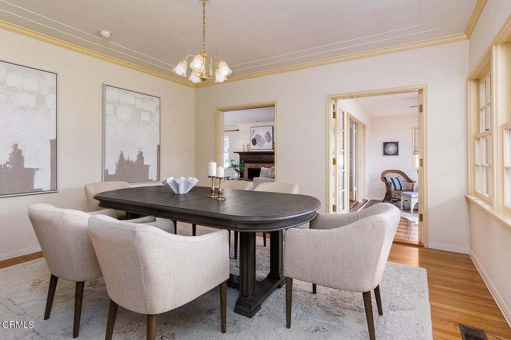Set along one of San Marino's most desirable tree-lined streets, this classic residence offers timeless architecture, gracious proportions, and exceptional flexibility in a premier neighborhood location.The main home features four bedrooms and two bathrooms, thoughtfully arranged within a layout that balances comfort and scale. A welcoming facade and mature landscaping introduce interiors defined by warmth and character. The light-filled living room, anchored by a fireplace and custom built-ins, flows effortlessly into a formal dining room detailed with crown molding, an ideal setting for both refined entertaining and everyday gatherings. An enclosed sun porch extends the living space and opens to the rear gardens, creating a seamless connection between indoors and out.The spacious primary suite offers dual walk-in closets, while the additional bedrooms provide versatility for family living, guests, or dedicated work-from-home space. Hardwood floors, custom built-ins, and well-proportioned rooms reflect enduring craftsmanship and thoughtful design.Beyond the brick patio and citrus trees, a detached studio with its own bath, kitchenette, fireplace, and generous storage enhances the property's appeal. Whether used as guest quarters, a creative retreat, or a private executive office, this separate structure adds meaningful flexibility rarely found in this setting.The landscaped grounds provide privacy and tranquility, with multiple areas for outdoor dining and entertaining. A detached two-car garage with additional storage and a smart irrigation system serving both front and rear gardens add convenience and functionality.Moments from Lacy Park, the Huntington Library, and San Marino's award-winning schools, this is a rare opportunity to own a residence that balances architectural character, flexible living, and an exceptional location.