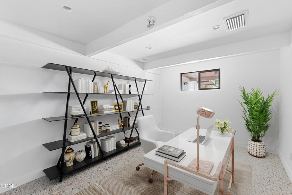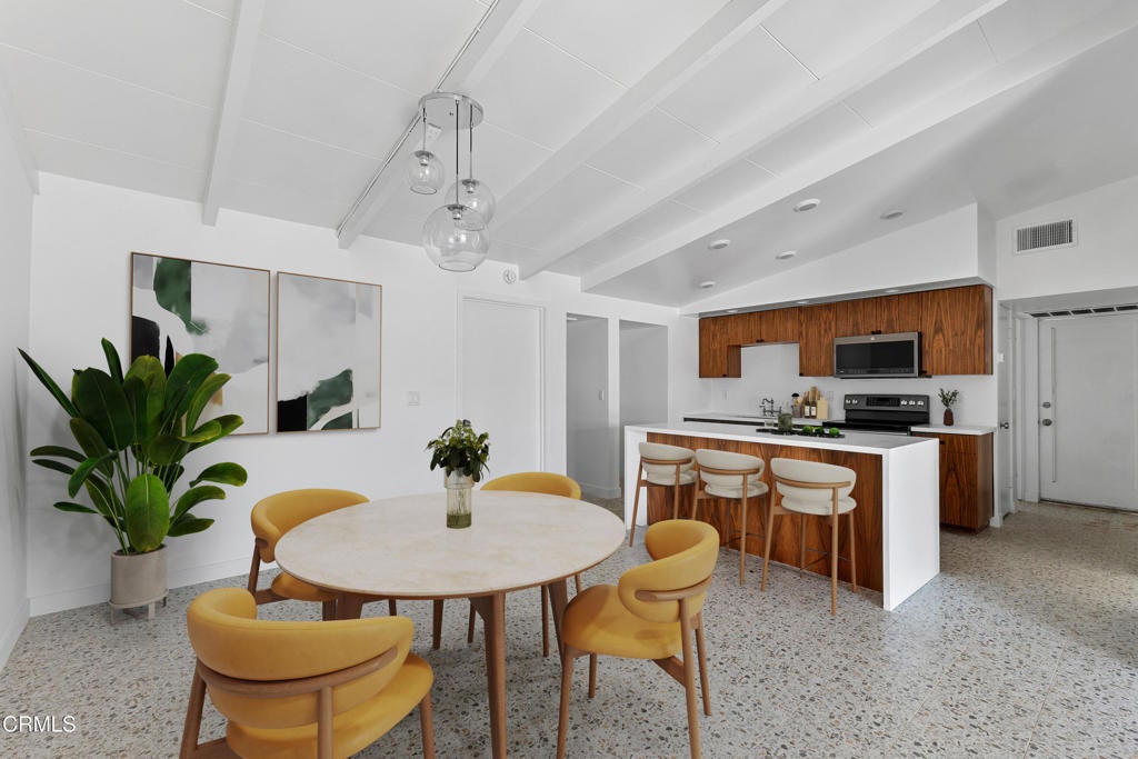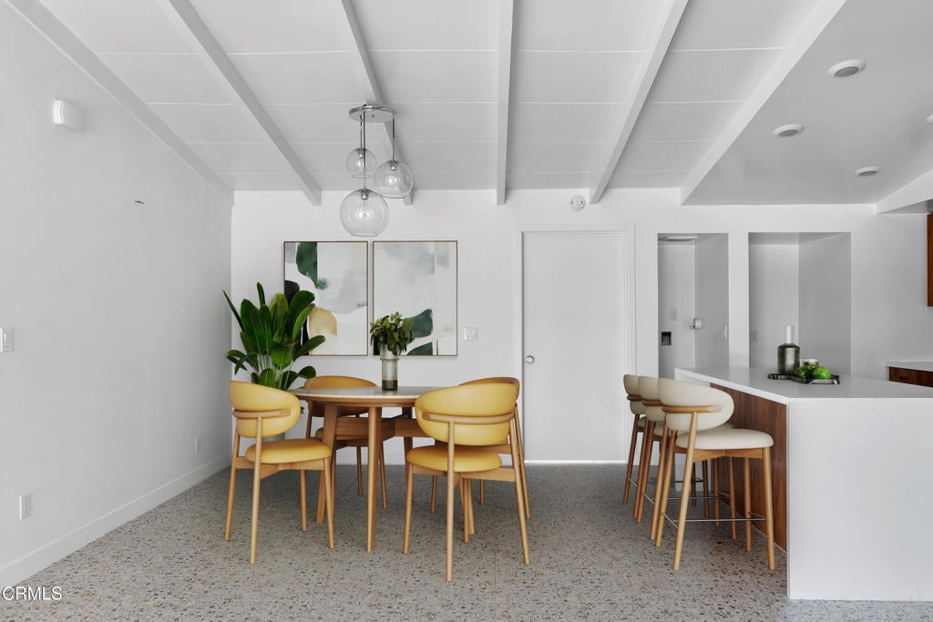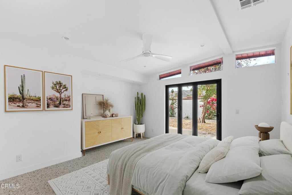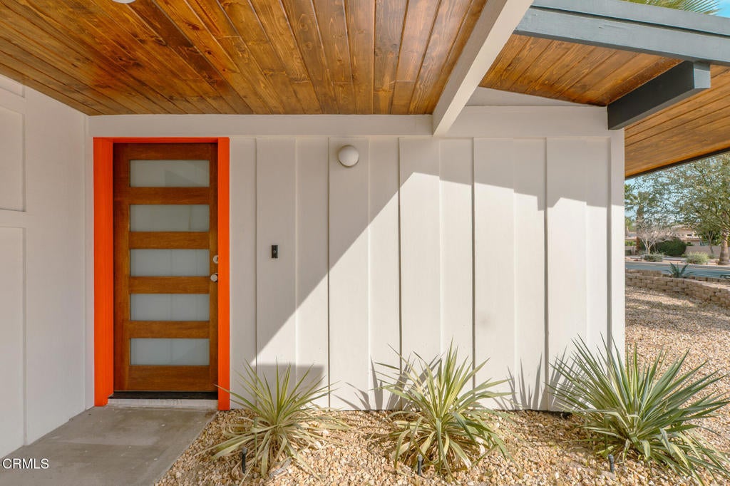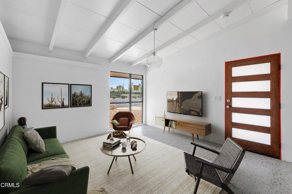 Set within the architecturally significant Tierra Del Sol community in Rancho Mirage, this 1958 Mid-Century Modern residence embodies the timeless clarity of desert modernism.Designed by Richard Leitch, FAIA and developed by Robert McCulloch, Tierra Del Sol earned national recognition with an AIA award for its master planning -- a thoughtfully composed enclave of just 39 homes arranged around shared green space and a central clubhouse. Hidden just off Bob Hope Drive, it remains one of Rancho Mirage's quiet architectural treasures.This home has been carefully renovated to preserve its design integrity while elevating livability for today's lifestyle. Inside, terrazzo-style flooring flows throughout the open plan, anchoring the interiors with a classic mid-century palette. Clerestory windows bring in soft natural light, while warm wood cabinetry and clean white surfaces reinforce the architectural rhythm of line, light, and material.The flexible layout offers a primary suite, a secondary suite, and a third bedroom, providing privacy for guests or multi-generational living -- a rare advantage in historic modernist homes.Outside, the home embraces the desert landscape with citrus trees -- grapefruit, tangerine, and orange -- creating a private garden that reflects Rancho Mirage's heritage of resort living. Spectacular mountain views frame the property, while the community's pool and expansive grounds offer a relaxed social setting reminiscent of classic Palm Springs era living.Located just one mile from The River and moments from Eisenhower Health, the home combines architectural pedigree with everyday convenience.