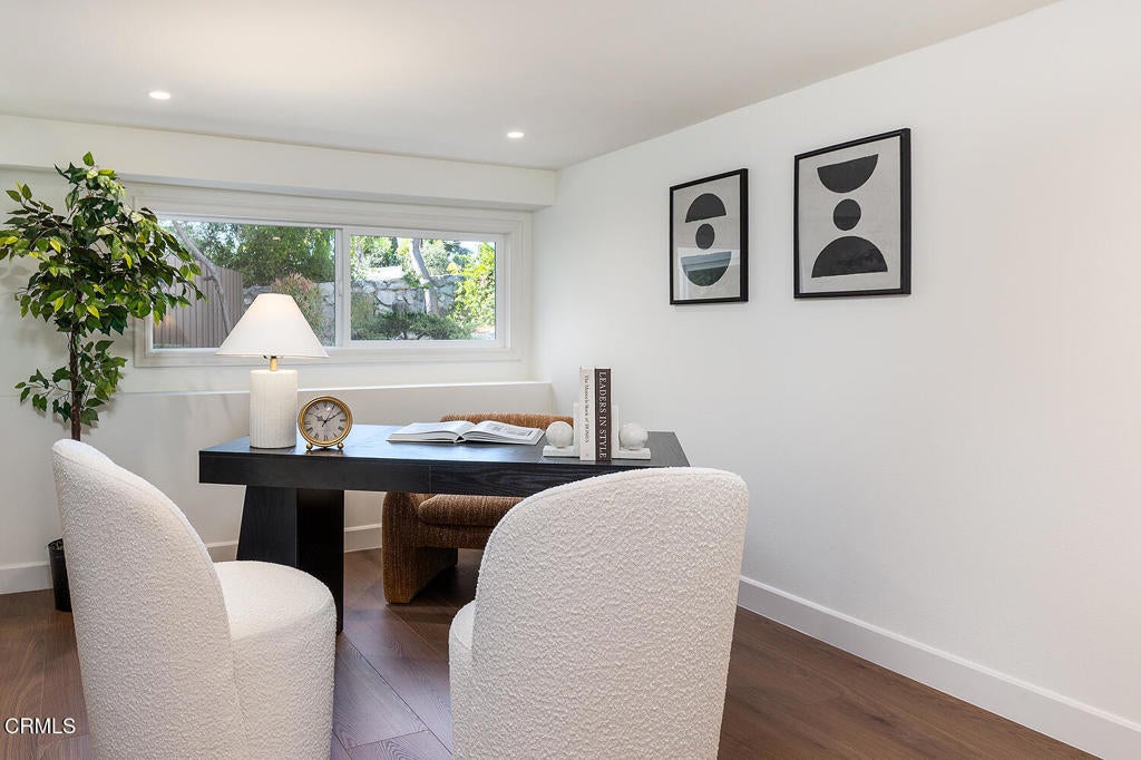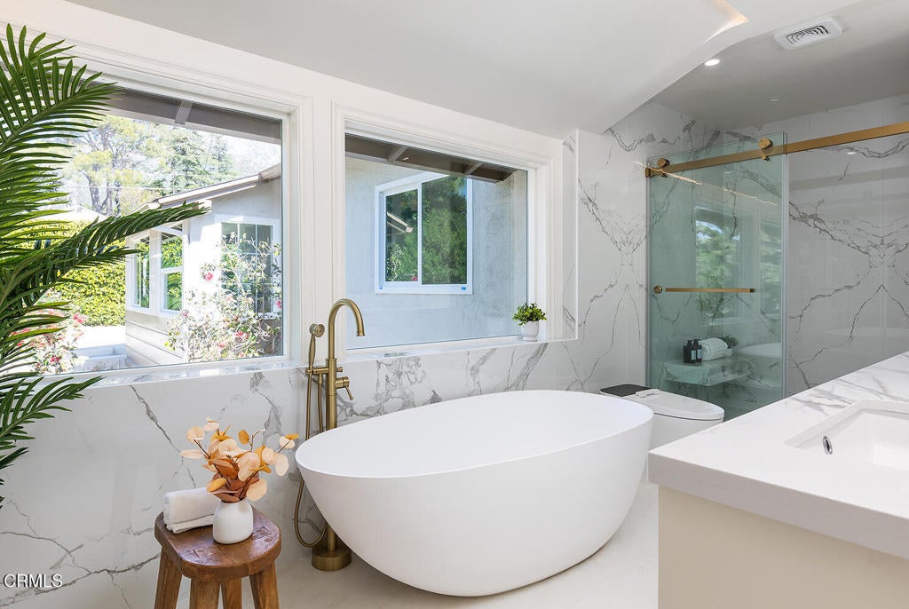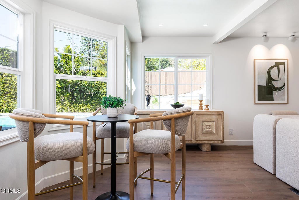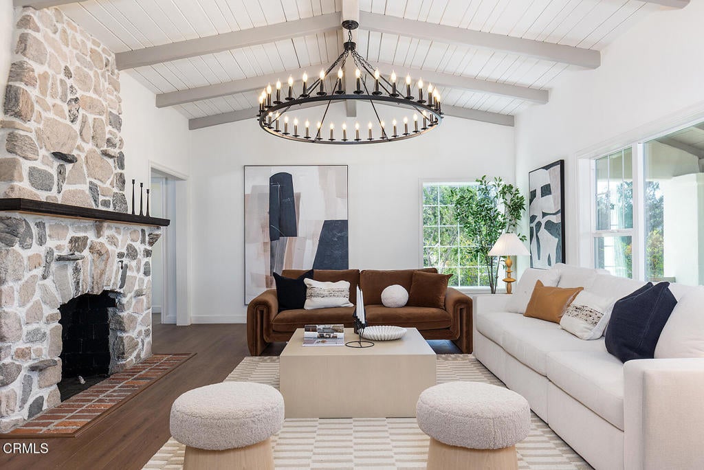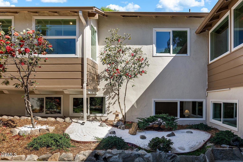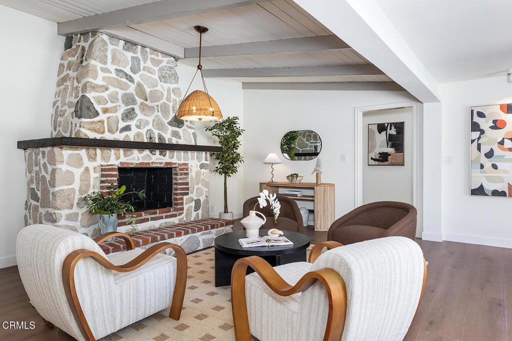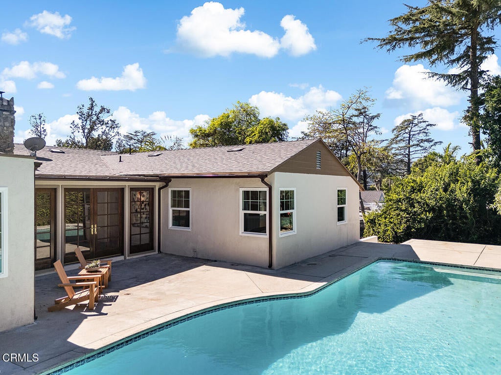 Set in the heart of La Crescenta, this charming 1937 home at 2345 Orange Cove Ave offers a coveted poolside lifestyle, timeless architectural detail, modern updates, and a location central to top-rated schools, neighborhood parks, and the shops and restaurants of La Crescenta and Montrose. A gated driveway and river rock landscape walls introduce the property, with a wide covered front porch welcoming you to the entry. Inside, the living room is anchored by a two-sided river rock fireplace, a striking architectural centerpiece, with a tongue and groove beamed wood ceiling overhead. The adjacent den enjoys the other side of the fireplace, a raised hearth bench, and french doors that open directly to the patio and pool, creating seamless indoor-outdoor living. Nearby, the modernized kitchen is anchored by a large waterfall island with breakfast bar and just-installed appliances including a stainless steel range and smart refrigerator. The kitchen flows into a comfortable dining area, which enjoys views of the pool and garden outside. Three bedrooms occupy the main level, two of which are primary suites, each with spa-like baths, soaking tubs, separate showers, and large walk-in closets. The first primary bedroom looks out to the pool and backyard, while the other opens through french doors to a large private balcony with Saltillo tile floors. Downstairs, two additional bedrooms, two three-quarter baths, and a large game room offer flexible space for activities with direct access to the convenient carport. Outside, lush grass areas in the front and back yards, a sitting deck, and a generous patio frame the sparkling pool and mountaintop views, an ideal setting for entertaining or relaxed Southern California living. Mountain Avenue Elementary, Rosemont Middle School, Crescenta Valley High School, and Two Strike Park are all just moments away. With its character details, modern updates, and exceptional poolside outdoor living, 2345 Orange Cove Ave is a rare find in one of the Foothills' most cherished communities.