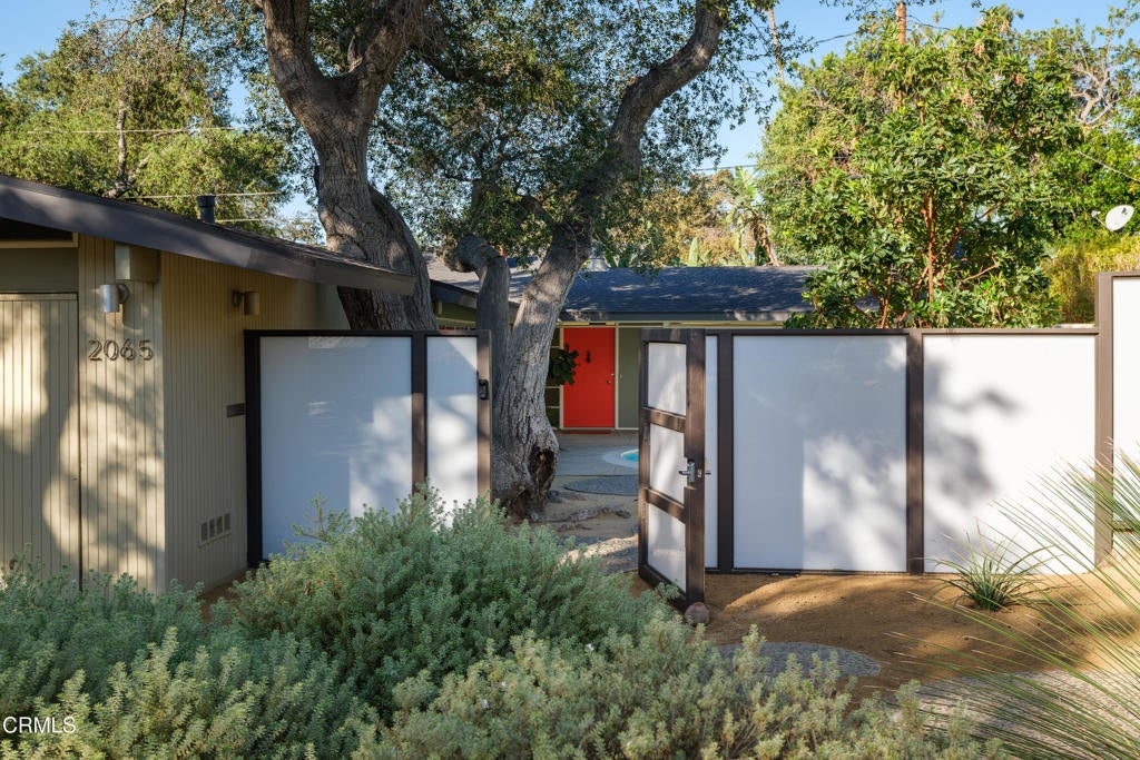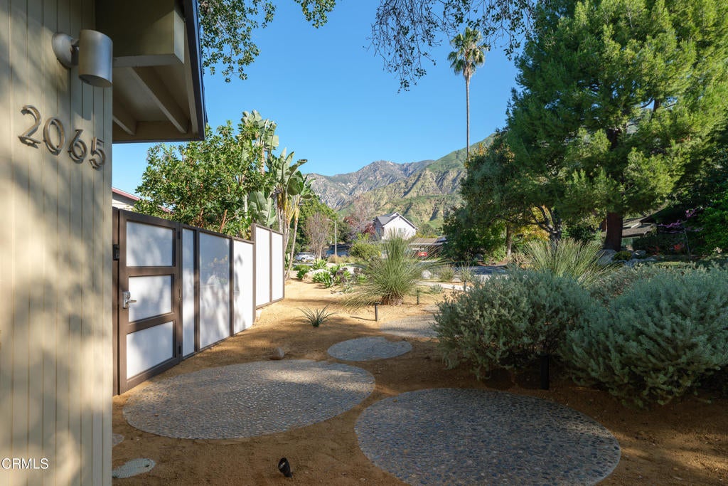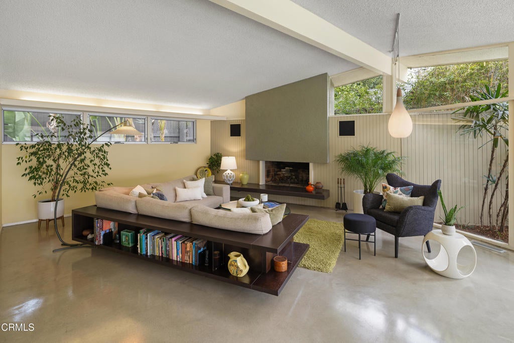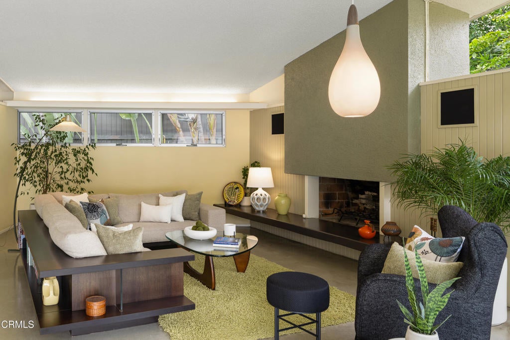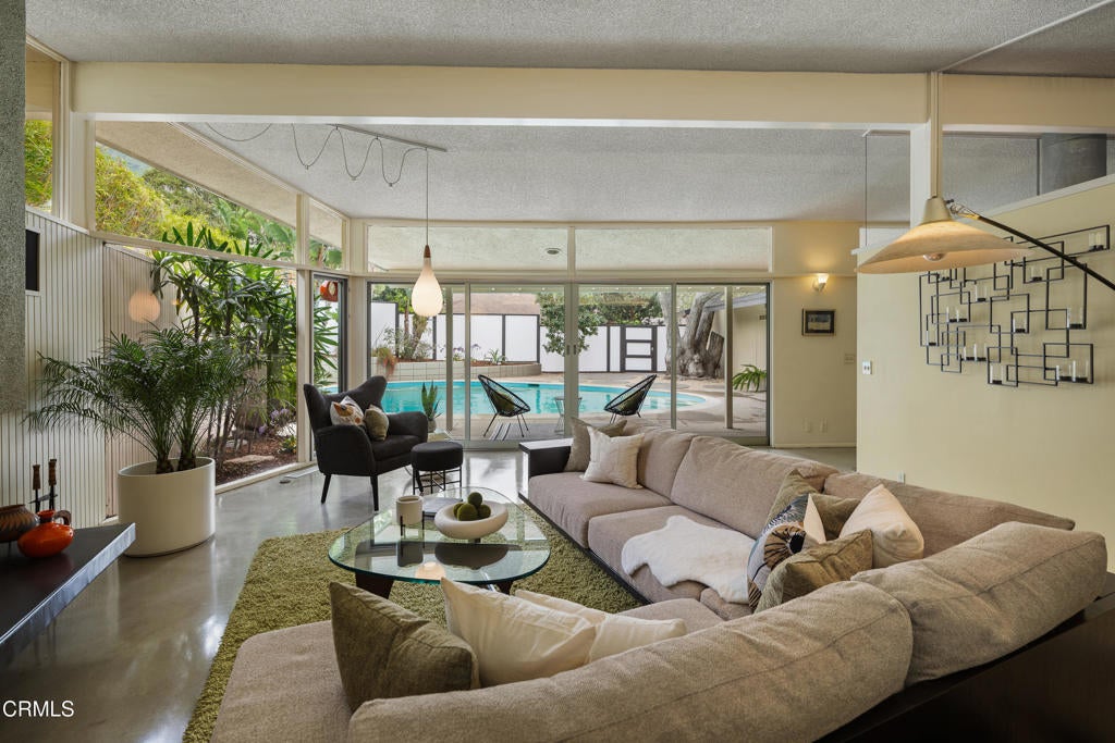 Designed by noted Southern California architect David A. Lopez, this exceptional Mid-Century Modern residence showcases the defining elements of the era, clean lines, expansive glass, & seamless indoor/outdoor living. Located within the desirable Fox Ridge Estates, the home reflects Lopez's signature design principles that helped shape residential architecture in the 50's & 60's. Architectural character is immediately evident with horizontal lines, drought-tolerant landscaping & a distinctive pool courtyard that creates a striking first impression. The front yard features a pool & sundeck framed by wood-trimmed, translucent fencing that provides light, privacy & visual appeal. A classic mid-century-style front door opens into polished concrete floors & a soaring pitched ceiling with a central exposed wood beam. The living room highlights Mid-Century Modern design with floor-to-ceiling glass walls, built-in speakers & sliding doors to the pool patio. A bold fireplace with an elevated, concrete hearth anchors the room with sculptural elegance. The open kitchen & dining area continue the home's architectural rhythm. A U-shaped island with stone countertops provides bar seating, while classic cabinetry, an electric cooktop, in-wall double ovens & a stainless steel refrigerator blend vintage style with modern function. The dining room, centered by a wood beam, opens through sliding doors to both the pool deck & a private patio, capturing the era's signature indoor/outdoor flow. Built-in buffet cabinetry with soft downlighting adds style & storage. Two secondary bedrooms occupy one wing, each with vaulted ceilings, expansive windows & clean architectural lines. A stylishly updated bathroom includes tile flooring, a modern vanity & a glass-enclosed shower with full-height tile. Privately set on the opposite side of the home, the spacious primary suite offers clerestory-style windows for natural light & privacy, a river-rock fireplace hearth, built-in cabinetry & pocket doors. The ensuite bath features retro-inspired flooring, a floating dual-sink vanity, generous closet space & a tub-shower combination. Additional features include an attached 2-car garage equipped with a Level 2 Electric Vehicle charger, a workshop area, polished concrete flooring in key living spaces, central HVAC, a cleverly integrated garden closet & thoughtfully maintained landscaping that complements the architecture. A rare opportunity to own an authentic Mid-Century Modern gem in Pasadena.