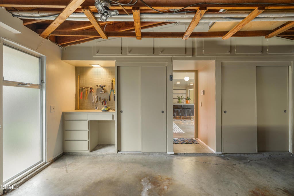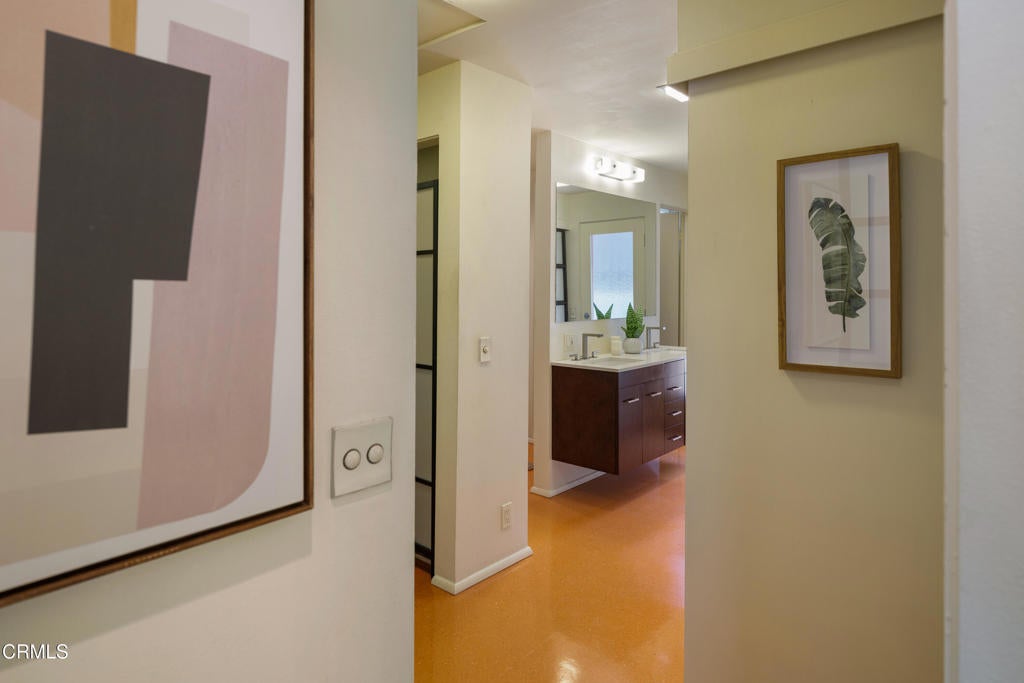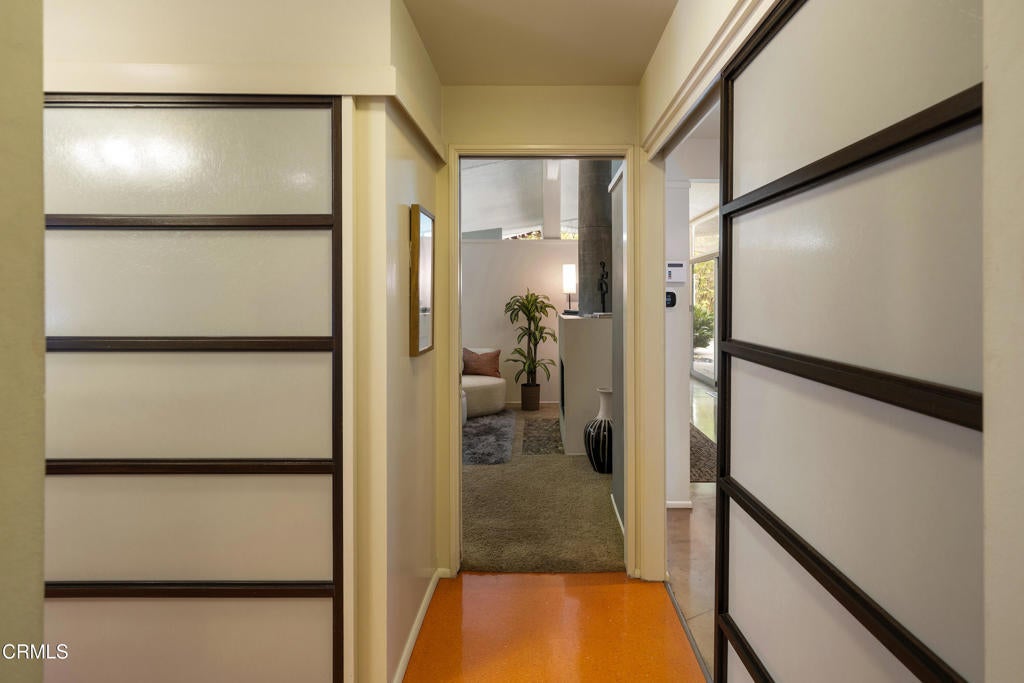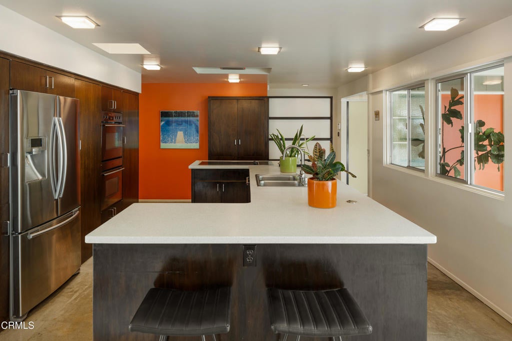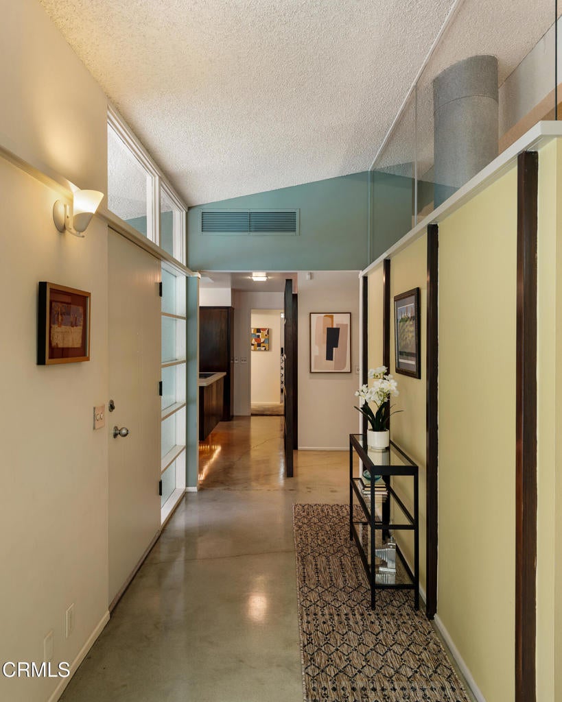 Designed by noted Southern California architect David A. Lopez, this exceptional Mid-Century Modern residence showcases the defining elements of the era, clean lines, expansive glass, & seamless indoor/outdoor living. Located within the desirable Fox Ridge Estates, the home reflects Lopez's signature design principles that helped shape residential architecture in the 50's & 60's. Architectural character is immediately evident with horizontal lines, drought-tolerant landscaping & a distinctive pool courtyard that creates a striking first impression. The front yard features a pool & sundeck framed by wood-trimmed, translucent fencing that provides light, privacy & visual appeal. A classic mid-century-style front door opens into polished concrete floors & a soaring pitched ceiling with a central exposed wood beam. The living room highlights Mid-Century Modern design with floor-to-ceiling glass walls, built-in speakers & sliding doors to the pool patio. A bold fireplace with an elevated, concrete hearth anchors the room with sculptural elegance. The open kitchen & dining area continue the home's architectural rhythm. A U-shaped island with stone countertops provides bar seating, while classic cabinetry, an electric cooktop, in-wall double ovens & a stainless steel refrigerator blend vintage style with modern function. The dining room, centered by a wood beam, opens through sliding doors to both the pool deck & a private patio, capturing the era's signature indoor/outdoor flow. Built-in buffet cabinetry with soft downlighting adds style & storage. Two secondary bedrooms occupy one wing, each with vaulted ceilings, expansive windows & clean architectural lines. A stylishly updated bathroom includes tile flooring, a modern vanity & a glass-enclosed shower with full-height tile. Privately set on the opposite side of the home, the spacious primary suite offers clerestory-style windows for natural light & privacy, a river-rock fireplace hearth, built-in cabinetry & pocket doors. The ensuite bath features retro-inspired flooring, a floating dual-sink vanity, generous closet space & a tub-shower combination. Additional features include an attached 2-car garage equipped with a Level 2 Electric Vehicle charger, a workshop area, polished concrete flooring in key living spaces, central HVAC, a cleverly integrated garden closet & thoughtfully maintained landscaping that complements the architecture. A rare opportunity to own an authentic Mid-Century Modern gem in Pasadena.