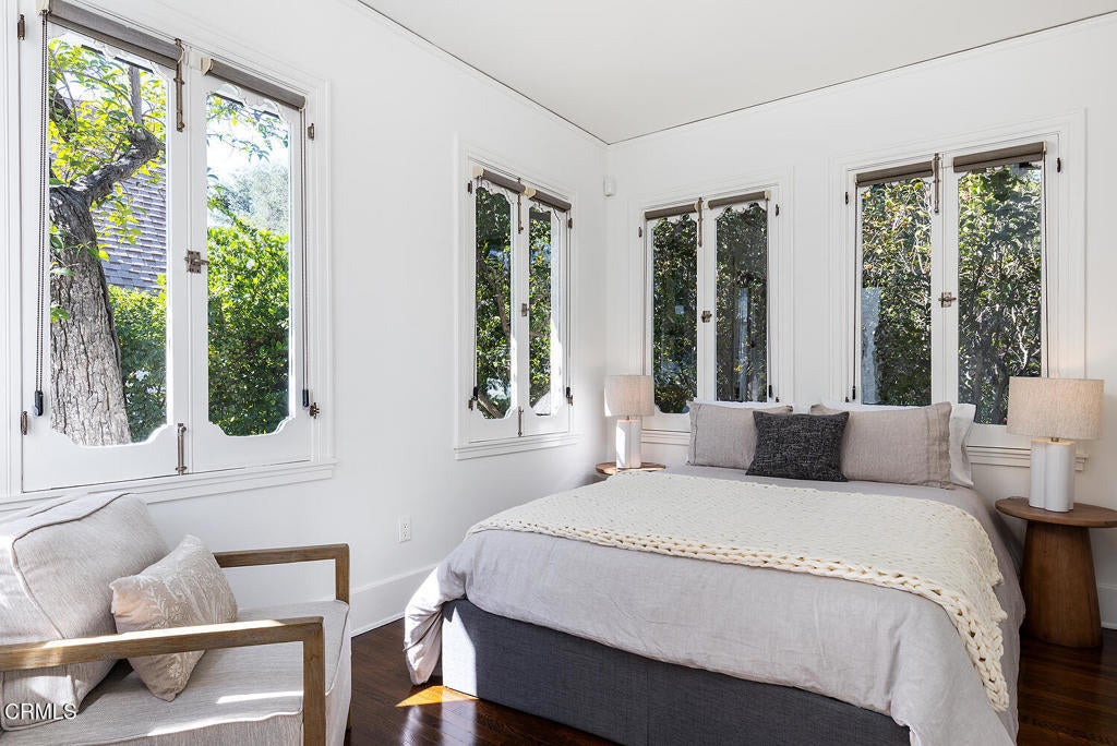This 1921 Italian Renaissance Revival Villa epitomizes historic Altadena. Built by designer Pasquale de Rosa, friend of the legendary Zane Grey, this exquisite compound on over half an acre is a work of art. Sited to enjoy spectacular mountain views, the property includes a main residence, guest quarters, barn studio, and beautiful gardens. There is beauty to be found everywhere here, in the natural surroundings to the classical symmetry and curves. Featuring an H-shaped plan, the home's distinctive roofline is defined by its rounded gables, sculptural carved rafter tails, and starburst oculi at the east and west of the facade. Three french doors at the entry elevation boast views through the central living room, and open to a harmonious floor plan. Connecting public and private spaces, while enjoying access to patios and gardens to the north and south, the room is anchored by a decorative fireplace, rich carved mahogany woodwork, and original candelabra sconces. An elegant formal dining room features coved ceilings and french doors, flowing naturally into an updated eat-in kitchen, while a quiet sitting room with its own decorative fireplace enjoys views and direct outdoor access. Throughout the property, details are exquisite: custom plaster moulding, elaborate trim and baseboards, and carved wood frames on casement windows and doors speak to the vision and craft of the original builder. The 2,875 SF main house offers four bedrooms, including two generous primary bedrooms, one with a full ensuite bath, the other with french doors opening to the backyard gardens. The gardens are magical, with a grassy lawn framed by sculptural conifers, fruit trees, a cactus garden, roses, gardenias, and fragrant herbs, with the majestic San Gabriels in the background. A large filtered koi pond and a separate decorative pond peacefully ground the space. The separate 632 SF back house with guest studio upstairs has handsome tongue and groove wood paneling, with a three-quarter bath, laundry and a garage with storage on the ground floor. Lastly, the onetime barn, now a studio, opens a world of possibilities as a home gym, gardener's studio, or future office. 1275 New York Drive is a once-in-a-lifetime opportunity to own a landmark property of genuine architectural significance in one of the Foothills' most cherished neighborhoods. Minutes from restaurants, coffee shops, retail and the cultural attractions of Altadena and downtown Pasadena, this home is extraordinary.
