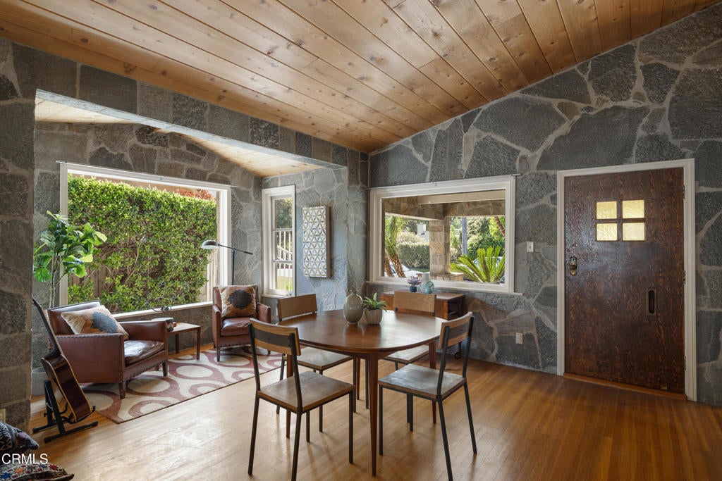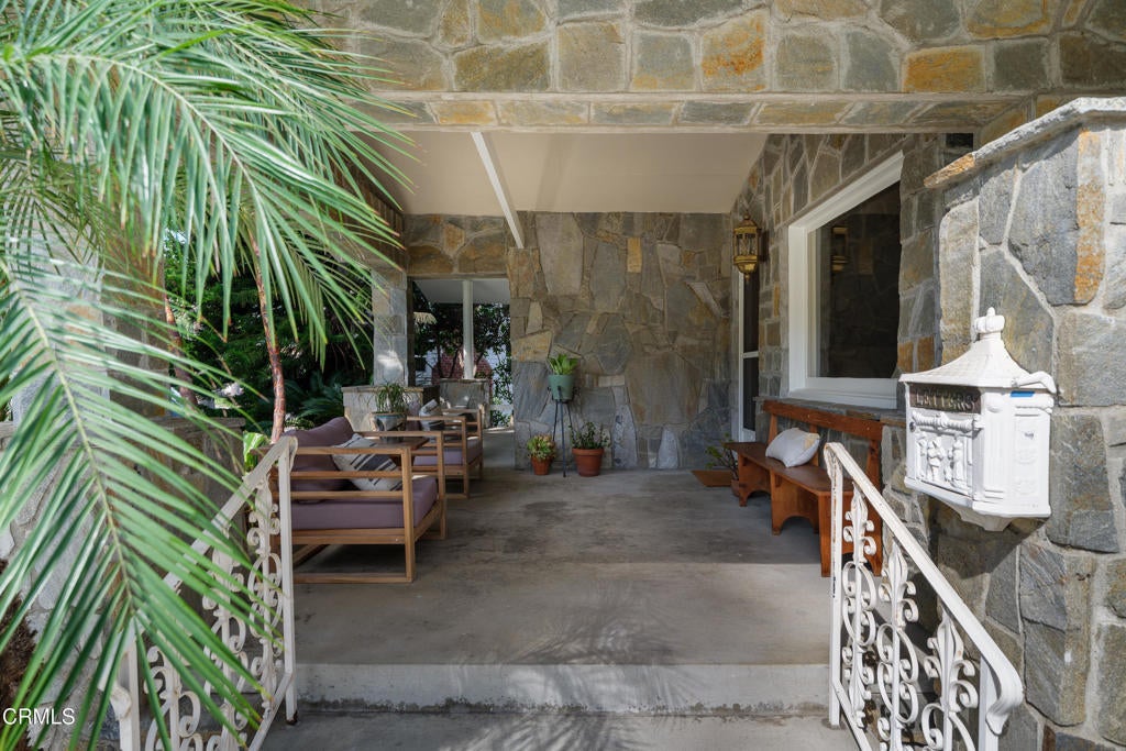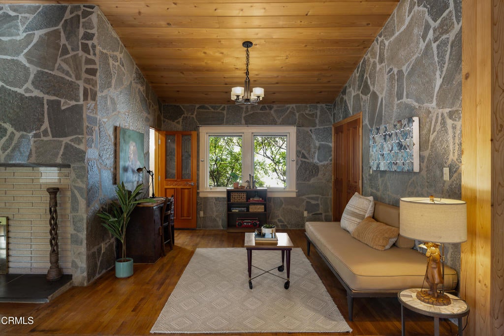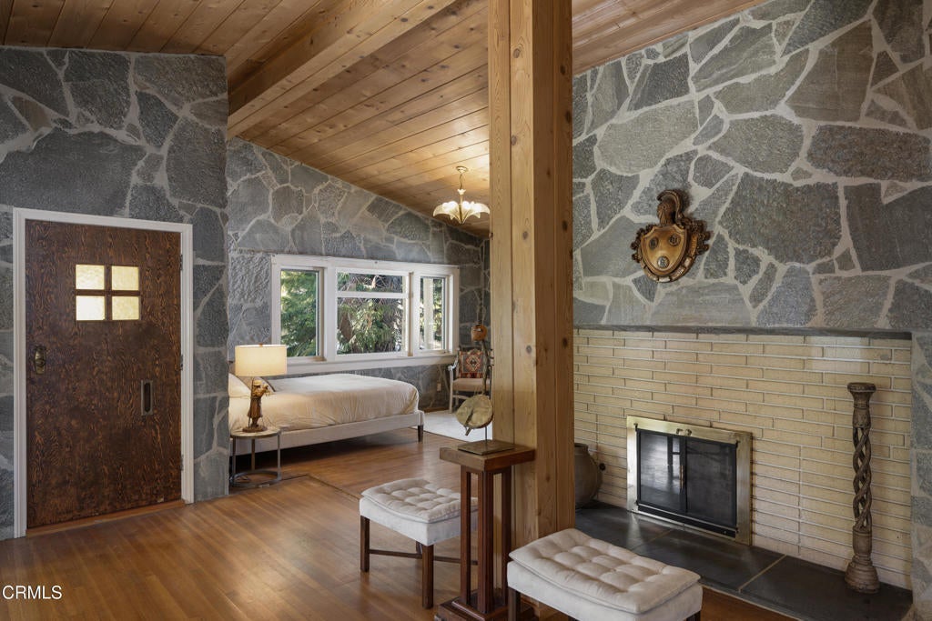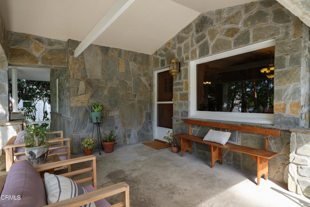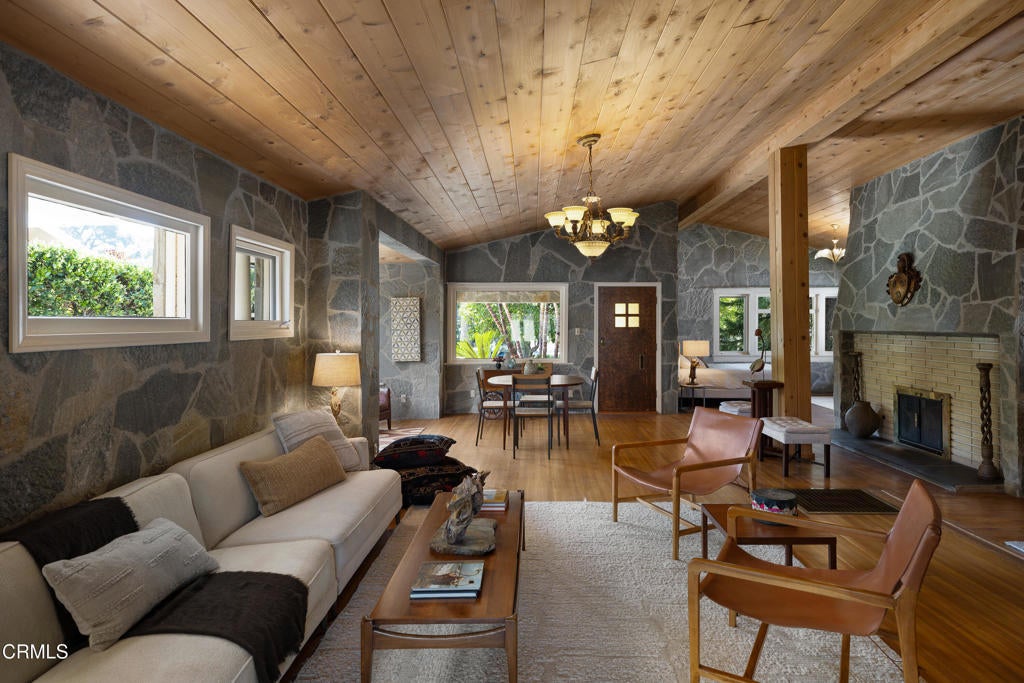 Craftsman character and creative license converge in this 1913 bungalow which has been transformed into an open concept residence with lofted ceilings and an extensive veneer of bouquet canyon flagstone inside and out. The broad, covered front porch hearkens to an age when neighbors gathered in the shade to capture the cool breezes. Mature plants and trees populate the gardens. Let your imagination flow without restraint in this once 2-bedroom 1 bath home, which feels like an artist's cabin in the woods. A stately oak front door opens to original hardwood floors which reveal the traces of change, and newer windows face mature greenery in all directions. A massive fireplace is the center of the home, and an updated bath is tucked away between sleeping areas. The kitchen and breakfast room are at the rear of the home and lead to a backyard just waiting for a new adaption. Once a 2-car garage with a workroom, only the walls remain, creating an open-air courtyard with a towering chimney right in the middle. An existing half bath was capped off, and this structure may serve as the footprint for a future ADU. A garden room and built-in barbecue area are at the rear parcel. This property is part of a trust sale, with no further probate or court confirmation required.
