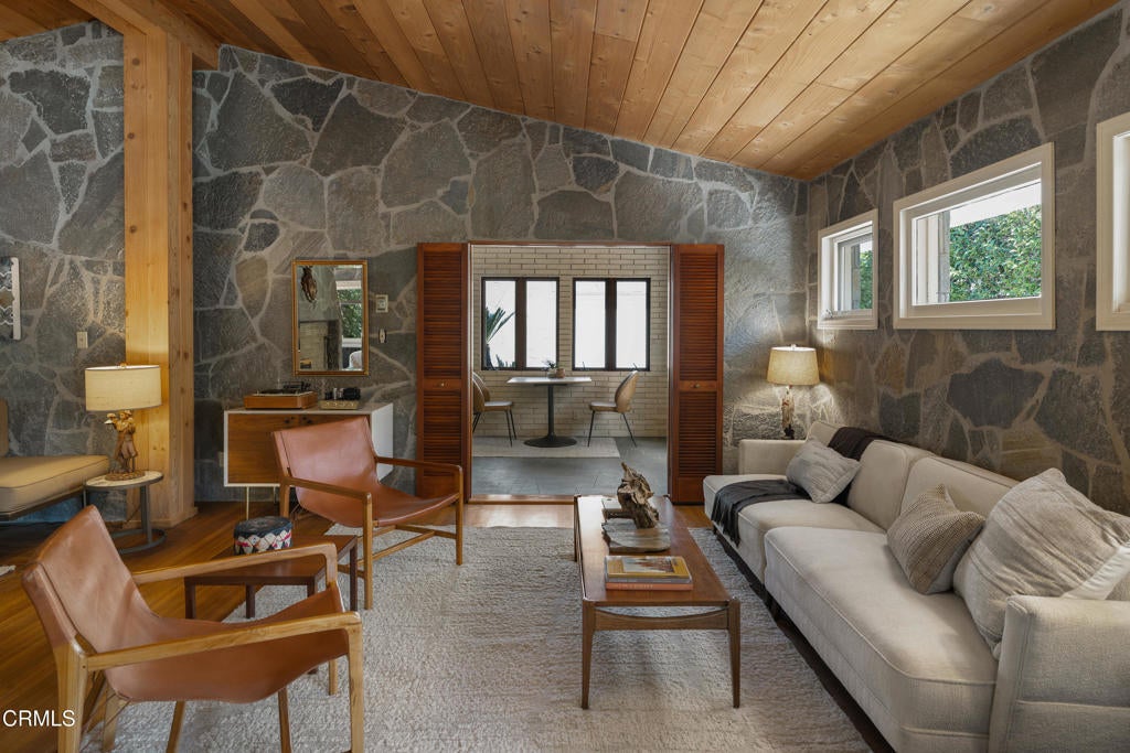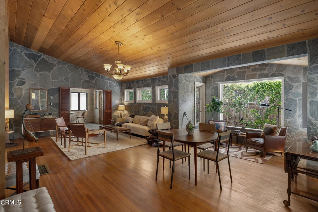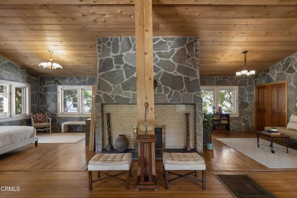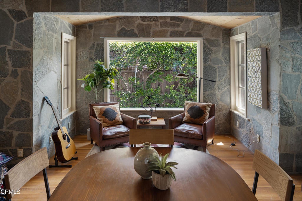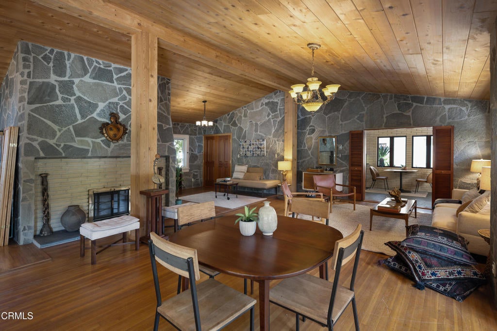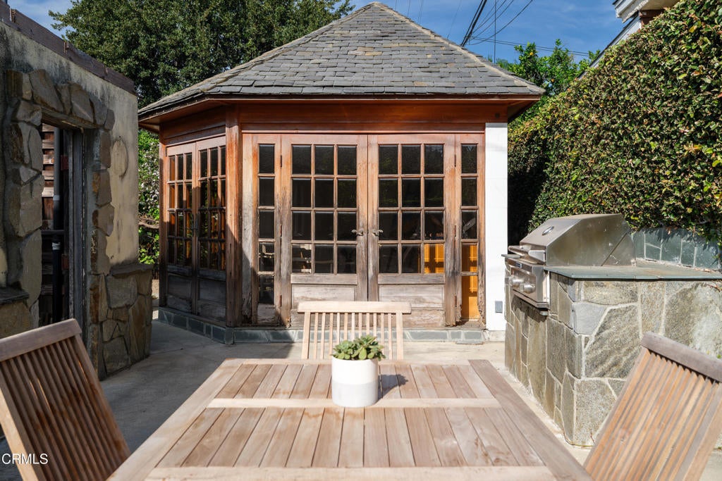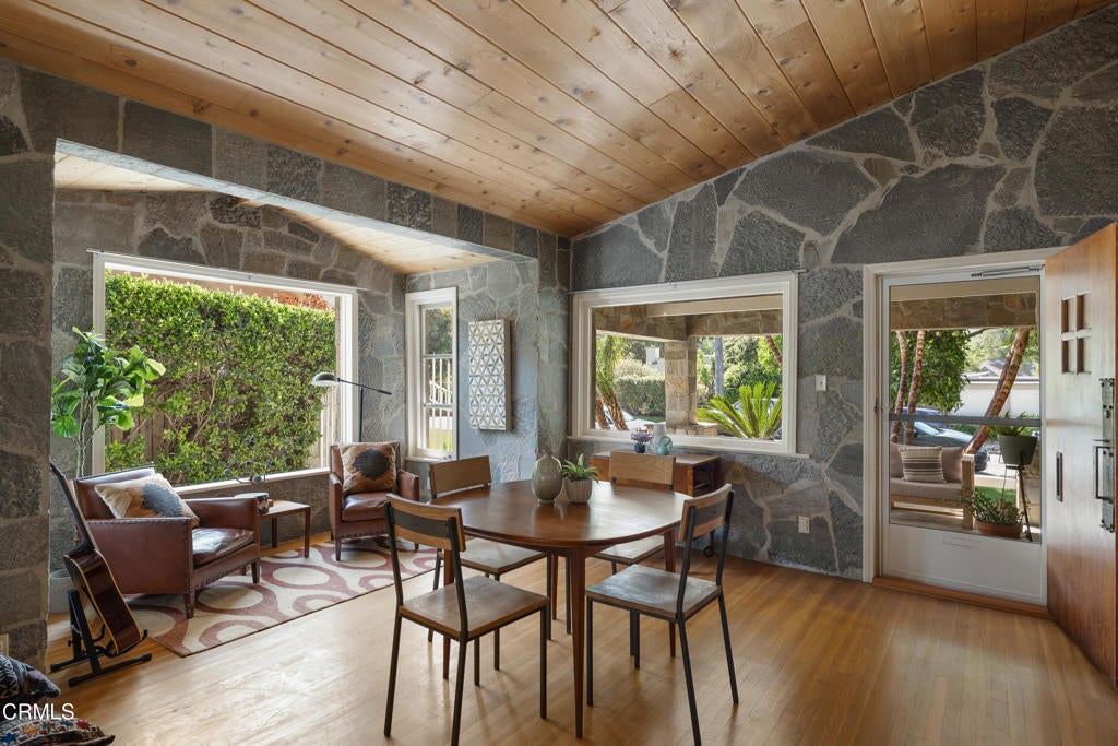Craftsman character and creative license converge in this 1913 bungalow which has been transformed into an open concept residence with lofted ceilings and an extensive veneer of bouquet canyon flagstone inside and out. The broad, covered front porch hearkens to an age when neighbors gathered in the shade to capture the cool breezes. Mature plants and trees populate the gardens. Let your imagination flow without restraint in this once 2-bedroom 1 bath home, which feels like an artist's cabin in the woods. A stately oak front door opens to original hardwood floors which reveal the traces of change, and newer windows face mature greenery in all directions. A massive fireplace is the center of the home, and an updated bath is tucked away between sleeping areas. The kitchen and breakfast room are at the rear of the home and lead to a backyard just waiting for a new adaption. Once a 2-car garage with a workroom, only the walls remain, creating an open-air courtyard with a towering chimney right in the middle. An existing half bath was capped off, and this structure may serve as the footprint for a future ADU. A garden room and built-in barbecue area are at the rear parcel. This property is part of a trust sale, with no further probate or court confirmation required.