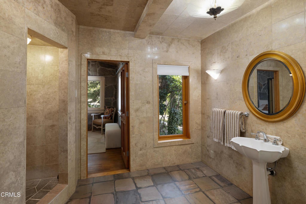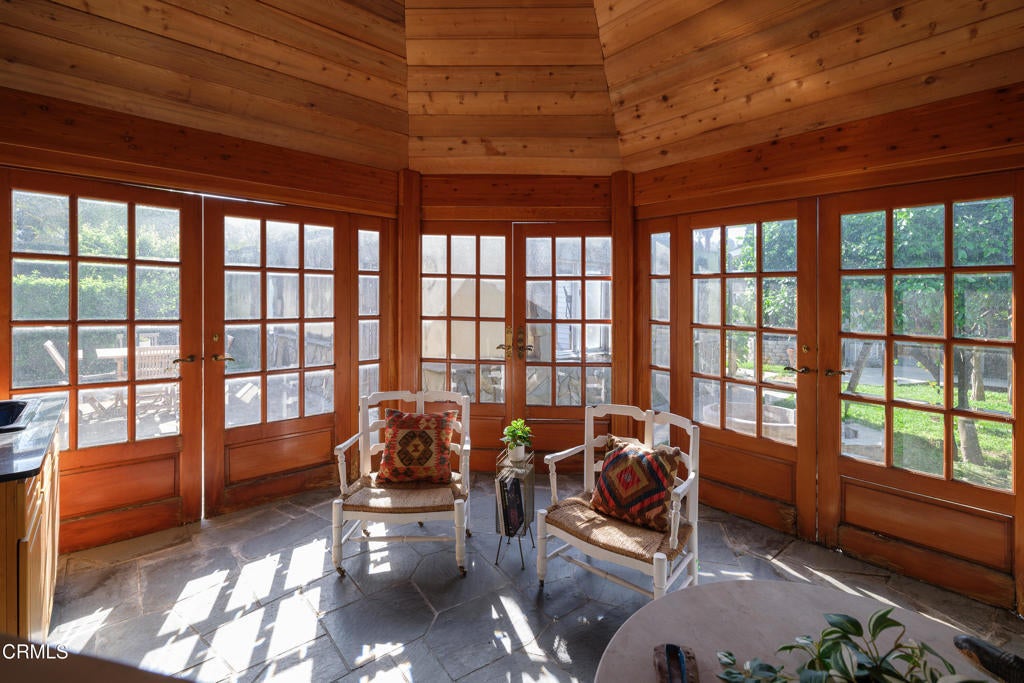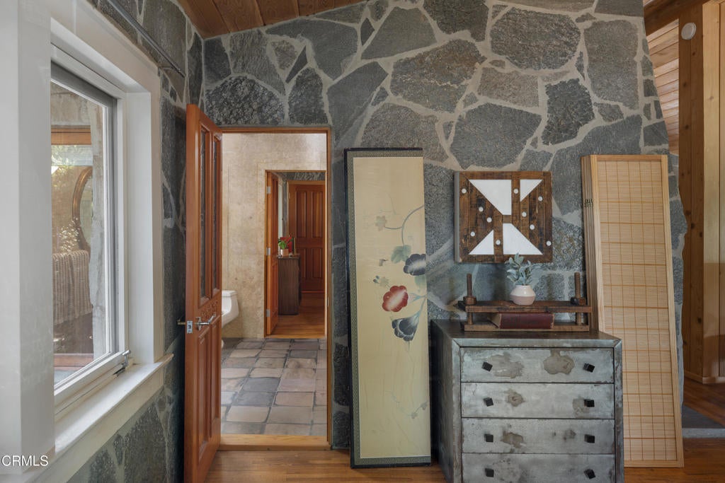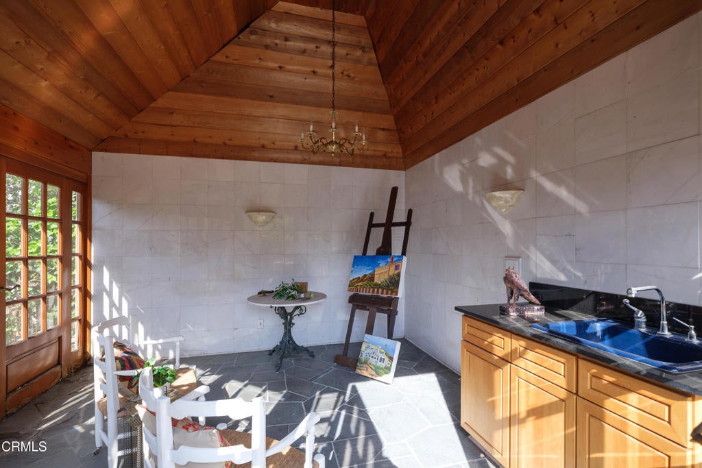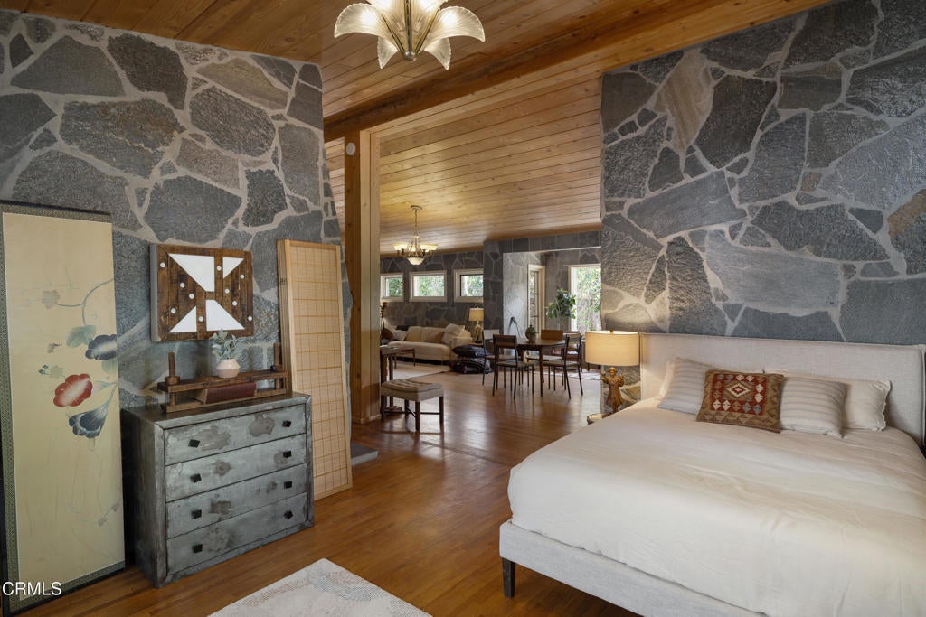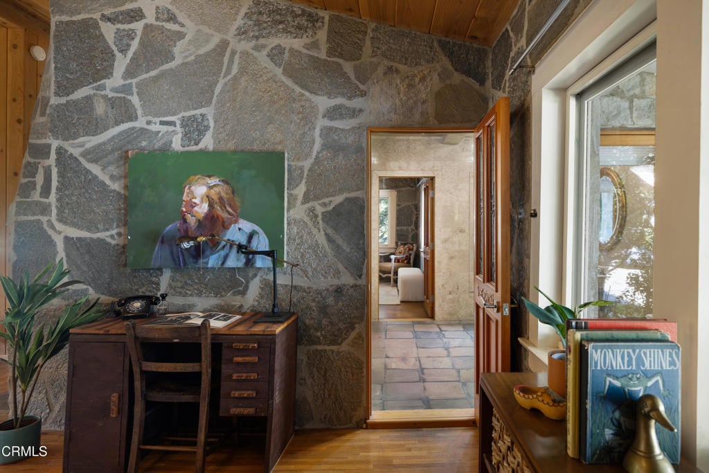 Craftsman character and creative license converge in this 1913 bungalow which has been transformed into an open concept residence with lofted ceilings and an extensive veneer of bouquet canyon flagstone inside and out. The broad, covered front porch hearkens to an age when neighbors gathered in the shade to capture the cool breezes. Mature plants and trees populate the gardens. Let your imagination flow without restraint in this once 2-bedroom 1 bath home, which feels like an artist's cabin in the woods. A stately oak front door opens to original hardwood floors which reveal the traces of change, and newer windows face mature greenery in all directions. A massive fireplace is the center of the home, and an updated bath is tucked away between sleeping areas. The kitchen and breakfast room are at the rear of the home and lead to a backyard just waiting for a new adaption. Once a 2-car garage with a workroom, only the walls remain, creating an open-air courtyard with a towering chimney right in the middle. An existing half bath was capped off, and this structure may serve as the footprint for a future ADU. A garden room and built-in barbecue area are at the rear parcel. This property is part of a trust sale, with no further probate or court confirmation required.