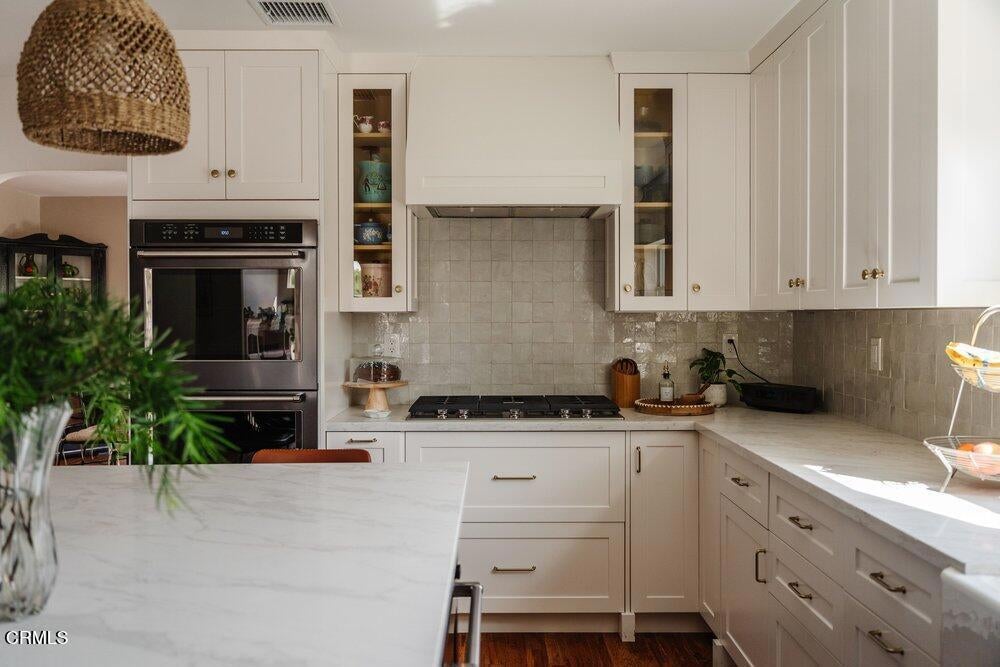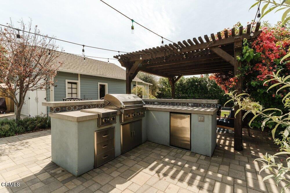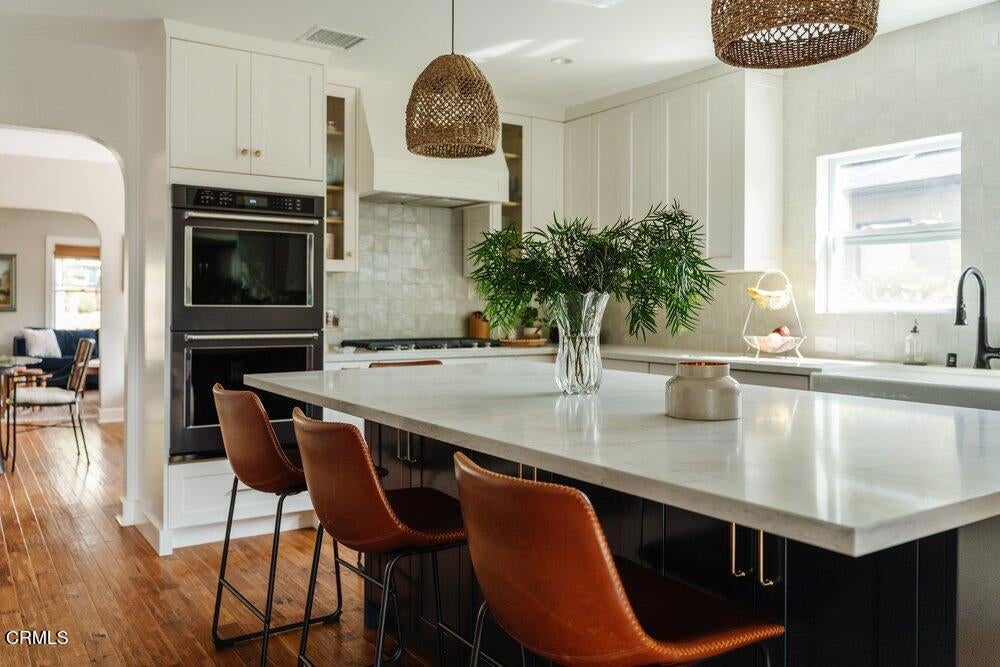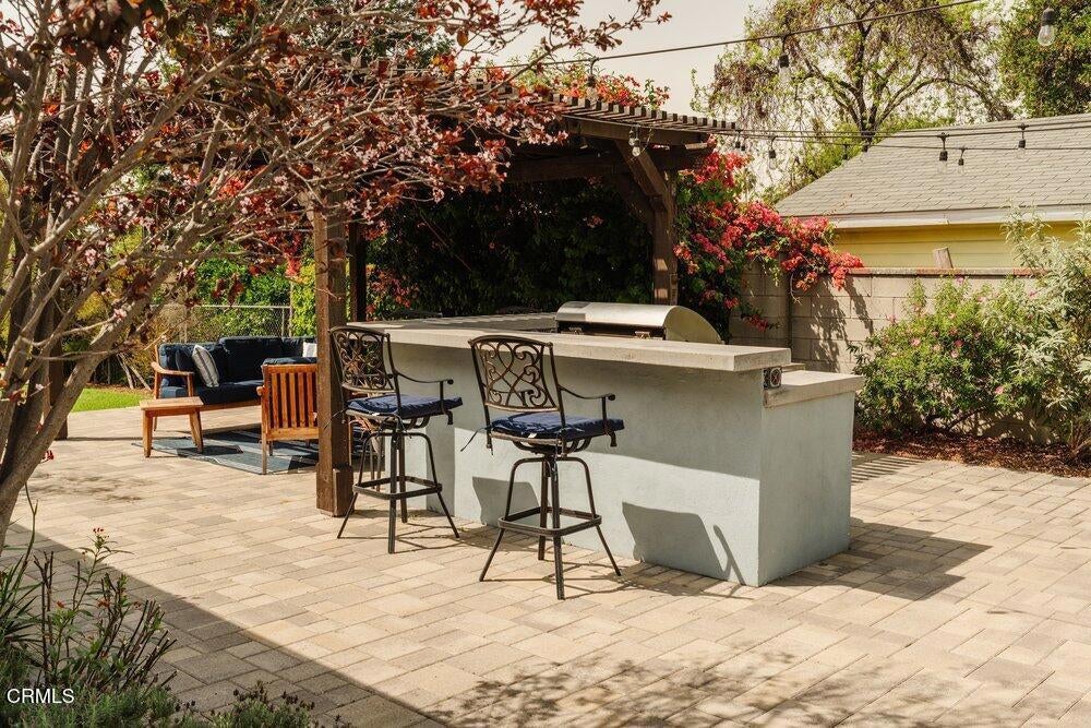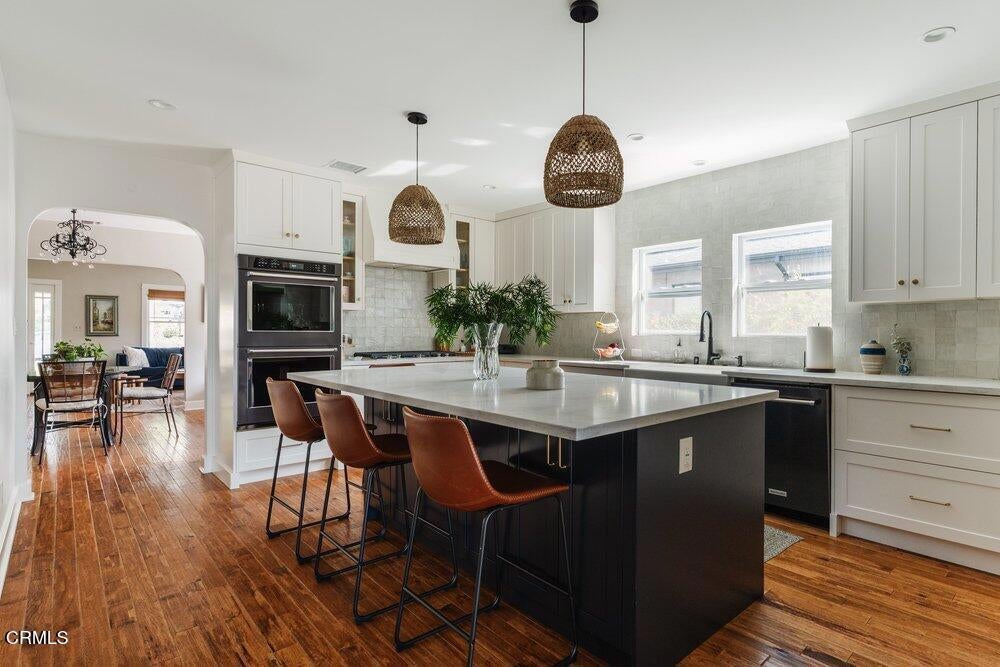 This bright & refreshing 3-bed, 3-bath Bungalow was meticulously remodeled over the years, blending timeless style with modern upgrades. The living room features an elegant tile fireplace flanked by precious built-in cabinets & striking Alaskan Hickory hardwood flooring that flows out into the rest of the living areas. A graceful archway introduces an inviting dining room with a pair of picture windows that embrace the door to a cozy outdoor sitting area. The kitchen was impressively remodeled in 2024 with a stunning backsplash made of hand-crafted Moroccan Zellige tile, quartz countertops, farmhouse sink & an 8-foot quartz island, a 5-burner gas stove, double oven, wine fridge, & built-in microwave. All three bathrooms were carefully remodeled down to the studs, one with pristine floor-to-ceiling marble tile in the shower, the others with trendy subway tiles. The glass sliders in the generous family room open to an extensively remodeled & landscaped backyard--boasting a charming pergola-covered patio and a fully equipped outdoor kitchen with a gas-plumbed 32' grill, dual side burners, refrigerator, stainless steel storage drawers, and ambient lighting. The yard is perfected by a luxurious saltwater pool in the distance, featuring PebbleTec finish, heater, and updated decking--a breathtaking & versatile space built for both simple relaxation & hosting large get-togethers!
