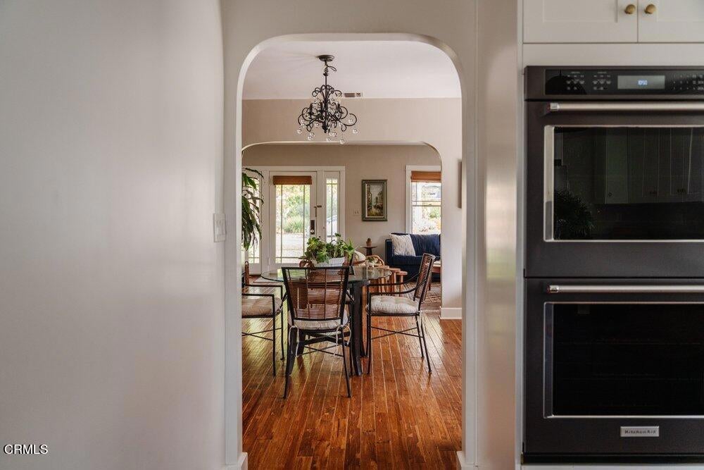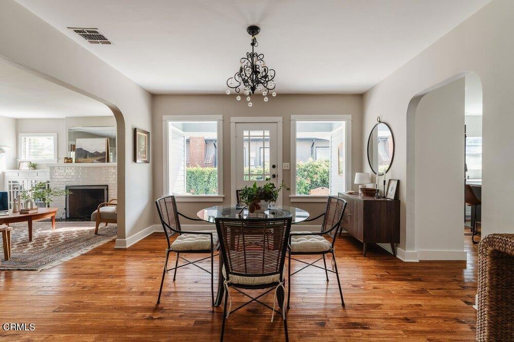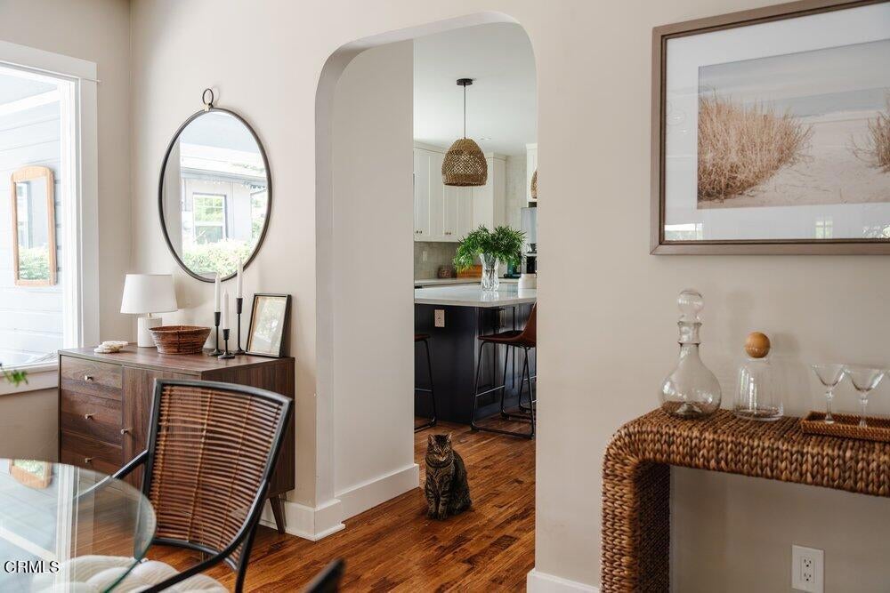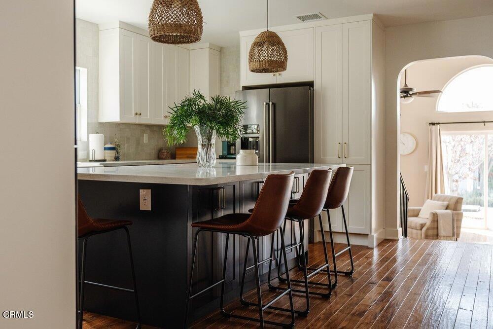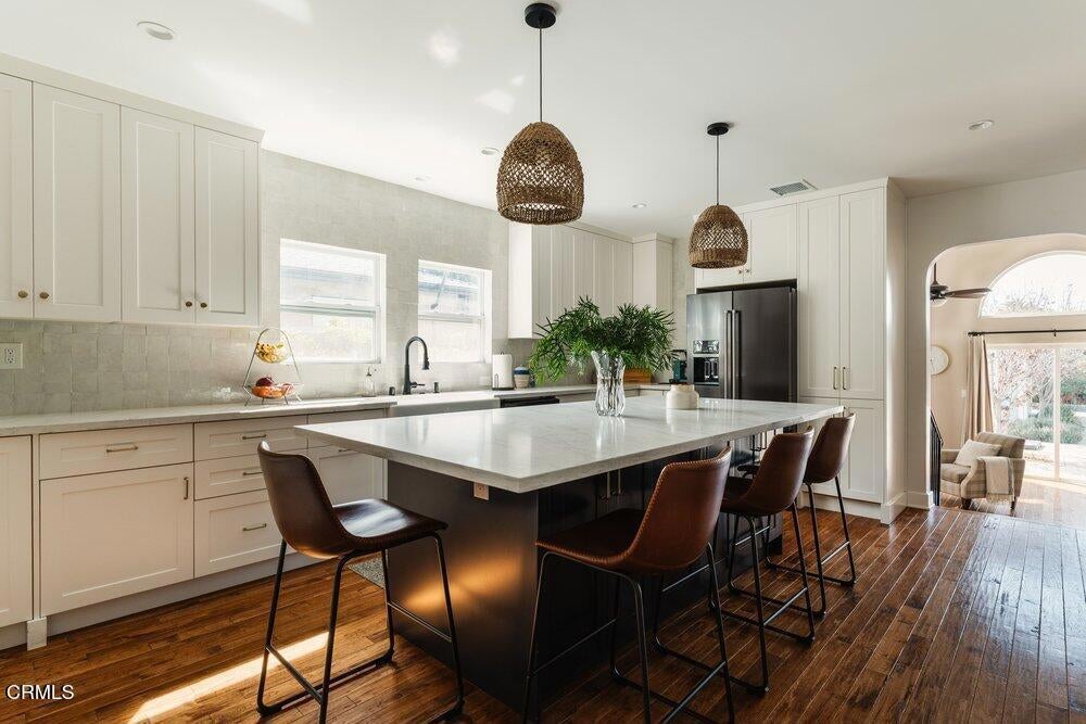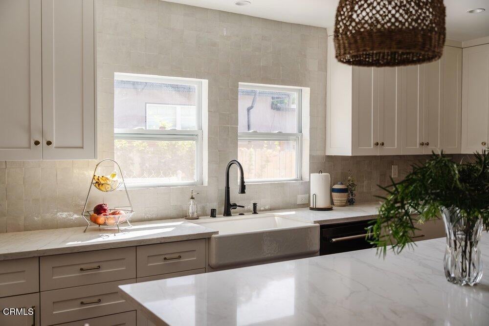 This bright & refreshing 3-bed, 3-bath Bungalow was meticulously remodeled over the years, blending timeless style with modern upgrades. The living room features an elegant tile fireplace flanked by precious built-in cabinets & striking Alaskan Hickory hardwood flooring that flows out into the rest of the living areas. A graceful archway introduces an inviting dining room with a pair of picture windows that embrace the door to a cozy outdoor sitting area. The kitchen was impressively remodeled in 2024 with a stunning backsplash made of hand-crafted Moroccan Zellige tile, quartz countertops, farmhouse sink & an 8-foot quartz island, a 5-burner gas stove, double oven, wine fridge, & built-in microwave. All three bathrooms were carefully remodeled down to the studs, one with pristine floor-to-ceiling marble tile in the shower, the others with trendy subway tiles. The glass sliders in the generous family room open to an extensively remodeled & landscaped backyard--boasting a charming pergola-covered patio and a fully equipped outdoor kitchen with a gas-plumbed 32' grill, dual side burners, refrigerator, stainless steel storage drawers, and ambient lighting. The yard is perfected by a luxurious saltwater pool in the distance, featuring PebbleTec finish, heater, and updated decking--a breathtaking & versatile space built for both simple relaxation & hosting large get-togethers!