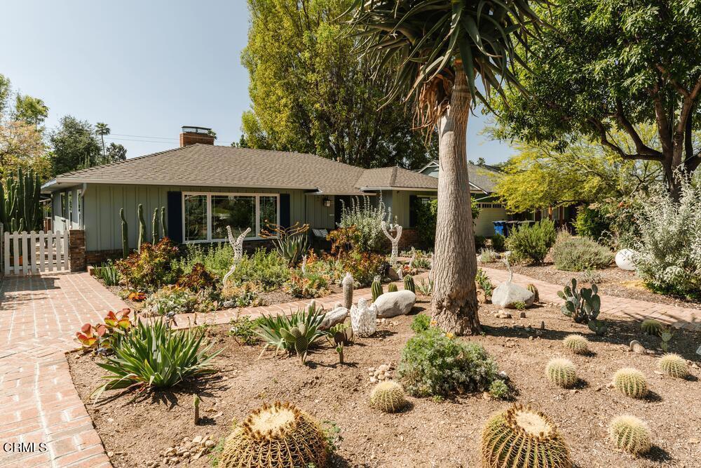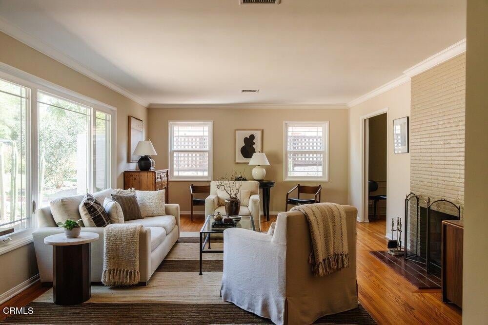 This graceful Traditional home is nestled in a quiet neighborhood close to the Altadena golf course. Inside, enjoy a bright living room with an elegant picture window, a floor-to-ceiling brick fireplace, and gleaming hardwood floors. The formal dining room embellished with wainscotting leads to both the family room & kitchen. Take in the lush backyard through the expansive corner window in this stylish kitchen with navy cabinets, Bianco Carrara countertops & rustic Saltillo tile floors. The spacious family room features yet another fireplace & French doors that open to the outdoors, creating a seamless indoor-outdoor transition. Three spacious bedrooms & two bathrooms complete this comfortable floorplan. The main bathroom has been redesigned with a large vanity & dramatic finishes. Outside, the deck is complete with a convenient BBQ area, ideal for entertaining. The backyard has been lovingly landscaped to feel like a private oasis. Meander down the path to a shaded pergola where you can relax & enjoy the abundant greenery & stunning pond. And tucked just behind the garage is a wonderful office space measuring 222 sqft!