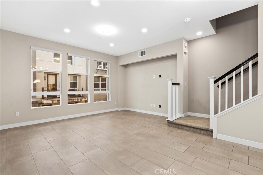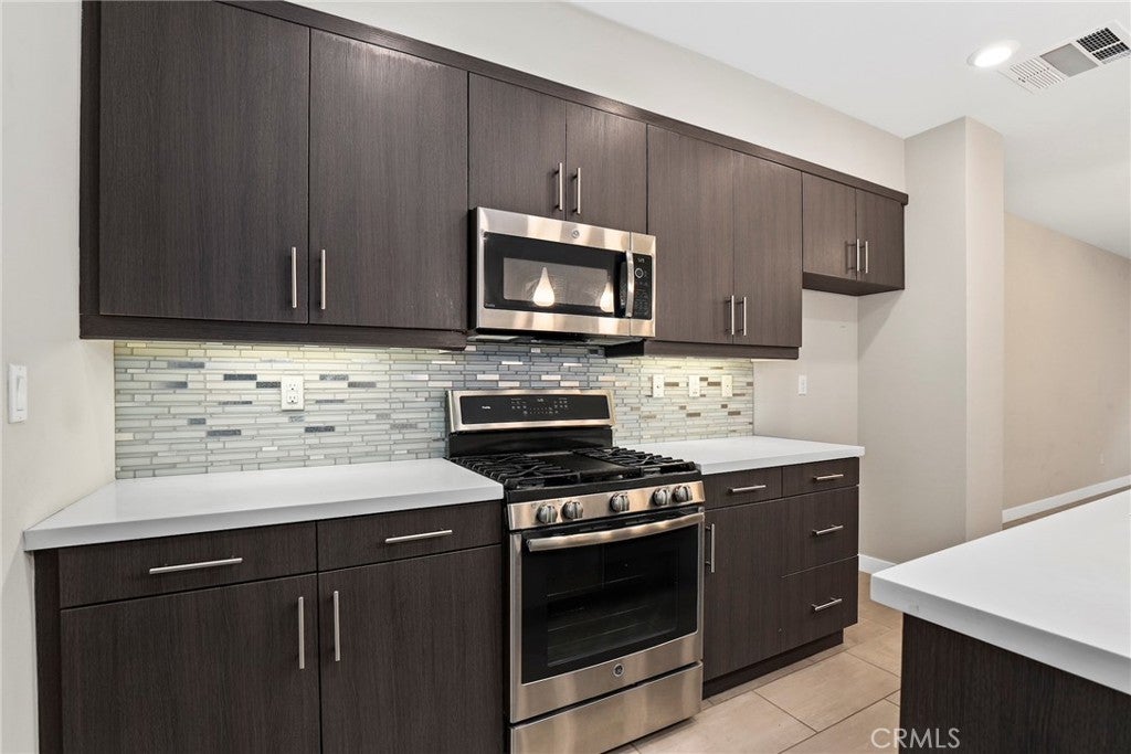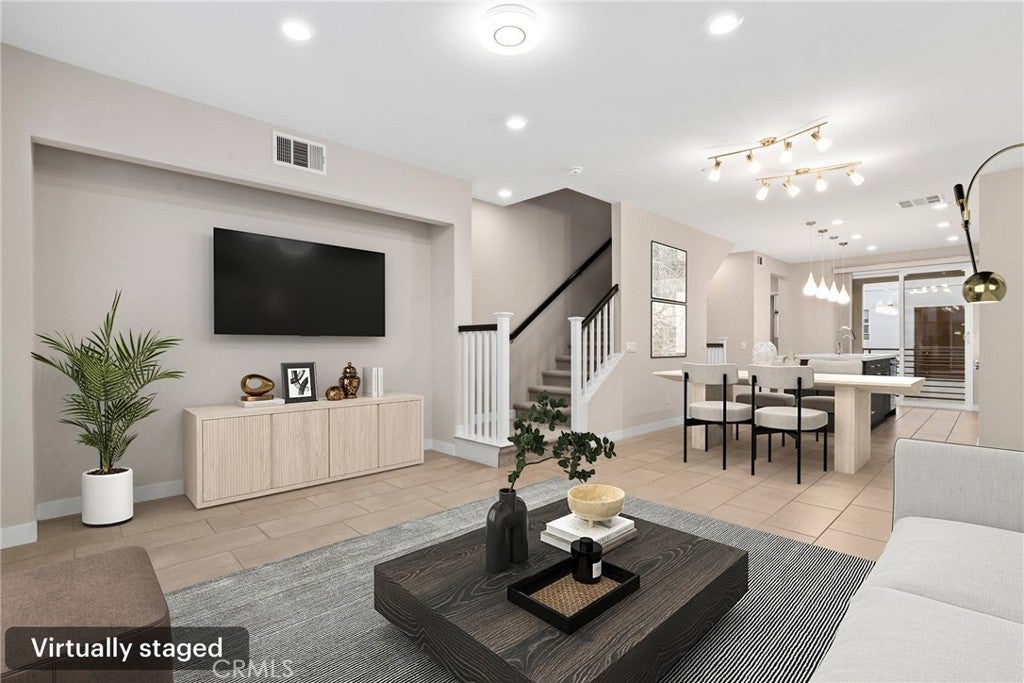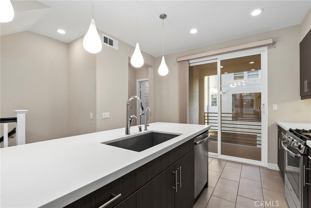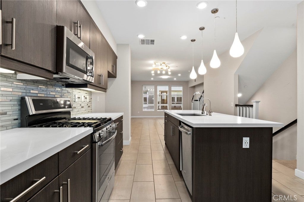 Experience modern comfort and style in this stunning tri-level home featuring 3 bedrooms, each with its own private bathroom—including a first-floor suite ideal for in-laws or guests. Enjoy energy-efficient mini-split A/C on the first floor, abundant natural light, tile flooring, recessed lighting, and Levolor zebra blinds throughout the main levels. The open-concept kitchen is a showstopper with stainless steel appliances, quartz countertops, sleek contemporary cabinetry with underlighting, a gas stove, built-in microwave, dishwasher, stylish backsplash, storage island, modern pendant lighting, pantry, and sliding doors leading to a covered balcony—perfect for relaxing or entertaining. Upstairs, the primary bedroom impresses with ample closet space and an elegant en suite boasting a dual-sink vanity, water closet, custom tilework, and glass-enclosed shower. A second upper-level bedroom provides comfort and privacy with its own en suite and spacious closet. Additional highlights include an attached 2-car garage with motion lights and a 220V 14/50 EV charger, guest parking inside the gated community, top-floor laundry, tankless water heater, whole-house water softener, 7-stage reverse osmosis filtration system, humidity-sensor exhaust fans, enhanced sound insulation, premium Moen and Kohler fixtures, and custom built-ins.