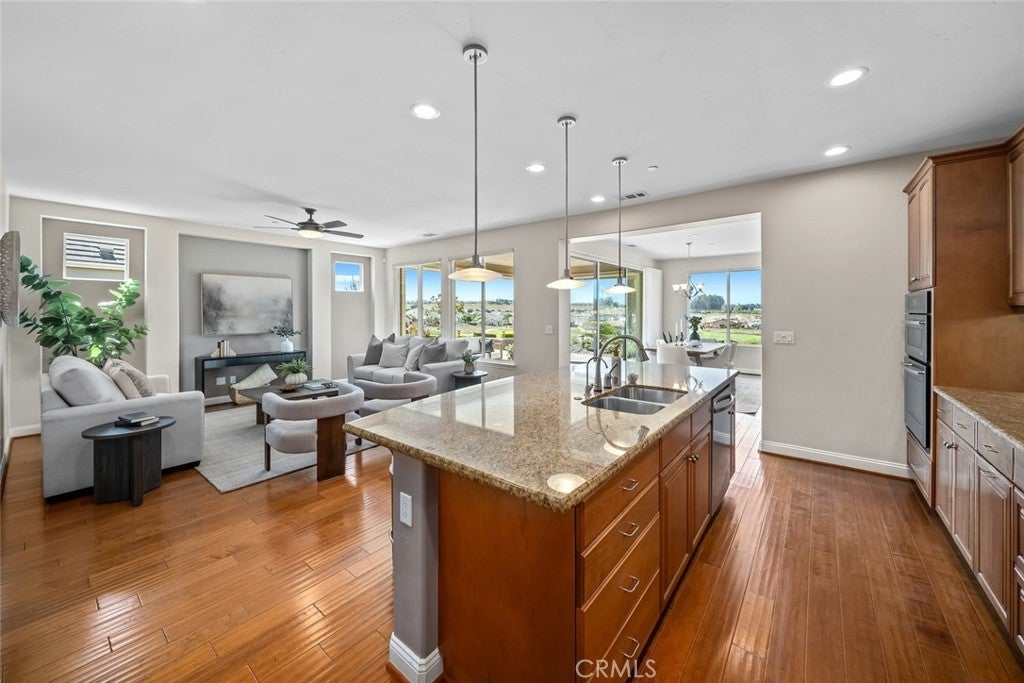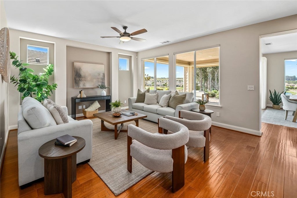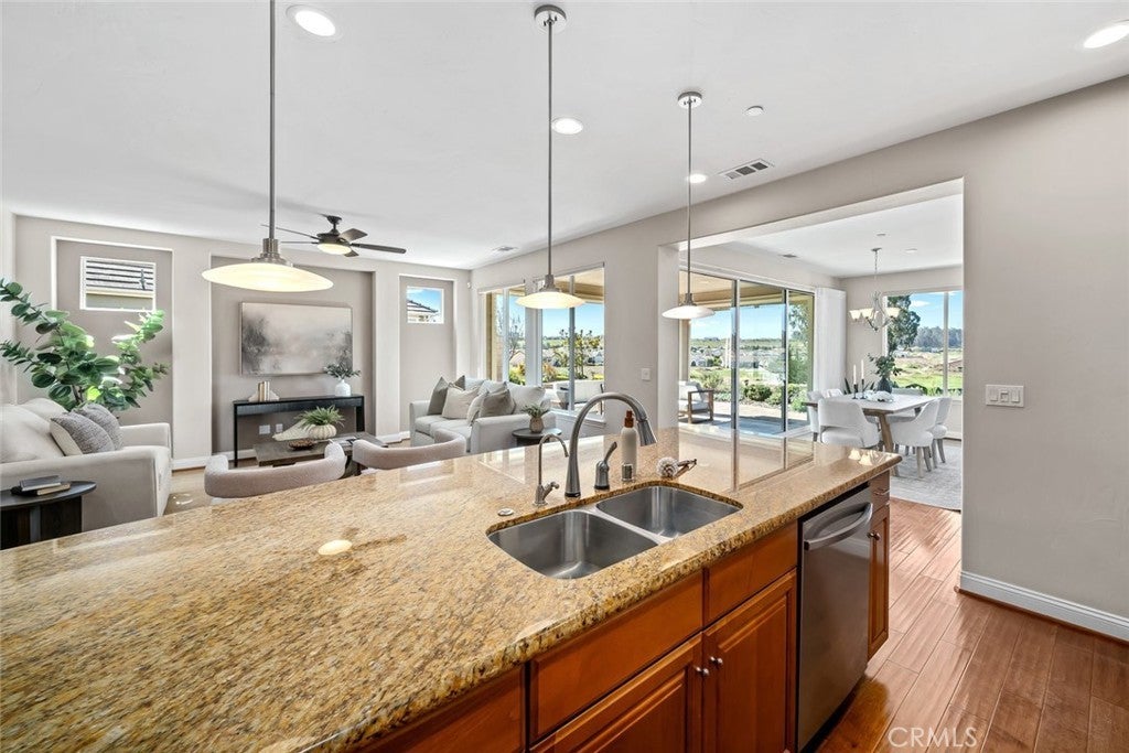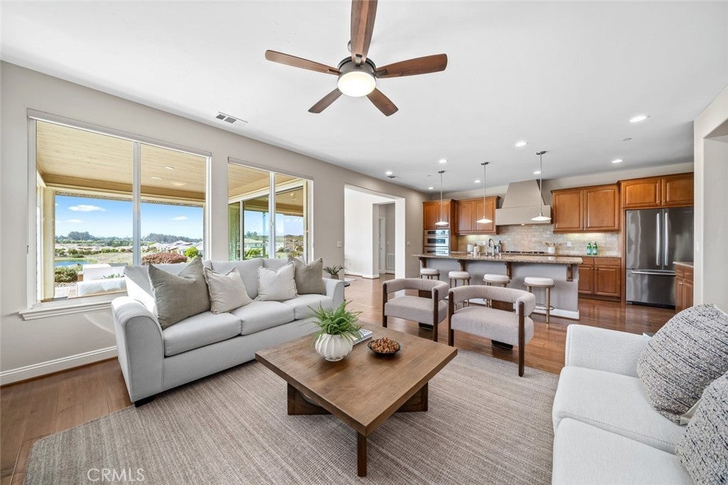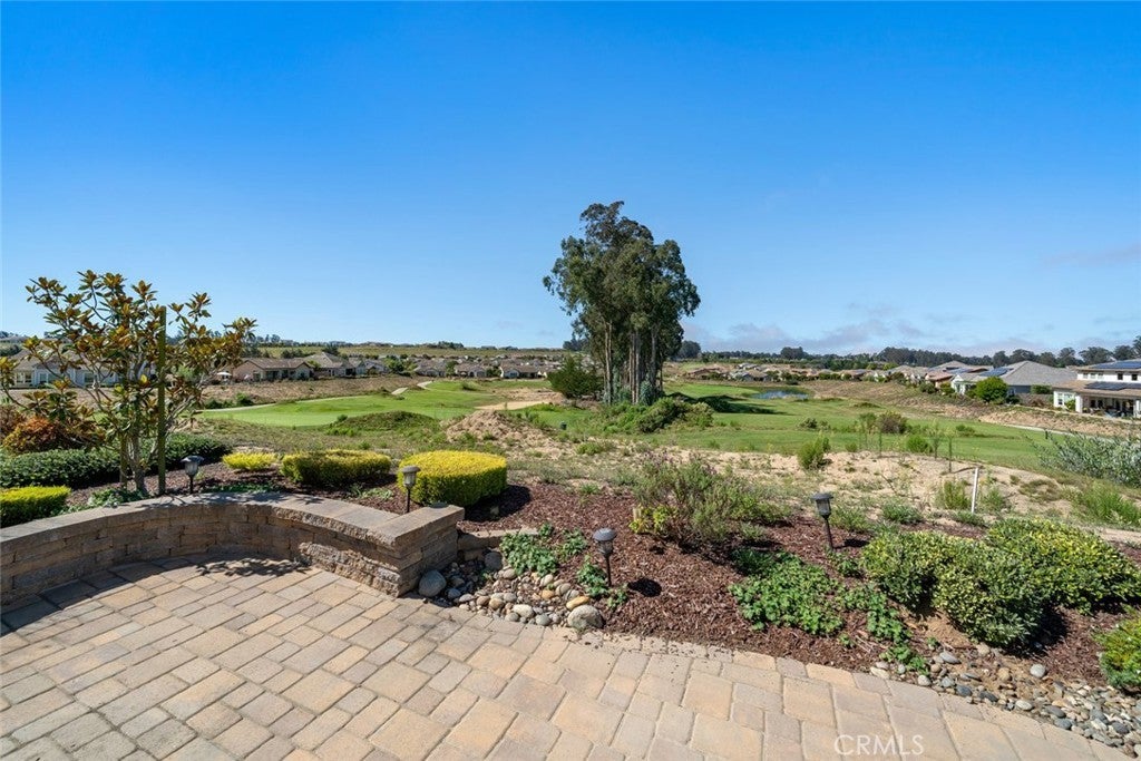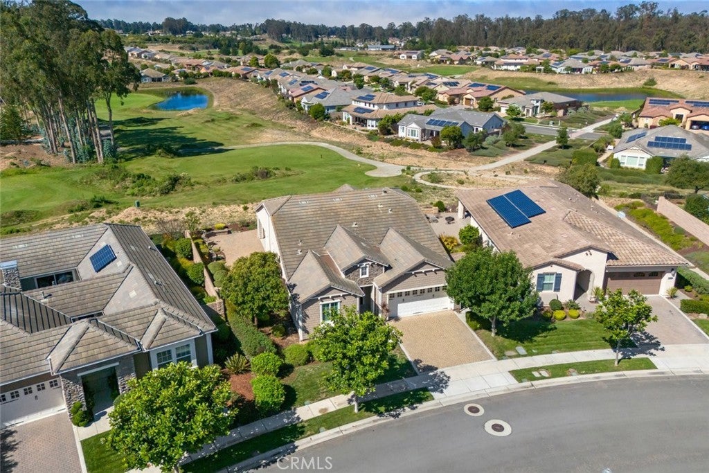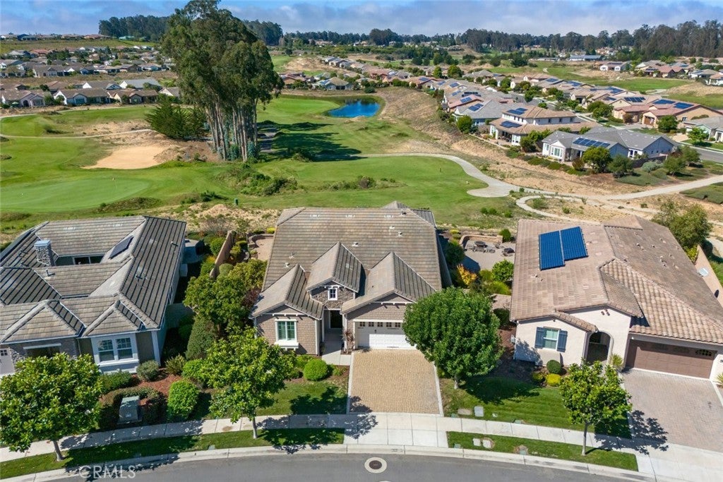 Resort living begins in this California Coastal “Nice” floor-plan home, beautifully situated on a very desirable cul-de-sac with a birds-eye panoramic view of the 5th, 6th and 7th holes of the Challenge Golf Course, plus the magnificent coastal sunsets. This 1,945 sq. ft. home, built in 2014, offers 2 bedrooms, 2 full bathrooms, plus a den with French door enclosure. Designer upgrades abound, including gorgeous hand scraped engineered wood floors, sweeping granite island with custom lighting, plantation shutters, ceiling fans and a rolling wall of glass providing exquisite views. Enter the gallery hallway and head toward the culinary kitchen - you’ll love the raised panel cabinetry, granite countertops and island, tile backsplash, JennAir stainless steel appliances, including a 5-burner cooktop and a walk-in pantry - it’s a chefs dream! Around the corner is the coveted SmartSpace/laundry, designed for optimum organization with a built-in desk, storage cabinets and countertops - it’s a great space for working from home or enjoying your favorite hobbies. Across from the kitchen is a super comfortable living room with a spacious den next door, and a large dining room with loads of natural light and incredible views. Head outside the rolling wall of glass to the covered patio - it’s the perfect spot to relax and enjoy the incredible central coast sunsets. The patio is surrounded by gorgeous, lush landscaping which frames the breathtaking golf course and lake views, and features plenty of hardscape space to entertain family and friends. Meandering pathways lead to the side yards, one outfitted with a raised garden bed. When it’s time to head indoors you can retire to your luxurious owner’s suite with a spacious bedroom which overlooks the backyard, and an en-suite bathroom with separate dual sinks, tile shower with seamless glass enclosure, and a large walk-in closet. Your guests will enjoy the comfort of their own wing with a light and airy bedroom and a full bath with tub/shower. In addition, there’s energy-efficient solar and a 2-car garage. Best of all, this spectacular home is located in Trilogy with all the amenities to fully enjoy life on the Central Coast.