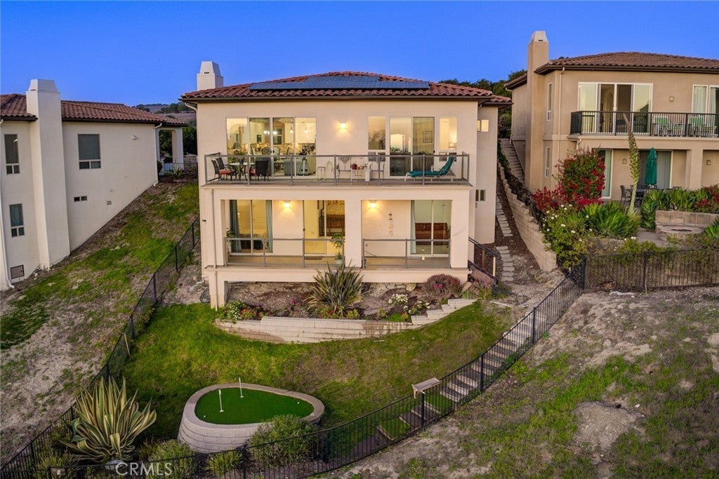 Welcome to Las Ventanas del Mar – a private enclave of homes overlooking the scenic Ocean Views through Price Canyon. Built just ten years ago, this community was organized to take advantage of views from every home. Gated enclosed entry with covered private patio flows into front foyer with discrete powder room. Perched above the Price House Historical Park, this home offers single-level living with no steps from the garage/entry through the main level that includes a spacious great room with cozy fireplace and open concept kitchen, large laundry/utility room, luxurious primary suite and entertaining decks stretching the whole width of the home. Epicurean kitchen offers plenty of counter space for working, or displaying food – and even a bar area for convenient dining plus high-end GE stainless steel appliances.. Laminate flooring throughout in rich tones make it visually pleasing and easy for pets and children. Primary bath includes tons of storage, dual vanities, large walk in closet and private water closet. Downstairs guests and children enjoy two ensuite bedrooms with deck access and a private living space that also opens to the outdoors. The backyard boasts a terraced yard with custom putting green! Views from almost every room make this a showcase home and an entertainer's dream.