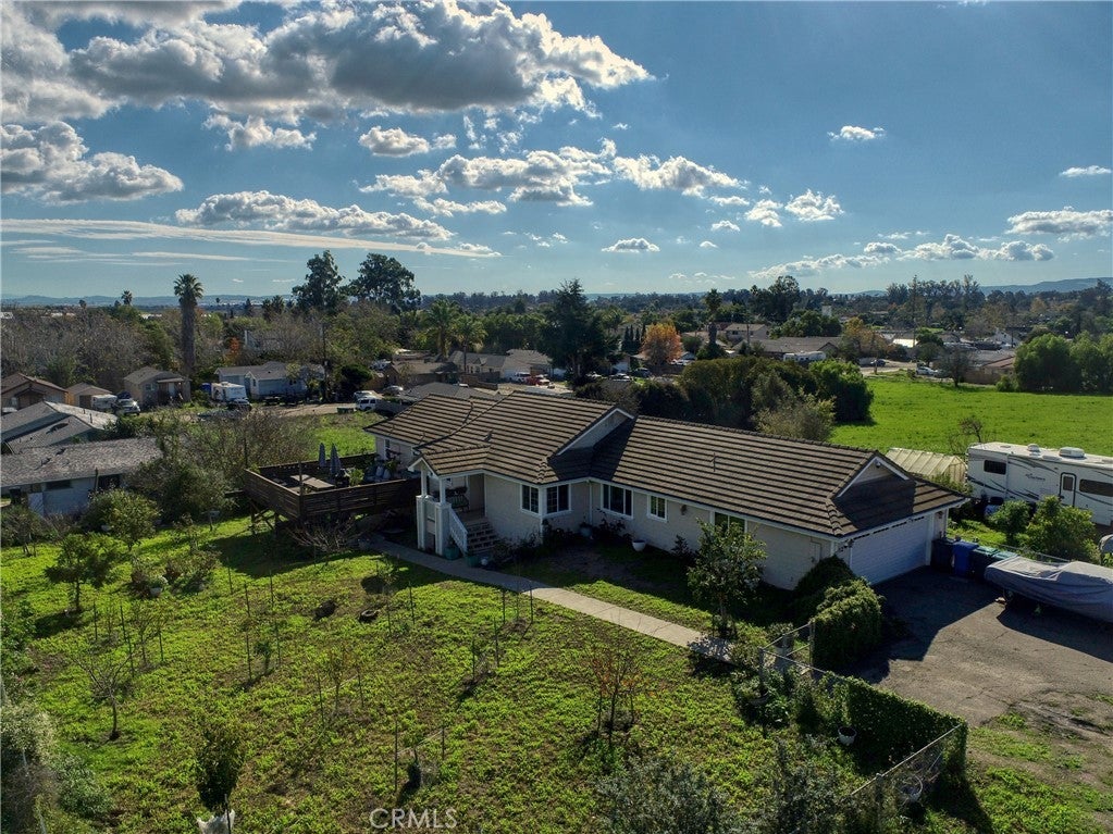 Luxury custom single-level home on expansive double lot with mountain views. Beautifully remodeled and filled with abundant natural light, this 3-bedroom, 3-bath residence sits on a .48-acre legal lot plus an additional adjoining .16-acre parcel included in the sale—offering exceptional space, privacy, and flexibility. The updated kitchen features a farmhouse sink, generous cabinetry, updated fixtures, and large windows overlooking the property. Updated flooring and refreshed fixtures flow throughout, complemented by a repainted interior. Guest and hall bathrooms are updated, with the hall bath featuring a sunken tub. The single-level floor plan includes a private primary suite, spacious living room with picture window, and a bonus office with separate entrance. Enjoy outdoor living with multiple decks and a fully fenced yard ideal for pets and gardening, featuring 22 fruit trees, raised beds, greenhouse, chicken coop, and rainwater collection system. Additional highlights include tile roof, newer water heater, separate laundry room, abundant storage, oversized 2-car garage, RV pad, and ample parking. Two legal parcels in a desirable setting.