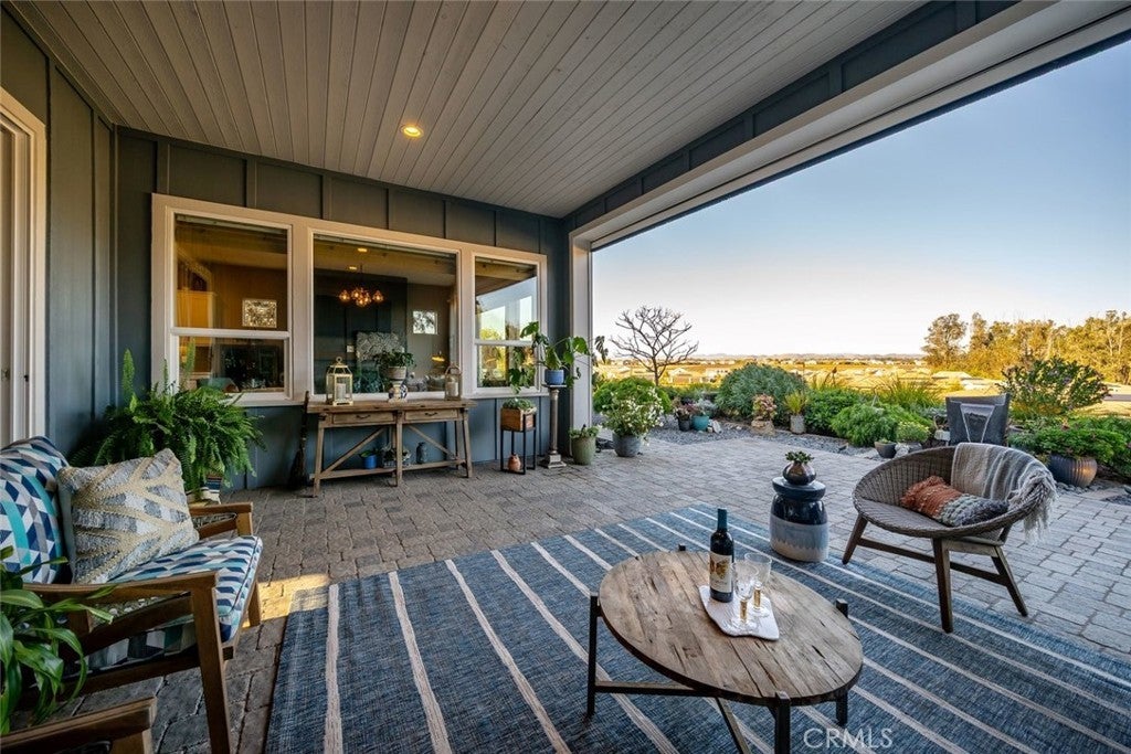 Modern Ranch meets California Coastal in this exquisitely upgraded Ventana floorplan, perfectly positioned to capture sweeping views of the vineyards, the shimmering lake and fountain, and the mountain range that frames the horizon. From sunrise to sunset, the scenery becomes a stunning natural backdrop—ever changing and always captivating. The home’s exceptional curb appeal sets an immediate impression of quality. Fresh exterior paint, stone-accented retaining walls, and a beautifully designed paver courtyard with a tranquil fountain create a welcoming entry that reflects the care and attention invested throughout the property. Inside, the chef’s kitchen features stylish white cabinetry with premium hardware, quartzite slab countertops, a generous island, a built-in refrigerator, and stainless appliances with a sleek range hood. The kitchen opens seamlessly to the great room, where a dramatic floor-to-ceiling stacked-stone fireplace adds warmth and architectural presence. Professionally designed interiors elevate every room. Automatic window treatments, plantation shutters, oak hardwood floors, and wallpaper-accented rooms create a sophisticated aesthetic. The optimized Smart-Space laundry room enhances convenience with custom cabinetry, a sink, and a built-in desk area along with a bay of cabinets in the garage for added storage. The outdoor living experience is a true highlight of this home. The covered patio functions as an additional living room, offering year-round comfort with a drop-down shade and generous space for dining or lounging. Beyond, paver pathways lead to a peaceful sitting area with built-in firepit overlooking the lake and fountain—an ideal vantage point to enjoy the reflection of the sun on the water and the dramatic silhouette of the mountains as the sky shifts throughout the day.