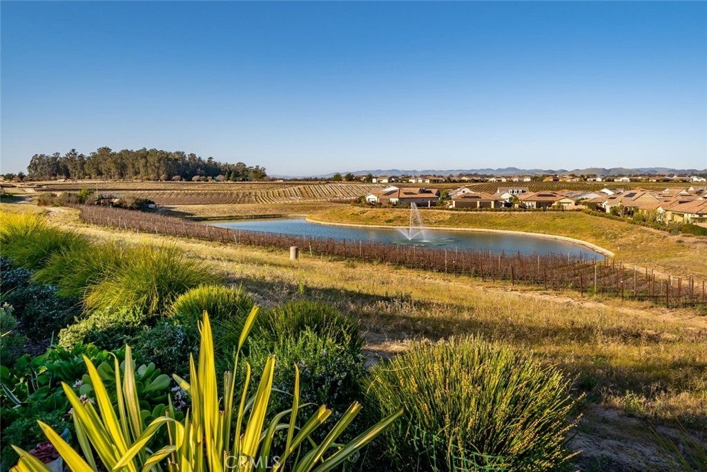 Modern Ranch meets California Coastal in this exquisitely upgraded Ventana floorplan, perfectly positioned to capture sweeping views of the vineyards, the shimmering lake and fountain, and the mountain range that frames the horizon. From sunrise to sunset, the scenery becomes a stunning natural backdrop—ever changing and always captivating. The home’s exceptional curb appeal sets an immediate impression of quality. Fresh exterior paint, stone-accented retaining walls, and a beautifully designed paver courtyard with a tranquil fountain create a welcoming entry that reflects the care and attention invested throughout the property. Inside, the chef’s kitchen features stylish white cabinetry with premium hardware, quartzite slab countertops, a generous island, a built-in refrigerator, and stainless appliances with a sleek range hood. The kitchen opens seamlessly to the great room, where a dramatic floor-to-ceiling stacked-stone fireplace adds warmth and architectural presence. Professionally designed interiors elevate every room. Automatic window treatments, plantation shutters, oak hardwood floors, and wallpaper-accented rooms create a sophisticated aesthetic. The optimized Smart-Space laundry room enhances convenience with custom cabinetry, a sink, and a built-in desk area along with a bay of cabinets in the garage for added storage. The outdoor living experience is a true highlight of this home. The covered patio functions as an additional living room, offering year-round comfort with a drop-down shade and generous space for dining or lounging. Beyond, paver pathways lead to a peaceful sitting area with built-in firepit overlooking the lake and fountain—an ideal vantage point to enjoy the reflection of the sun on the water and the dramatic silhouette of the mountains as the sky shifts throughout the day.