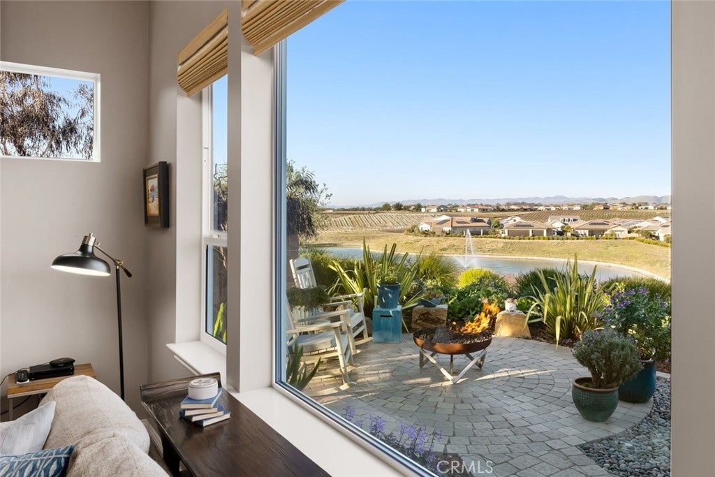 Modern Ranch meets California Coastal in this exquisitely upgraded Ventana floorplan, perfectly positioned to capture sweeping views of the vineyards, the shimmering lake and fountain, and the mountain range that frames the horizon. From sunrise to sunset, the scenery becomes a stunning natural backdrop—ever changing and always captivating. The home’s exceptional curb appeal sets an immediate impression of quality. Fresh exterior paint, stone-accented retaining walls, and a beautifully designed paver courtyard with a tranquil fountain create a welcoming entry that reflects the care and attention invested throughout the property. Inside, the chef’s kitchen features stylish white cabinetry with premium hardware, quartzite slab countertops, a generous island, a built-in refrigerator, and stainless appliances with a sleek range hood. The kitchen opens seamlessly to the great room, where a dramatic floor-to-ceiling stacked-stone fireplace adds warmth and architectural presence. Professionally designed interiors elevate every room. Automatic window treatments, plantation shutters, oak hardwood floors, and wallpaper-accented rooms create a sophisticated aesthetic. The optimized Smart-Space laundry room enhances convenience with custom cabinetry, a sink, and a built-in desk area along with a bay of cabinets in the garage for added storage. The outdoor living experience is a true highlight of this home. The covered patio functions as an additional living room, offering year-round comfort with a drop-down shade and generous space for dining or lounging. Beyond, paver pathways lead to a peaceful sitting area with built-in firepit overlooking the lake and fountain—an ideal vantage point to enjoy the reflection of the sun on the water and the dramatic silhouette of the mountains as the sky shifts throughout the day.