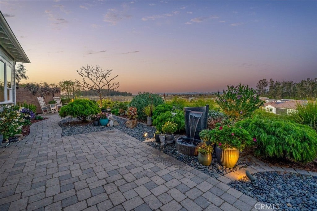Modern Ranch meets California Coastal in this exquisitely upgraded Ventana floorplan, perfectly positioned to capture sweeping views of the vineyards, the shimmering lake and fountain, and the mountain range that frames the horizon. From sunrise to sunset, the scenery becomes a stunning natural backdrop—ever changing and always captivating. The home’s exceptional curb appeal sets an immediate impression of quality. Fresh exterior paint, stone-accented retaining walls, and a beautifully designed paver courtyard with a tranquil fountain create a welcoming entry that reflects the care and attention invested throughout the property. Inside, the chef’s kitchen features stylish white cabinetry with premium hardware, quartzite slab countertops, a generous island, a built-in refrigerator, and stainless appliances with a sleek range hood. The kitchen opens seamlessly to the great room, where a dramatic floor-to-ceiling stacked-stone fireplace adds warmth and architectural presence. Professionally designed interiors elevate every room. Automatic window treatments, plantation shutters, oak hardwood floors, and wallpaper-accented rooms create a sophisticated aesthetic. The optimized Smart-Space laundry room enhances convenience with custom cabinetry, a sink, and a built-in desk area along with a bay of cabinets in the garage for added storage. The outdoor living experience is a true highlight of this home. The covered patio functions as an additional living room, offering year-round comfort with a drop-down shade and generous space for dining or lounging. Beyond, paver pathways lead to a peaceful sitting area with built-in firepit overlooking the lake and fountain—an ideal vantage point to enjoy the reflection of the sun on the water and the dramatic silhouette of the mountains as the sky shifts throughout the day.