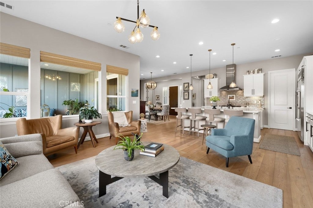 Modern Ranch meets California Coastal in this exquisitely upgraded Ventana floorplan, perfectly positioned to capture sweeping views of the vineyards, the shimmering lake and fountain, and the mountain range that frames the horizon. From sunrise to sunset, the scenery becomes a stunning natural backdrop—ever changing and always captivating. The home’s exceptional curb appeal sets an immediate impression of quality. Fresh exterior paint, stone-accented retaining walls, and a beautifully designed paver courtyard with a tranquil fountain create a welcoming entry that reflects the care and attention invested throughout the property. Inside, the chef’s kitchen features stylish white cabinetry with premium hardware, quartzite slab countertops, a generous island, a built-in refrigerator, and stainless appliances with a sleek range hood. The kitchen opens seamlessly to the great room, where a dramatic floor-to-ceiling stacked-stone fireplace adds warmth and architectural presence. Professionally designed interiors elevate every room. Automatic window treatments, plantation shutters, oak hardwood floors, and wallpaper-accented rooms create a sophisticated aesthetic. The optimized Smart-Space laundry room enhances convenience with custom cabinetry, a sink, and a built-in desk area along with a bay of cabinets in the garage for added storage. The outdoor living experience is a true highlight of this home. The covered patio functions as an additional living room, offering year-round comfort with a drop-down shade and generous space for dining or lounging. Beyond, paver pathways lead to a peaceful sitting area with built-in firepit overlooking the lake and fountain—an ideal vantage point to enjoy the reflection of the sun on the water and the dramatic silhouette of the mountains as the sky shifts throughout the day.