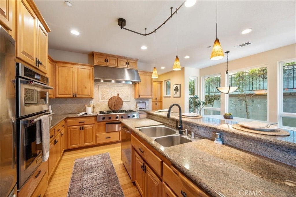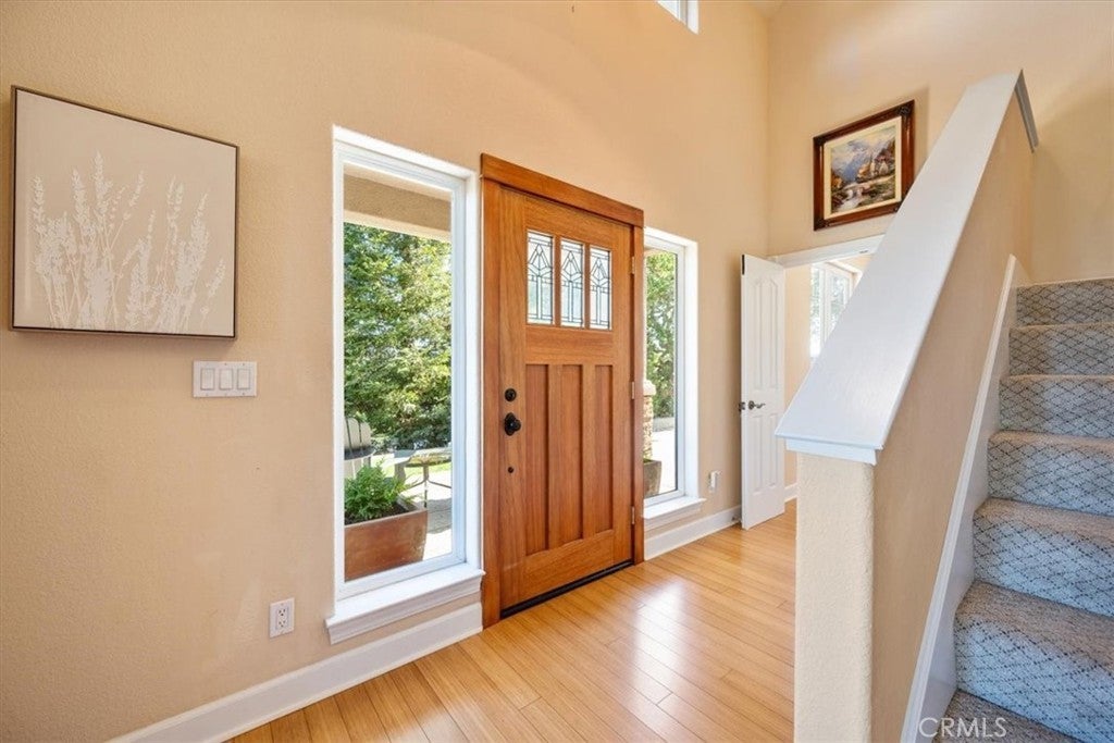 Nestled up a long and private driveway in a secluded hillside location, this custom-built residence offers a sophisticated blend of luxury and comfort, defined by quality finishes and thoughtful design. The interior welcomes you with soaring ceilings and rich bamboo flooring that leads to a gourmet kitchen equipped with premium Dacor appliances, granite countertops, and a dedicated wine cooler. The inviting stone fireplace serves as the centerpiece of the living area, while the expansive primary suite provides a private sanctuary featuring panoramic city and valley views and a spa-like bathroom with a jetted tub and bidet. The exterior is equally impressive, boasting professional landscaping and oak-studded patios equipped with two built-in barbecues, making it an ideal setting for outdoor entertaining. Complete with a versatile detached studio perfect for a home office, craft room or gym, as well as a fully owned solar system for modern efficiency, this remarkable home is conveniently close to schools, services, freeway access and beaches.