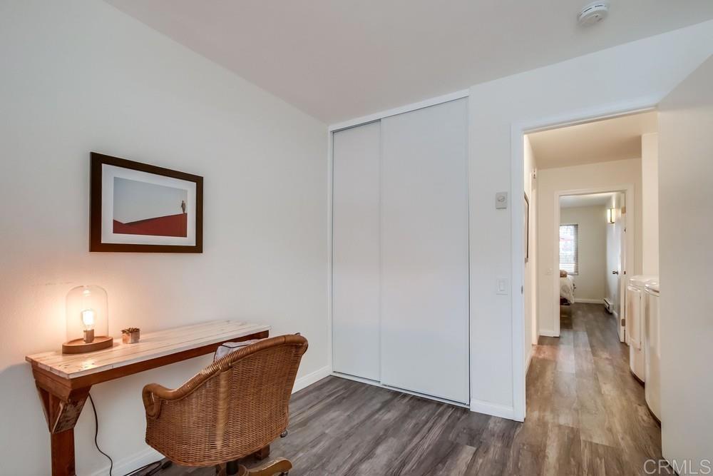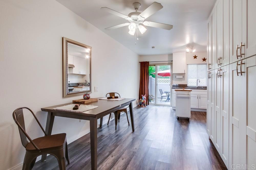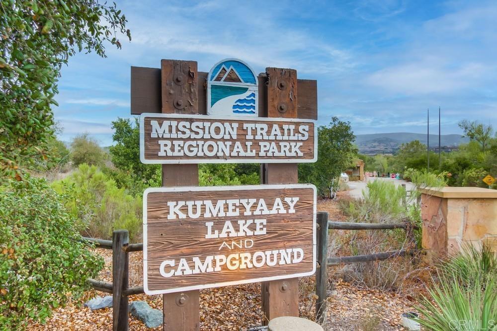 Mission Trails Regional Park and Kumeyaay Lake are outside your front door with this updated single-level condo in Sunset Greens. Very dog friendly! With no neighbors above or below, this home is quiet, private, and serene. Outdoor enjoyment is the priority here with a front porch and spacious rear patio with brand new premium lattice fencing with keyed lock and newer pavers. Updates included upgraded electrical panel, vinyl wood flooring, new tile in bathroom, and premium blinds. Full sized washer and dryer come with the property. HOA includes water, trash, outside maintenance, beautiful pool, and limited insurance. Two parking spaces are located directly behind your private patio with lots of guest parking throughout. This location is tucked away perfectly between Santee, Mission Gorge, and San Carlos - freeways, shopping, and dining are close by. This is truly a neighborhood like no other that reminds you what San Diego outdoor living is all about!