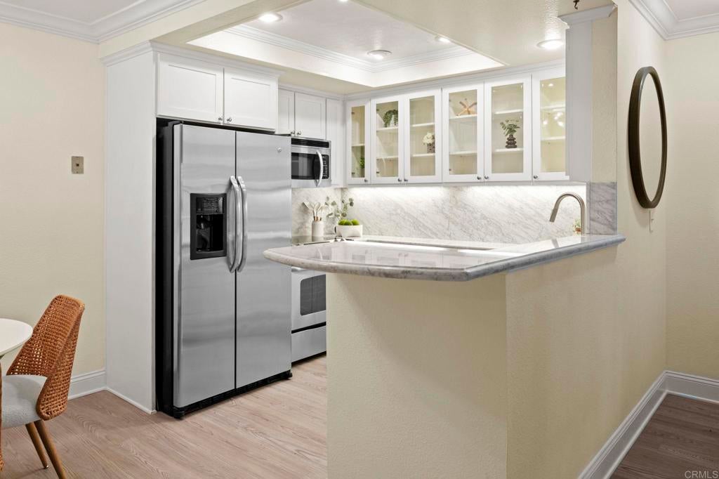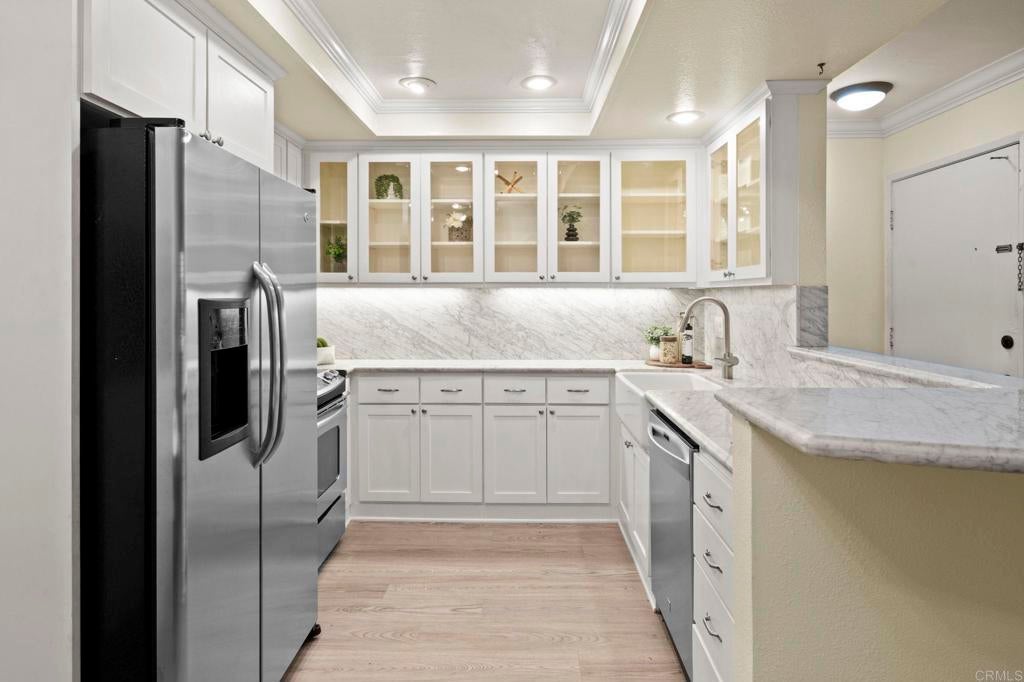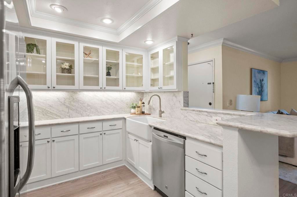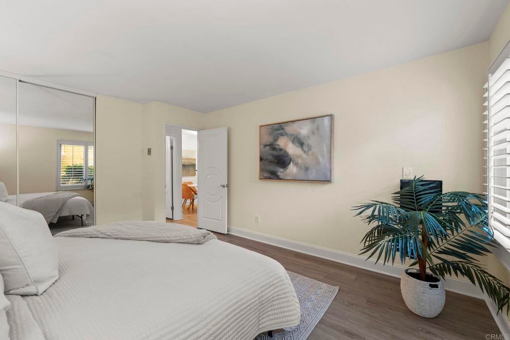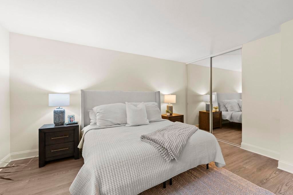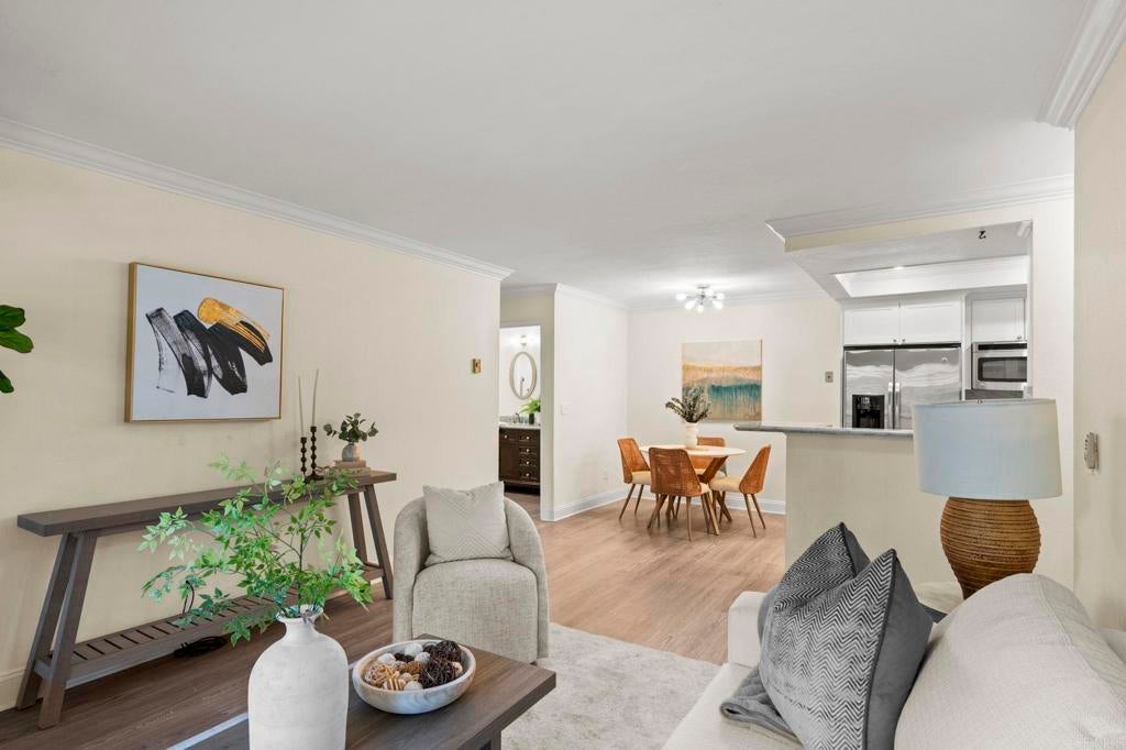 Discover the perfect home for first-time buyers or those looking to right-size at 6006 Rancho Mission Rd, San Diego, CA 92108. This charming 604-square-foot, 1-bedroom, 1-bathroom first-floor condo is nestled in the heart of Mission Valley, offering unmatched convenience and a vibrant lifestyle. Minutes from the Trolley, Snapdragon Stadium, 24-Hour Fitness, Fashion and Mission Valley malls, and the historic San Diego Mission, it's surrounded by diverse restaurants, entertainment, and shopping. Enjoy proximity to SDSU, Mission Trails hiking, Lake Murray, and beautiful beaches just 15 minutes away, with seamless freeway access. Inside, modern elegance shines with luxury wood-like flooring flowing through the living room, kitchen, and bedroom, plus sleek tile in the bathroom. Plantation-style shutters add style and insulation for year-round comfort. The updated kitchen boasts shaker cabinetry with glass accents, quartz countertops, a chic backsplash, and stainless-steel appliances including a stove, refrigerator, and dishwasher. The bright primary bedroom features a large wardrobe closet with mirrored doors, and a welcoming vibe. The hallway bathroom includes a dual vanity, large marble tile, and an oversized step-in shower with a seat, safety bars, and adjustable shower fixtures. Step out to your private covered patio with storage, ideal for morning coffee or evening nightcaps. This VA-approved complex offers resort-style perks: two pools, two spas, fitness center, tennis courts, BBQ areas, clubhouse, and laundry room. Includes one reserved parking spot and guest parking. Blending modern comforts, thoughtful upgrades, and an amenity-rich community, this condo is an exceptional opportunity in a highly sought-after San Diego location. Ideal for convenience, style, and vibrant living!