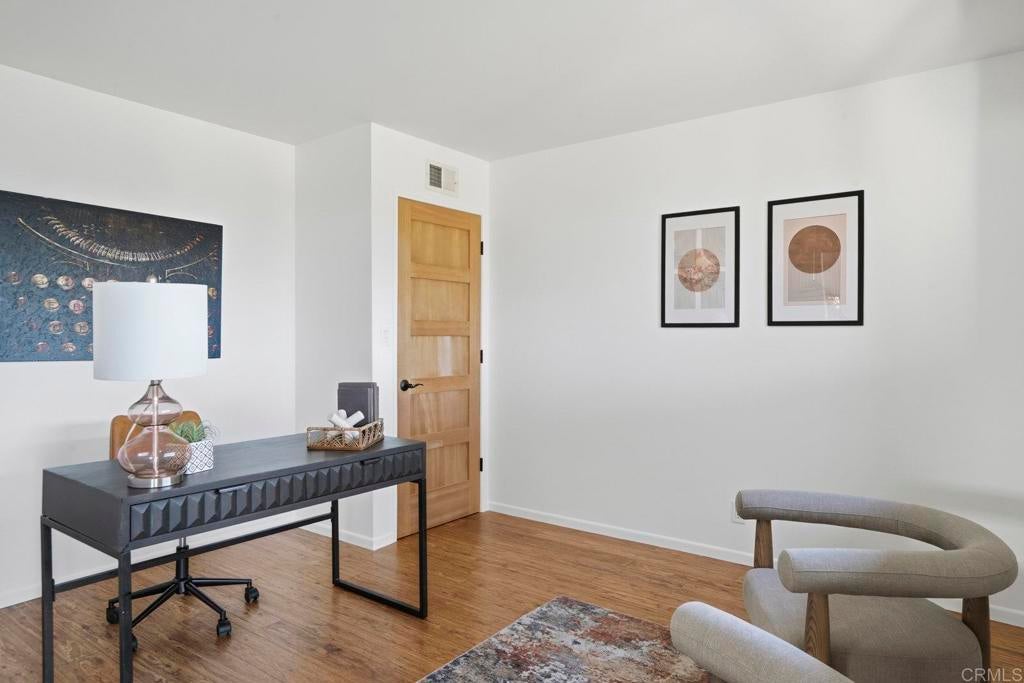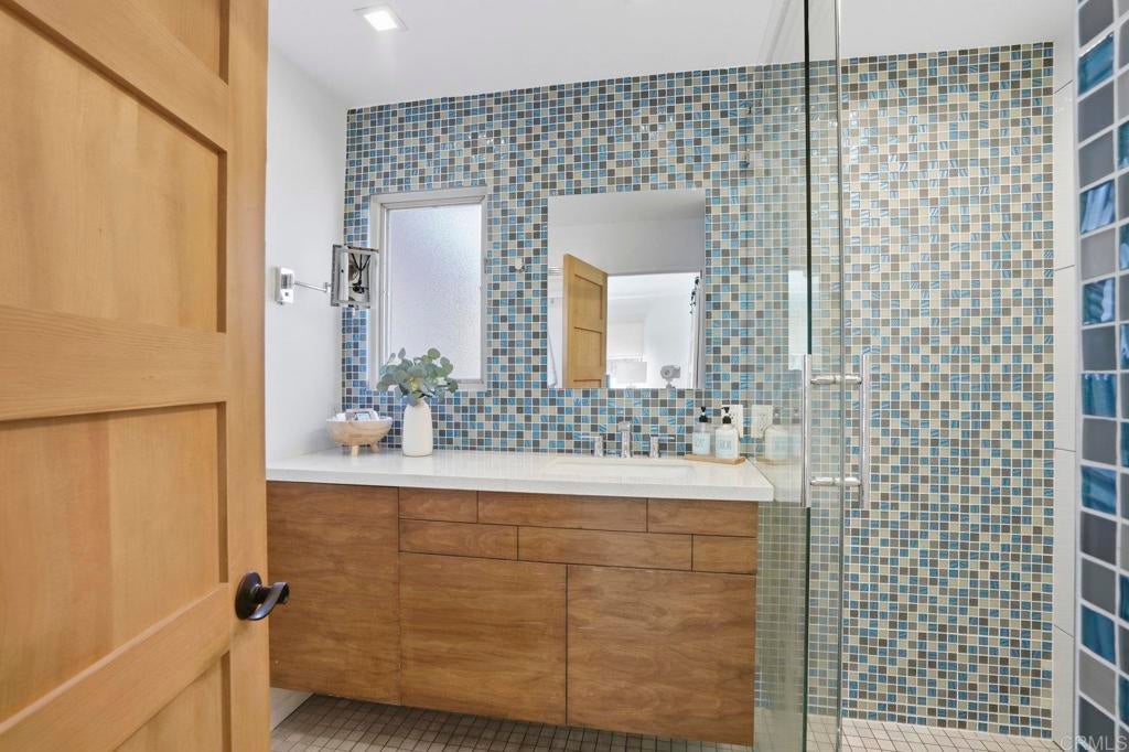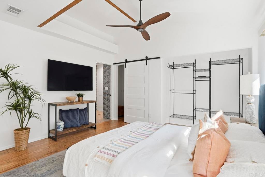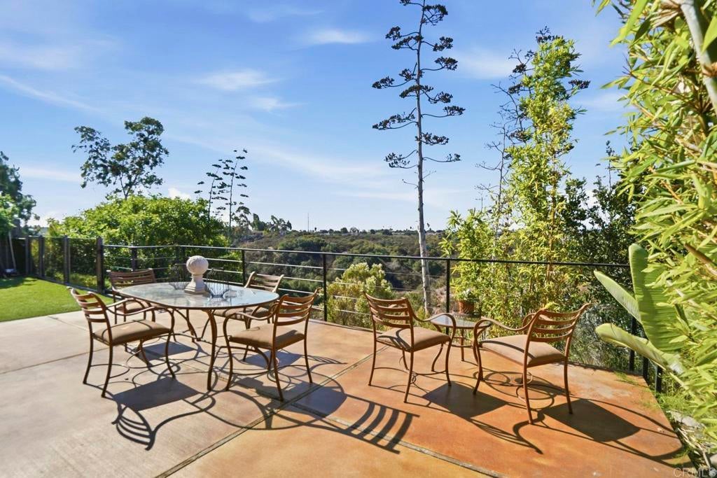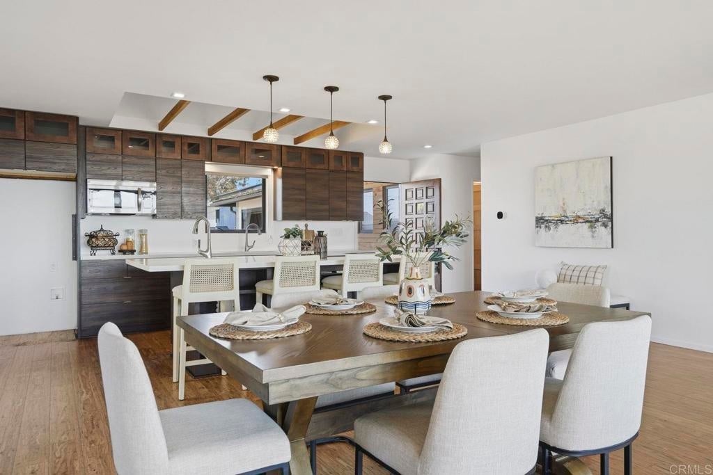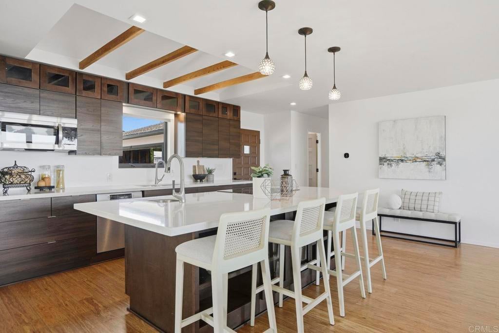 Experience stunning panoramic canyon and sunset views from both the back patio and living room of this North Clairemont canyon rim residence. Enter through the front door to an impressive open concept living room and kitchen that seamlessly connects to the backyard via a collapsible wall-to-wall folding door system. The property features convenient upgrades, including owned solar panels with Tesla Powerwall, tankless water heater, updated wiring and electric panel, engineered eucalyptus hardwood flooring, and a newer roof. The kitchen offers elegant dark wood cabinetry for ample storage, stainless steel appliances, quartz countertops, a spacious island with sink, and a breakfast bar. Exposed beams throughout the home add distinctive character to the living spaces. Additional enhancements include remodeled bathrooms and vaulted ceilings in the living room and primary bedroom.