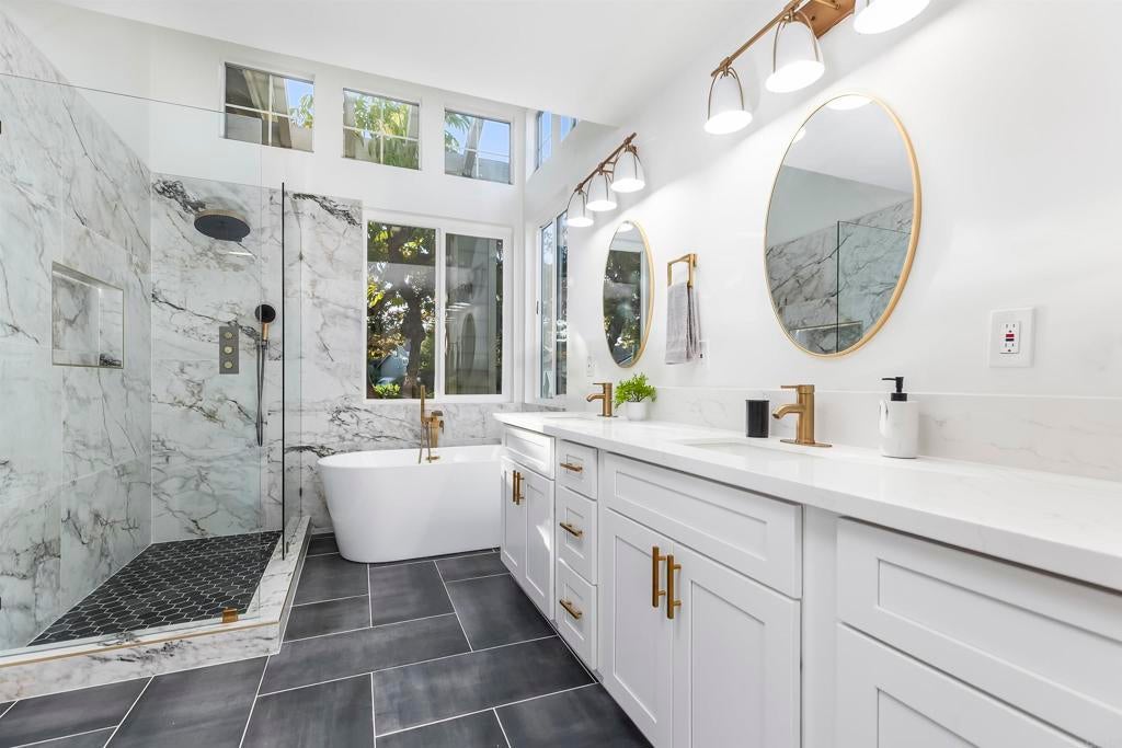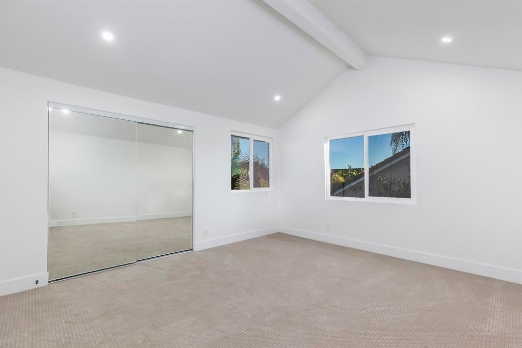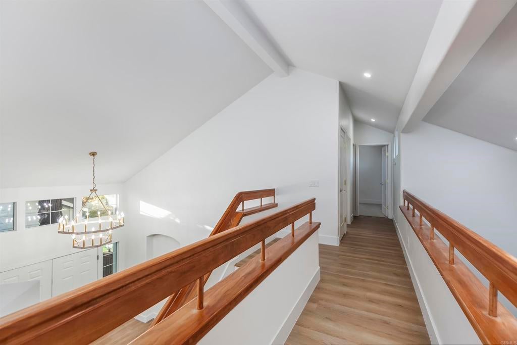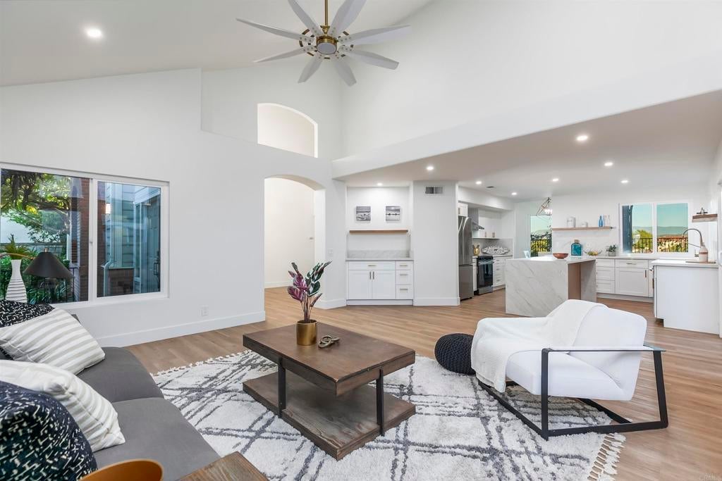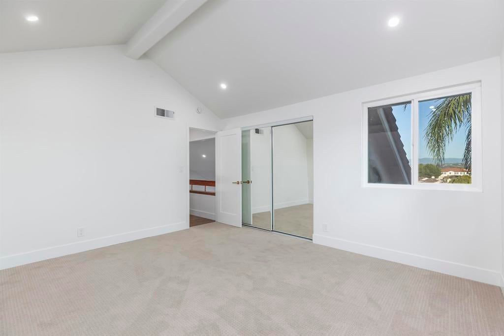Beautifully remodeled home in a quiet and well-maintained Oceanside community, featuring modern finishes, an ideal floor plan, and impressive architectural details throughout. The home welcomes you with vaulted ceilings in both the living room and family room, creating an open and spacious feel the moment you enter. The newly redesigned kitchen offers quartz countertops, white shaker cabinetry, stainless steel appliances, and upgraded fixtures, blending style and functionality. The primary suite is located on the first floor and features vaulted ceilings, a large layout, and a resort-style bathroom with designer tile and a walk-in shower. An additional downstairs bedroom provides flexibility for guests, multi-generational living, home office, or nursery. Upstairs offers two more bedrooms and a fully upgraded bathroom, giving the home a total of four bedrooms with excellent separation of space. All three bathrooms in the home have been tastefully remodeled with modern finishes. Additional upgrades include dual-pane windows, luxury flooring, updated lighting, and a fresh interior design throughout. The community is peaceful and conveniently located near Guajome Regional Park, walking and biking trails, shopping, restaurants, schools, and just a short drive to Oceanside beaches and the harbor. This move-in ready home combines quality renovations, a highly functional layout with two bedrooms downstairs, and a desirable location close to outdoor recreation and everyday conveniences.