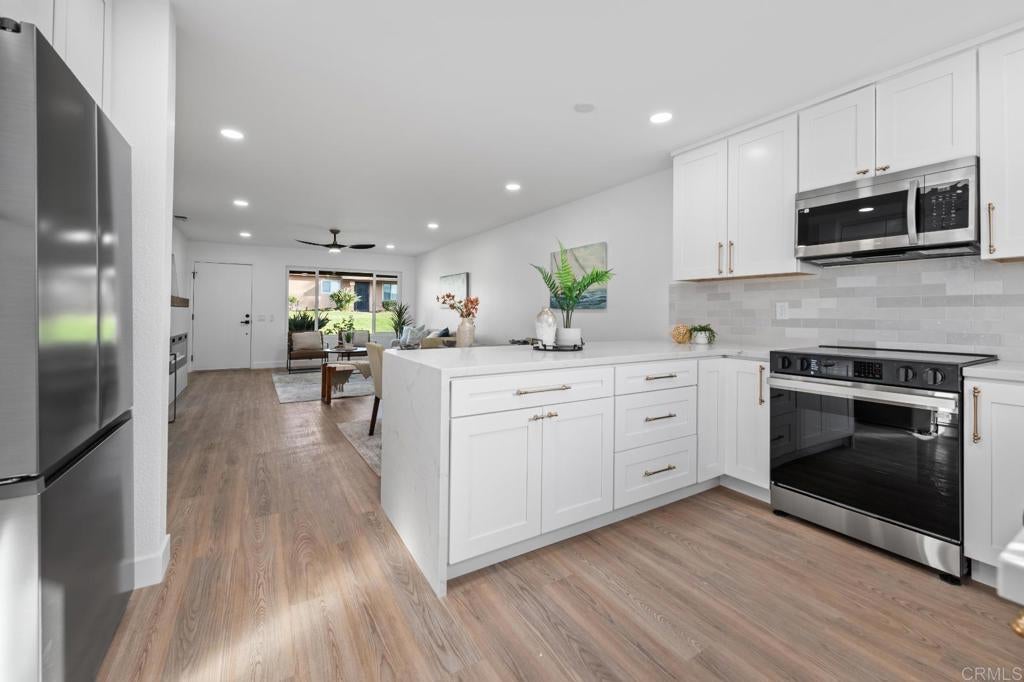 Beautifully renovated single-story condo located in the desirable 55+ Oceana mission II community in Oceanside. This move-in-ready home features 2 bedrooms and 2 fully remodeled bathrooms with brand-new finishes throughout, creating a clean and modern feel. The home includes a brand-new energy-efficient HVAC system, a fully updated kitchen with new cabinetry, countertops, backsplash, and stainless steel appliances, as well as tastefully remodeled bathrooms with contemporary vanities and fixtures. Enjoy the warmth and charm of the fireplace along with a private patio ideal for relaxing and enjoying the coastal climate. The garage provides convenient parking and additional storage. Residents of Oceana enjoy access to community amenities including a pool, clubhouse, and beautifully maintained grounds. Ideally located just minutes from shopping, dining, Oceanside Harbor, local beaches, and easy freeway access, this home offers low-maintenance, resort-style living in one of Oceanside’s most sought-after communities.