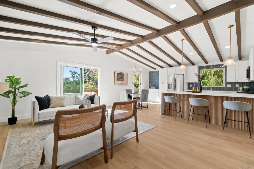 Completely reimagined Rolando Village home featuring beautiful views, designer finishes, and modern open living. This fully renovated 4-bedroom, 2-bathroom residence offers 1,489 sq ft of bright, thoughtfully designed space with dramatic exposed beam ceilings and wide plank flooring throughout. The stunning kitchen serves as the centerpiece of the home with quartz countertops, custom cabinetry, stylish tile backsplash, and a large island perfect for entertaining. The open living space flows seamlessly to an expansive deck where you can relax and enjoy elevated neighborhood and hillside views. Both bathrooms have been completely upgraded with custom tile, modern fixtures, and a spa-inspired primary bath with dual vanities and a walk-in glass shower. Located in the highly sought-after Rolando Village neighborhood, just minutes from SDSU, parks, restaurants, and freeway access, this turnkey home offers the perfect blend of modern design, comfort, and location.