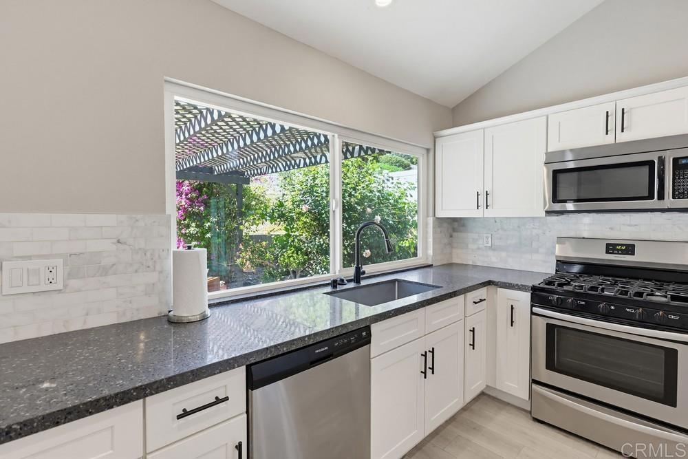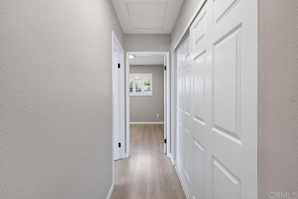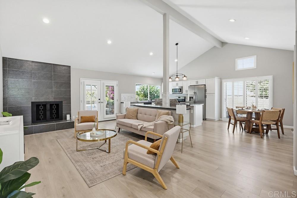 Beautifully remodeled single-story home in the highly desirable San Carlos neighborhood, showcasing thoughtful upgrades, modern finishes, and exceptional functionality throughout. The open-concept floor plan seamlessly connects the kitchen, family, and dining areas, creating an ideal space for both everyday living and entertaining. The home features high ceilings, abundant natural light, recessed lighting, a tile fireplace, laminate wood flooring, and dual-pane windows and doors. The upgraded kitchen is designed to impress with quartz countertops, ample cabinetry, stainless steel appliances, and two oversized islands—perfect for hosting and gathering. Both bathrooms have been tastefully remodeled with updated vanities and custom tile work. Additional interior upgrades include a fully insulated garage with finished flooring, plantation shutters throughout, and a whole-house water softener system. The exterior has been equally enhanced with vinyl fencing, upgraded landscaping, and poured concrete along the sides of the home for clean, low-maintenance functionality. The front and backyard feature artificial turf, and the covered patio provides a great space to relax or entertain outdoors. The home also includes central heat and A/C, along with an upgraded 200-amp electrical panel that is pre-plumbed for solar and battery backup. Ideally located near shopping, dining, Mission Trails Regional Park, and Lake Murray, this home offers a perfect balance of comfort, upgrades, and convenience.