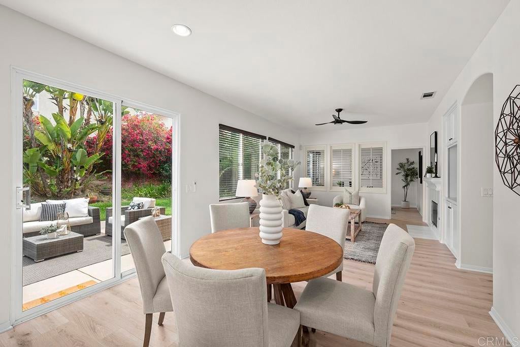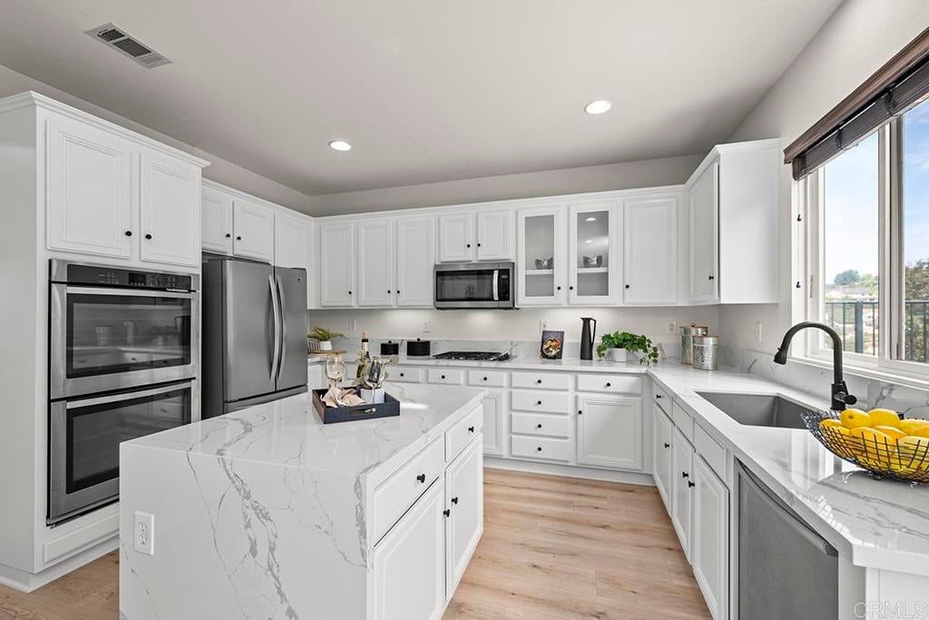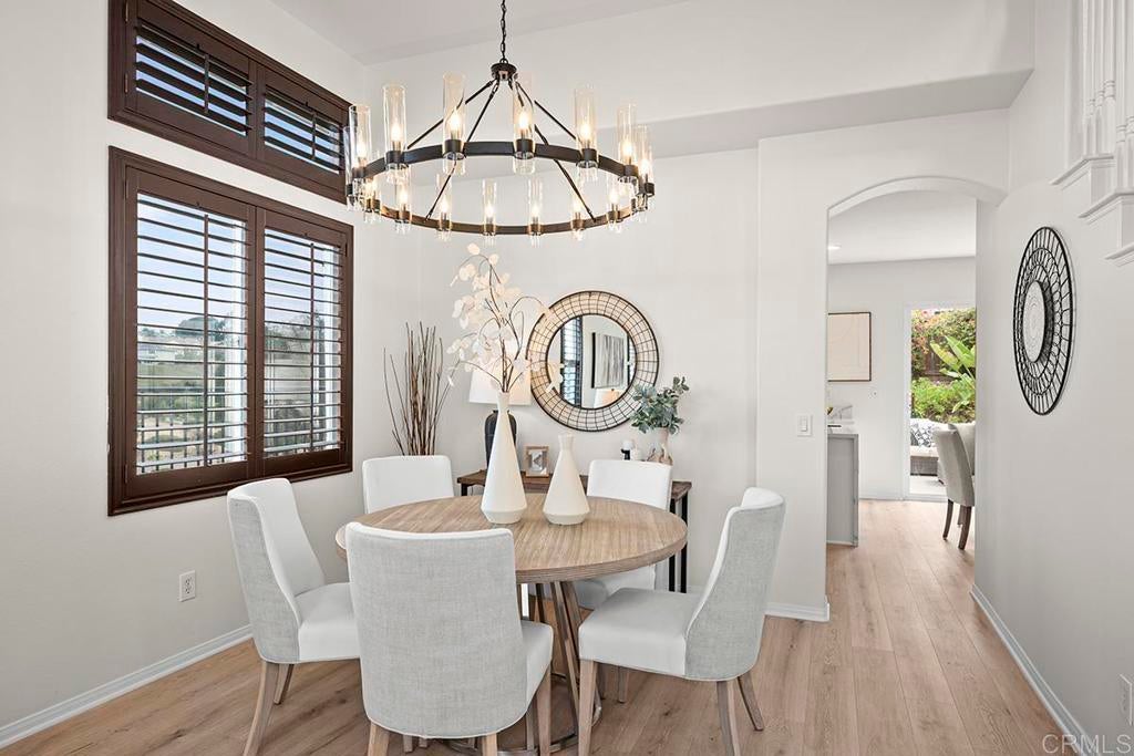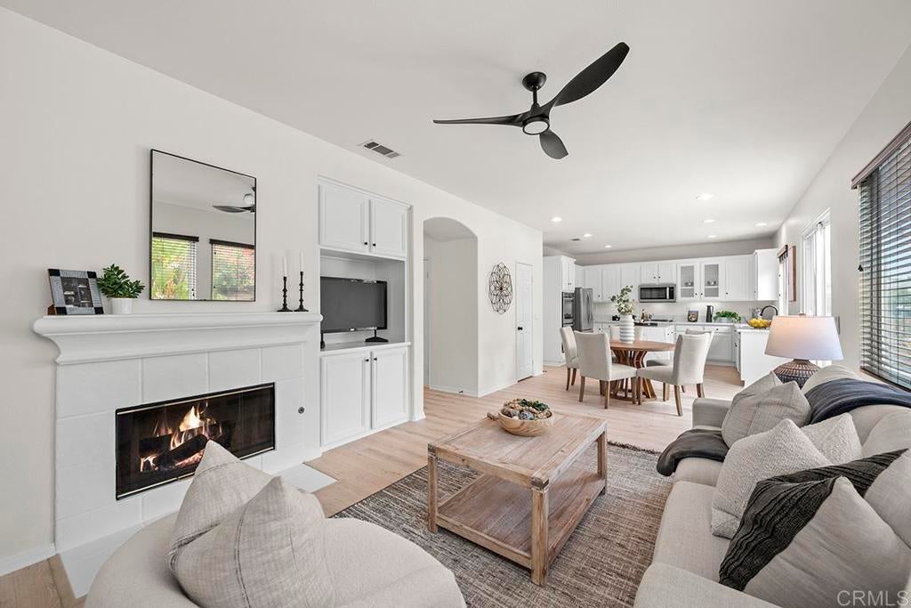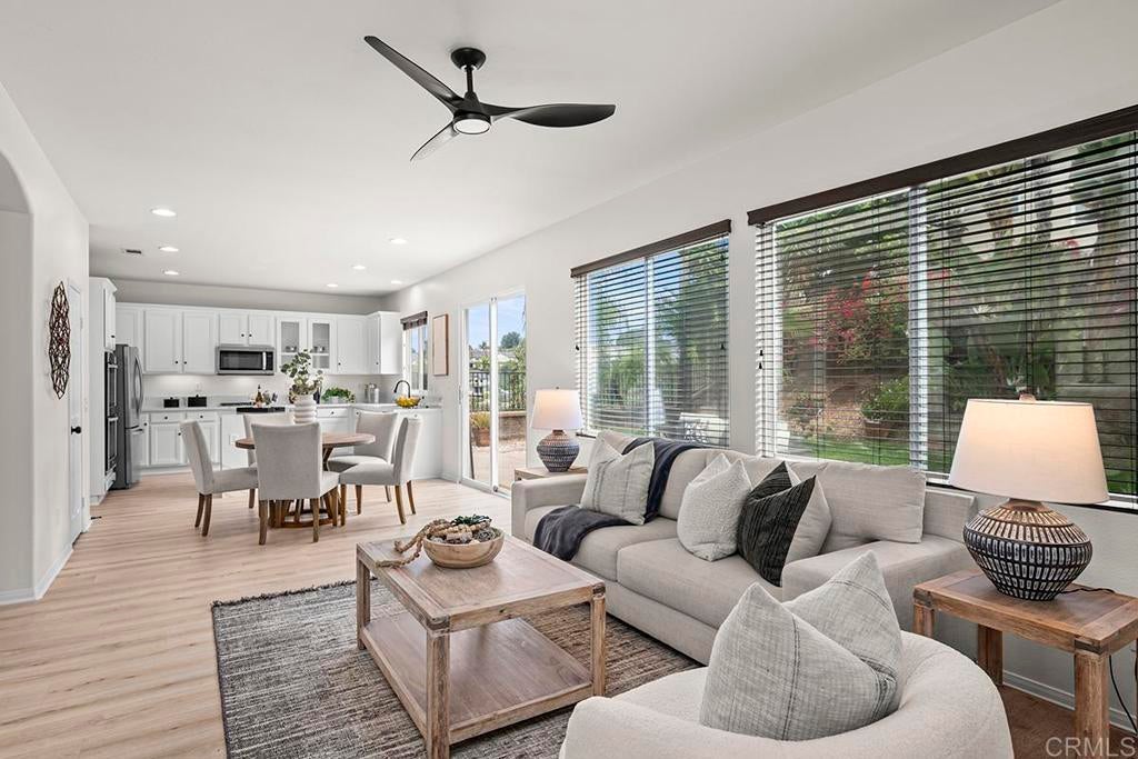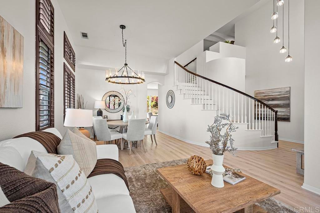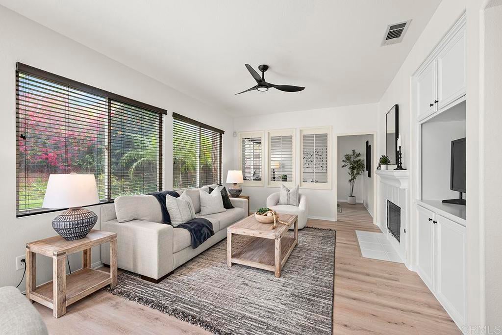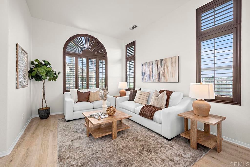 Exquisite move-in ready residence in the highly sought-after Otay Ranch Community ideally situated on a cul-de-sac with panoramic views and paid solar panels This beautifully upgraded home offers formal living room, dining room, 4 bedrooms plus office, 2.5 bathrooms and approximately 2,138 sq.ft. of sophitiscated living space. Thoughfully designed with elegance and comfort in mind, the home showcase fresh interior paint, stunning waterproof vinyl flooring throughout and customs wood shutters. The gourmet kitchen features white cabinetry, quartz counter tops, a center island and walk in pantry. A charming breakfast area and expansive family room with fireplace create the perfect setting for both everyday living and upscale entertaining. Designer light fixtures throughout enhance the home's modern aesthetic. An open concept lay out fill with natural light highlights scenic mountain views creating a serene and inviting ambiance. The luxurious primary suite offers a peaceful retreat. Spacious primary bathroom with walk in closet. Step outside to a beautiful landscaped backyard design for effortless entertaining and relaxation. Ideally located near top rated shools, parks, shopping and dining, this exceptional home seamlessly blendd style, comfort and convenience. Low Home Owner Fees and Mello Roos.