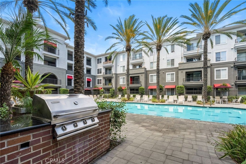 This gorgeous 1-bedroom condo is a must see! Enjoy an impressive collection of resort-style amenities, including a pool and spa, sauna, modern fitness center, clubhouse, outdoor lounge areas with fire pits, and beautifully landscaped courtyards & more. This bright and stylish one-bedroom, one-bath condominium is located in the heart of Anaheim’s sought-after Platinum Triangle and offers an open-concept layout with a spacious living and dining area and a private balcony. The kitchen features granite countertops, stainless steel appliances, and ample cabinetry. The primary bedroom includes a walk-in closet and a well-appointed bathroom with convenient access from both the bedroom and entry. Additional highlights include in-unit laundry, central heating and air conditioning, a tankless water heater, and one assigned parking space located close to the unit. HOA dues provide excellent value, covering high-speed internet, building insurance, common area maintenance, and HVAC filter replacement. Secure gated access, EV charging stations, and guest parking add convenience, while the prime location places you minutes from Angel Stadium, Disneyland Resort, Honda Center, dining, shopping, and entertainment!