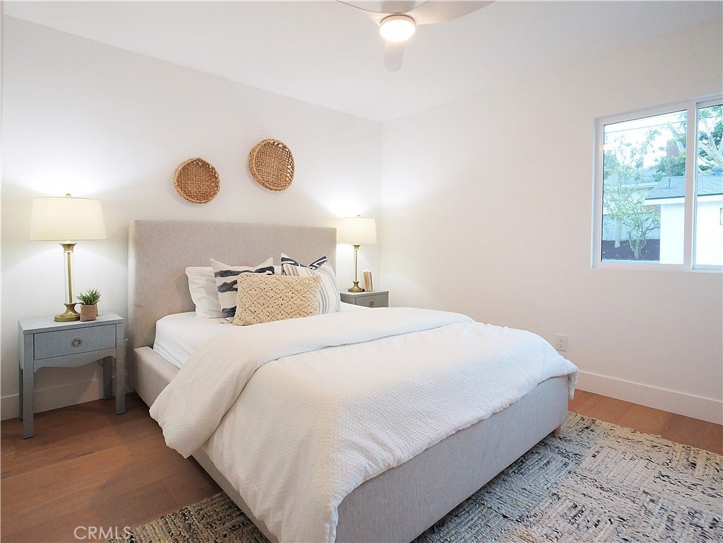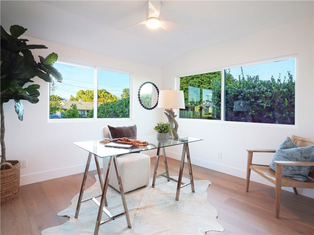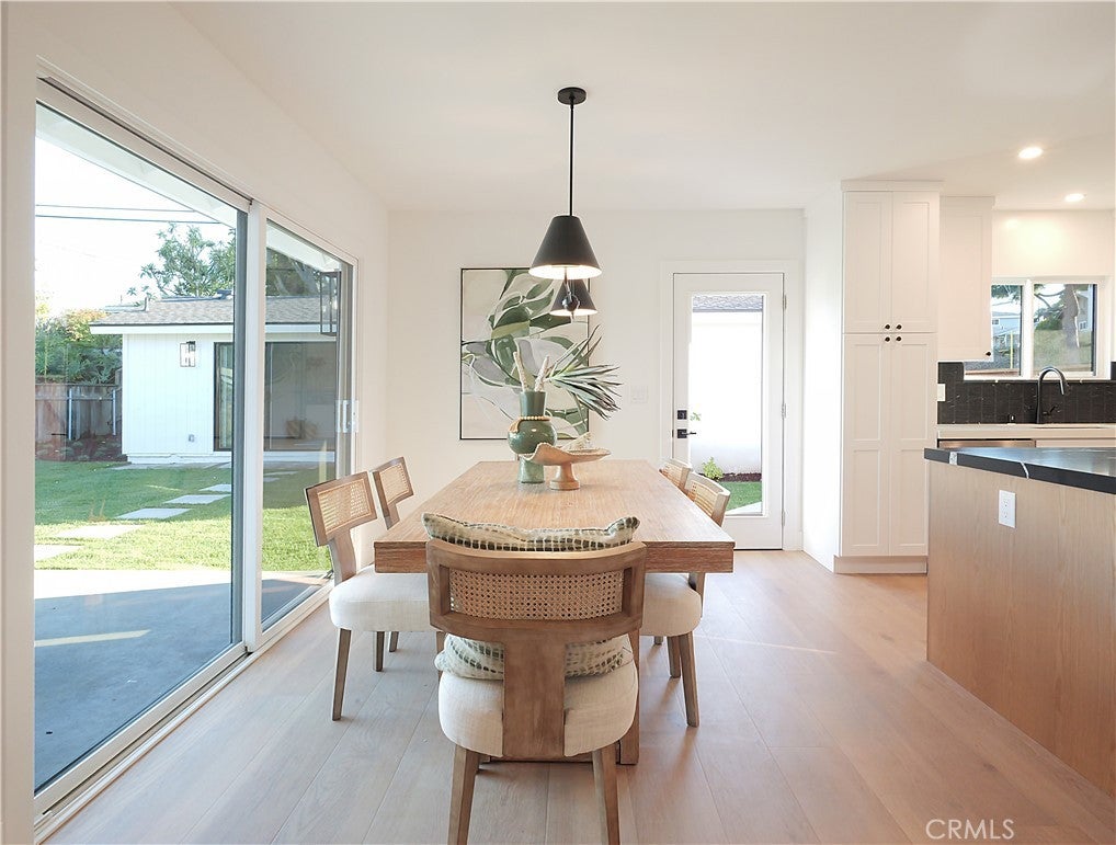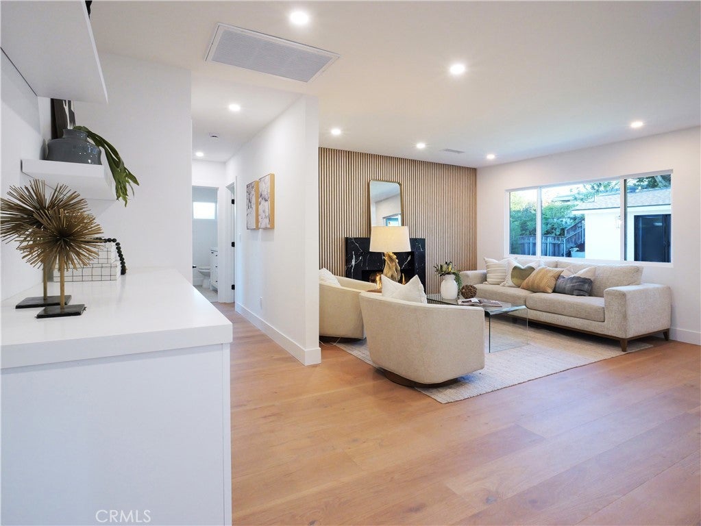 Thoughtfully reimagined with a refined contemporary sensibility, this beautifully remodeled residence offers an exceptional blend of modern design, everyday functionality, and long-term flexibility, set on a prominent corner lot in Rancho Palos Verdes. The single-level main home features four well-appointed bedrooms and two full bathrooms, designed to support both growing families and those seeking effortless, stair-free living. A light-filled open floor plan creates a natural flow between spaces, anchored by a striking marble fireplace framed by a custom slatted feature wall—an architectural focal point that adds warmth and sophistication to the living area. Wide-plank white oak flooring runs throughout, complementing the home’s clean lines and cohesive palette. The dining area overlooks the enclosed backyard, offering a seamless connection between indoor and outdoor living; ideal for both daily life and entertaining. At the heart of the home, the kitchen reflects a no-expense-spared approach, combining form and function with elevated style. A striking split-tone design pairs a wall of crisp white cabinetry with a white oak island, topped in dramatic black marble countertops. High-end appliances, including an undercounter microwave drawer, complete a space designed for both beauty and performance. The primary suite serves as a private retreat, featuring a bold black-and-white palette, contemporary lighting and fixtures, and a spa-inspired bathroom with a freestanding soaking tub—a serene space to unwind at the end of the day. Throughout the home, modern black hardware, lighting, and plumbing fixtures provide a cohesive and polished aesthetic. Enhancing the home’s versatility is a detached bonus living space, complete with a bathroom — ideal as a private home office, guest suite, flex space, or additional bedroom. This rare feature offers exceptional adaptability for today’s evolving lifestyles, from remote work to multigenerational living. Additional highlights include a two-car garage, modern low-maintenance landscaping, an enclosed backyard, and excellent curb appeal that reflects the quality and intention found throughout the home. Designed for how people live today—and how they will live tomorrow—this turnkey property offers a rare combination of architectural style, thoughtful layout, and flexible living in one of Rancho Palos Verdes’ most desirable settings.