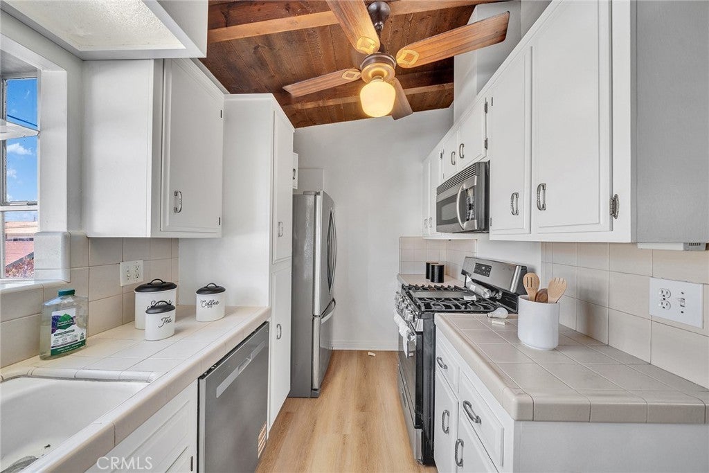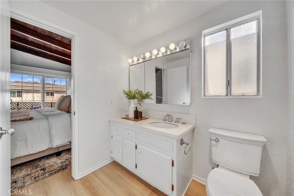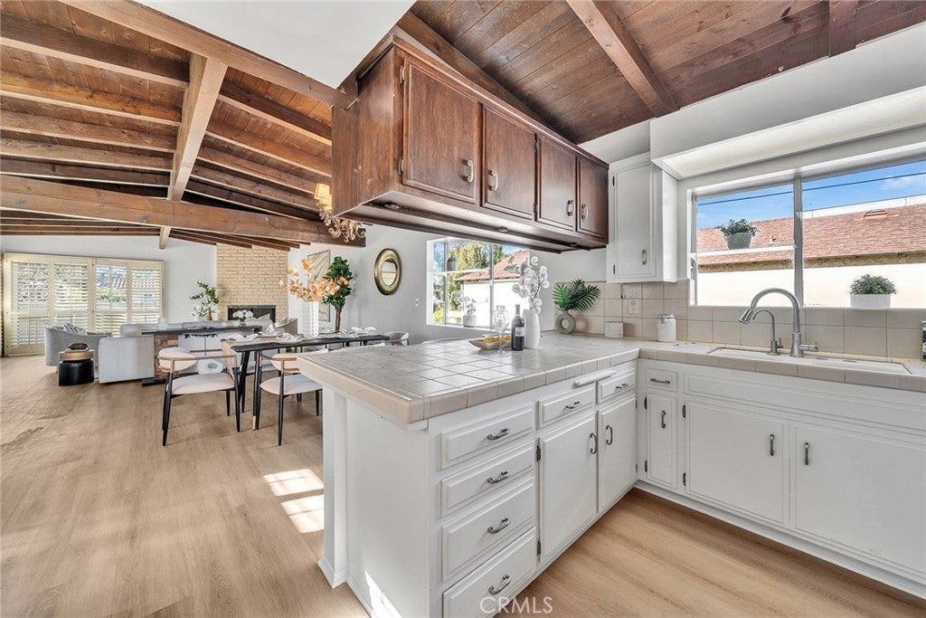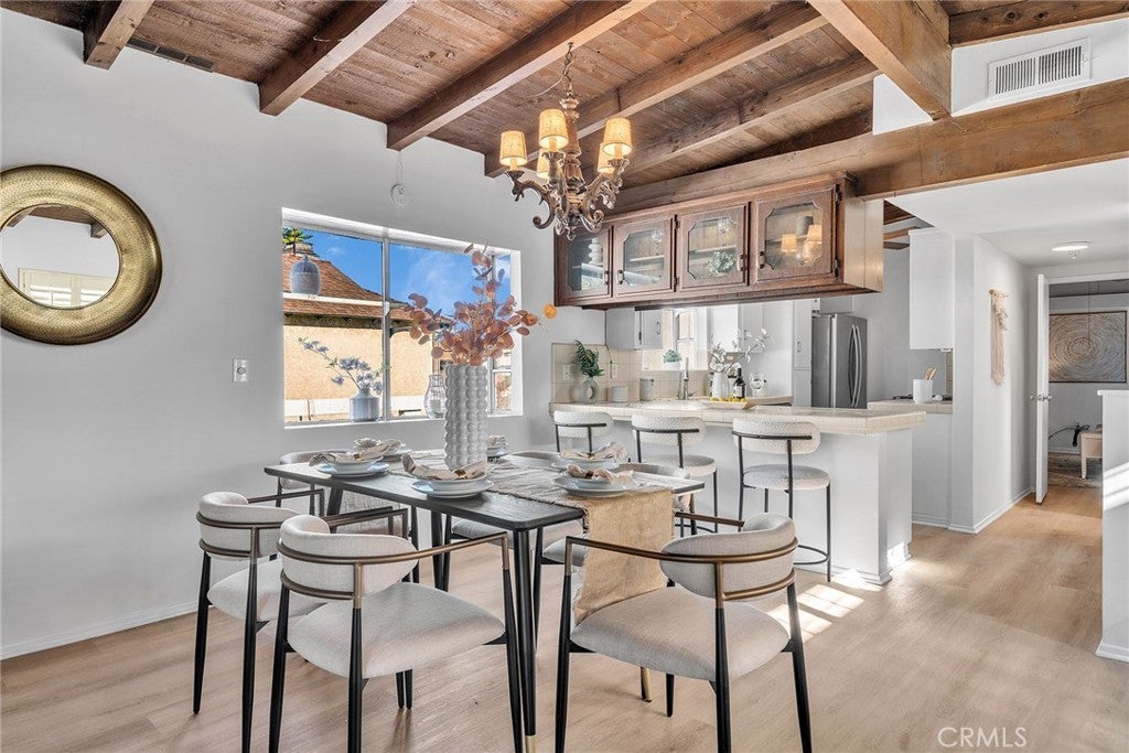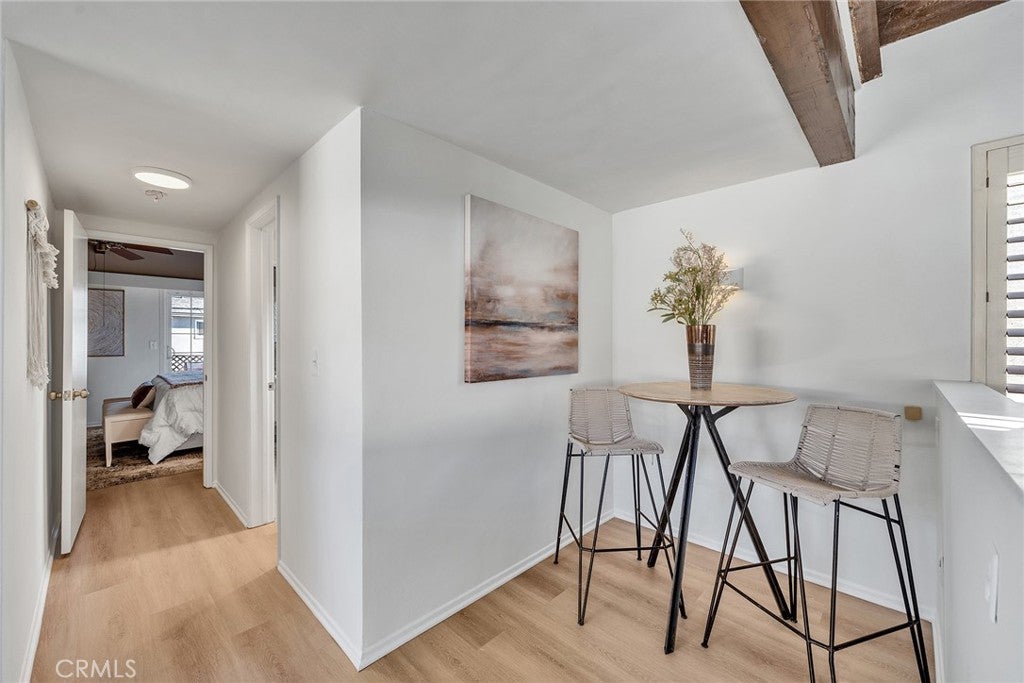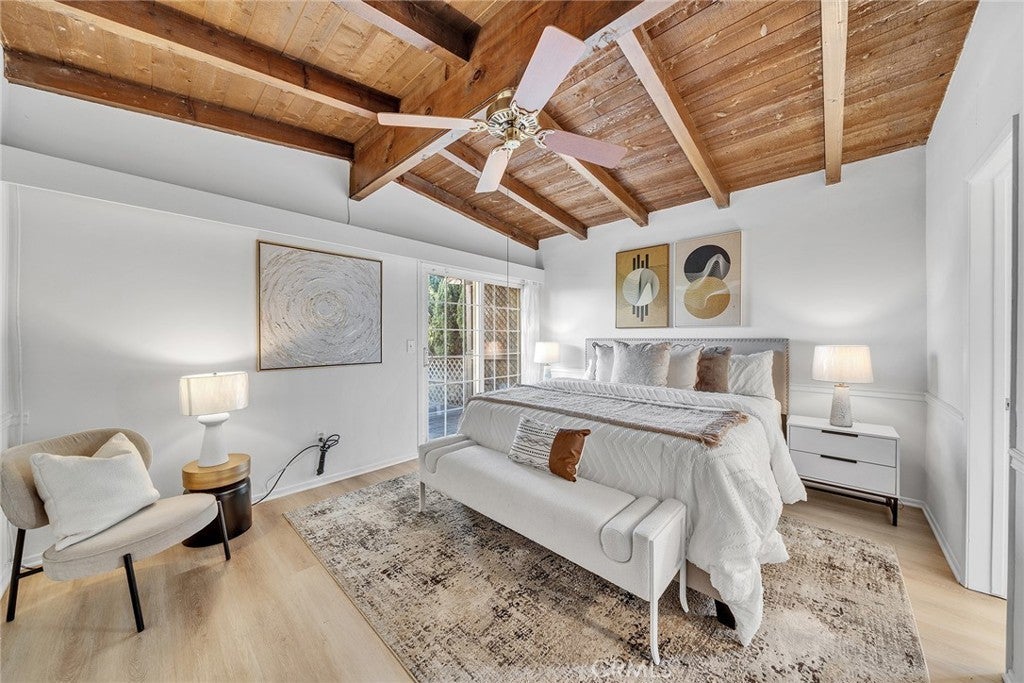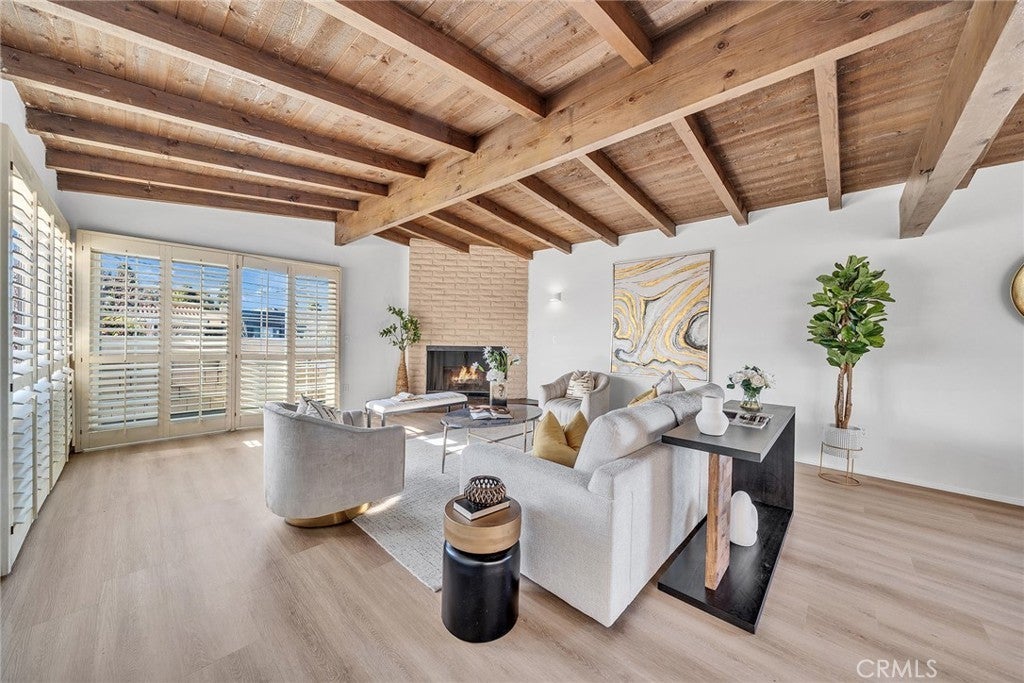 Welcome to this beautifully designed Walteria home tucked along a tree-lined street at the base of the Palos Verdes foothills where comfort, space, and indoor-outdoor living come together for the perfect Southern California lifestyle. With over 1,700 square feet of living space, this inviting two-story home offers a thoughtful layout ideal for everyday living and entertaining. The entry level features two spacious bedrooms, a full bath with quartz counters, convenient laundry, and a versatile bonus/storage room — perfect for hobbies, organization, or future customization. Upstairs, the home opens into a light-filled living space highlighted by dramatic wood beam ceilings, a cozy fireplace, plantation shutters, and a balcony overlooking the charming neighborhood. The adjacent dining area easily accommodates large gatherings, while the kitchen connects to a flexible nook that can serve as an office, play area, or creative workspace. The primary suite feels like a private retreat, featuring matching beamed ceilings and direct access to an expansive deck — an ideal setting for morning coffee, sunset dinners, or simply unwinding outdoors. A dual-access bathroom connects both the primary bedroom and living space for added functionality. Step outside and discover a backyard sanctuary filled with greenery, shaded lounging areas, and sunny open spaces. Stairs lead from the deck down to the yard, creating seamless indoor-outdoor flow perfect for entertaining or relaxing in your own private escape. Additional highlights include a direct-access two-car garage with driveway parking and location within the highly regarded Torrance school district. This home blends warmth, character, and lifestyle in one of Walteria’s most desirable neighborhoods — a place where everyday living feels just a little more special.