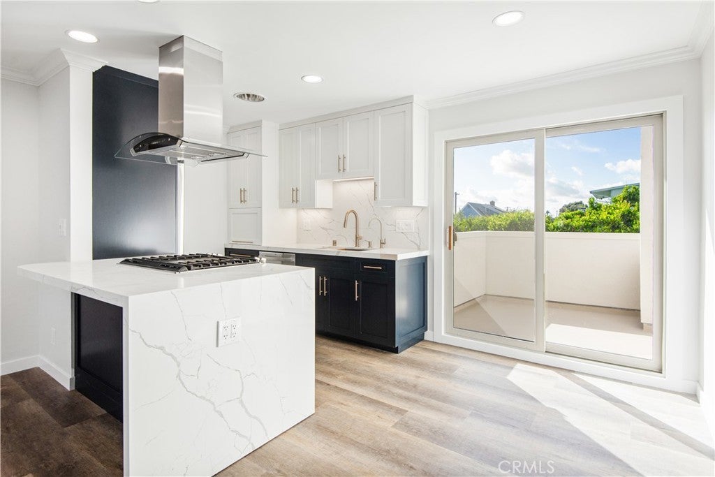 **Little Jewel **2bedroom 1Bathroom completely remodeled 2nd floor unit. Custom Quartz countertop Kitchen comes with all built-in appliances and self-closing cabinets. Private Ample size balcony with a Catalina Island view! Custom built bathroom cabinets and bathroom vanity with top of the line fixtures and state of the art shower stall with bench. The photos will say everything about this rare unit filled with amenities and new waterproof floors, baseboards and ceiling crown Moulding. Brand new multi split air & heat unit in each living area and each bedroom for efficient use and saving in utilities. Quality brand new refrigerator and gas stove with high end vent system. All bedrooms come with custom closet with built in shelves in each closet.Private 1 car garage included with this unit.